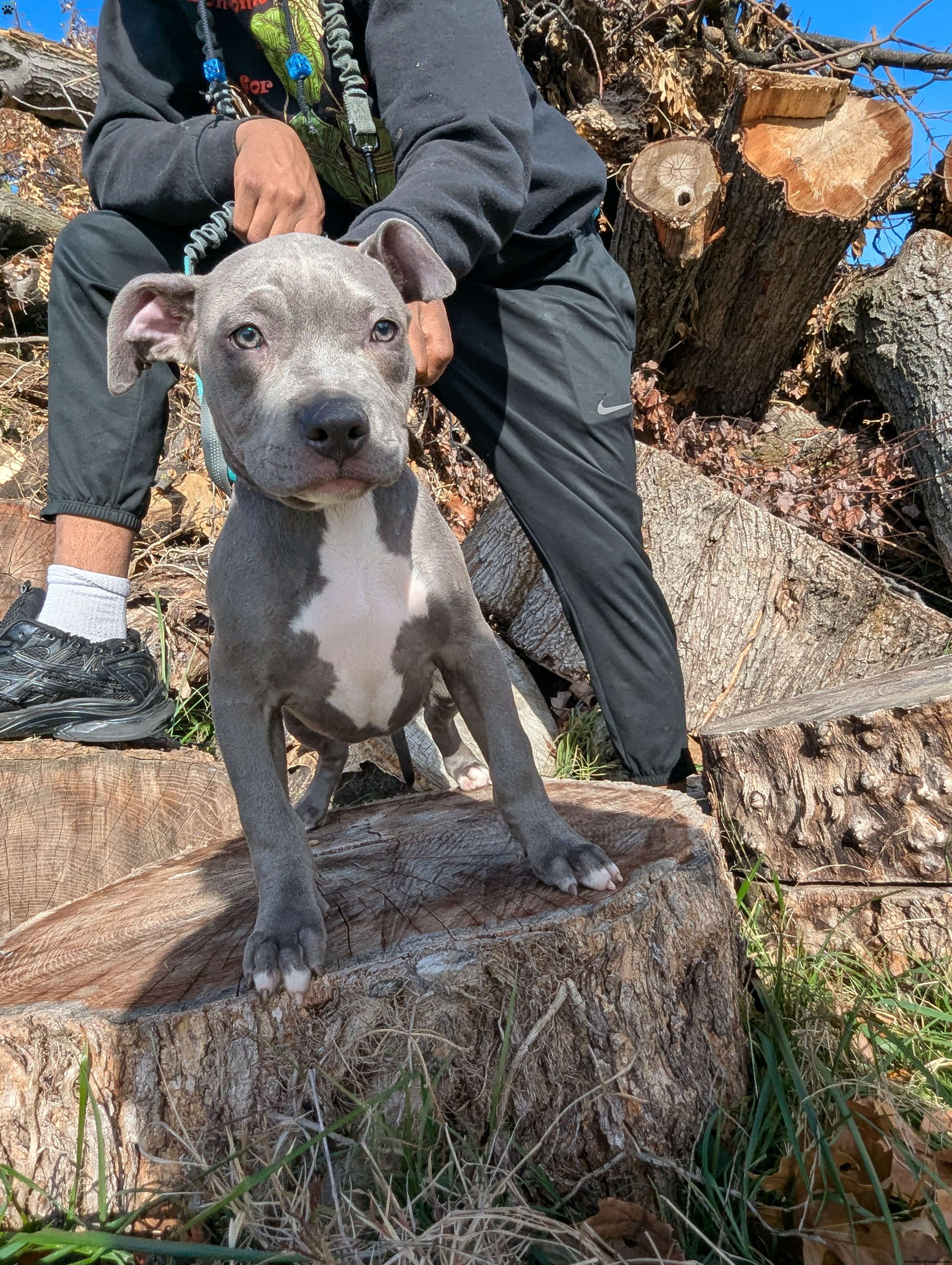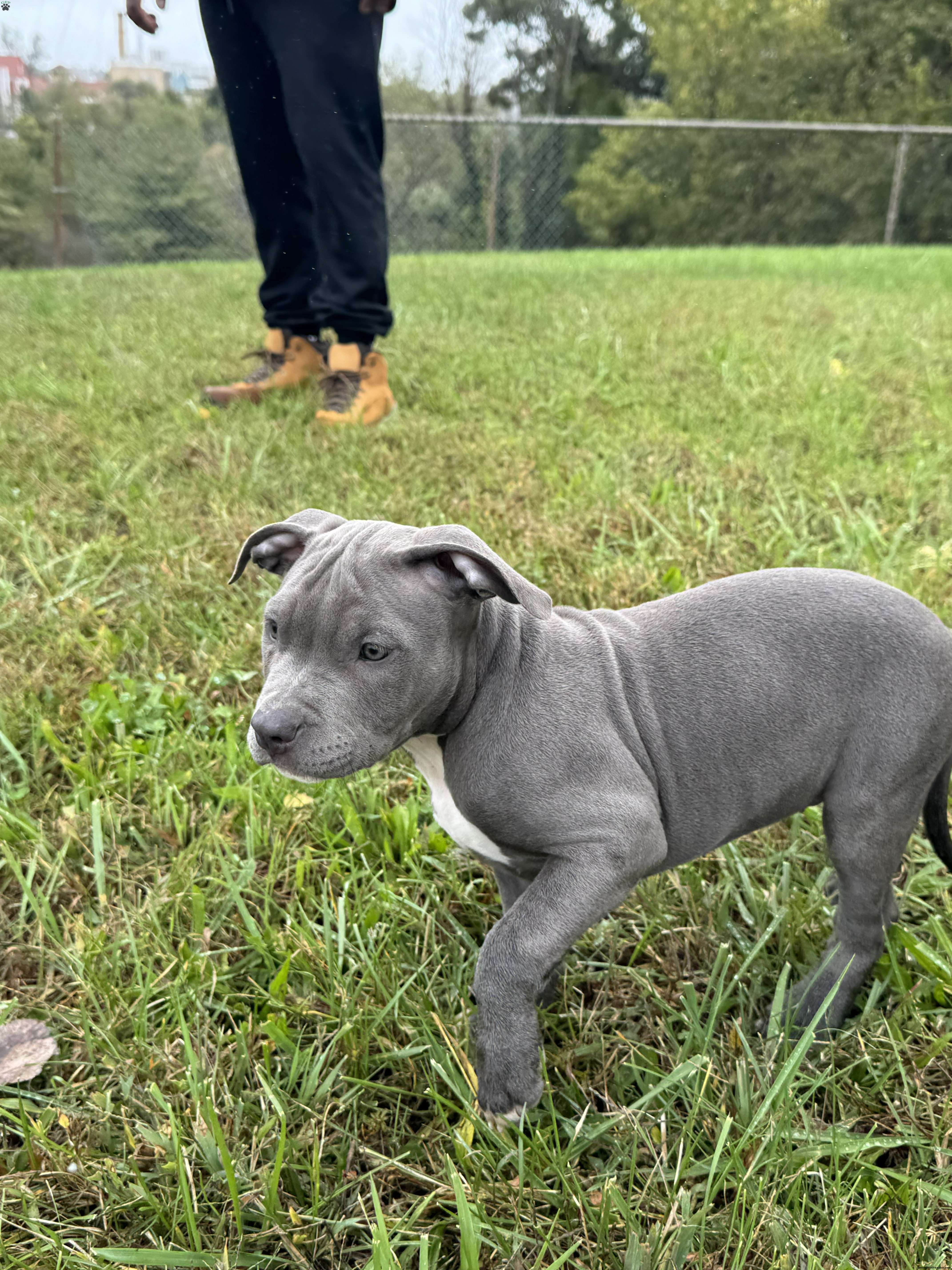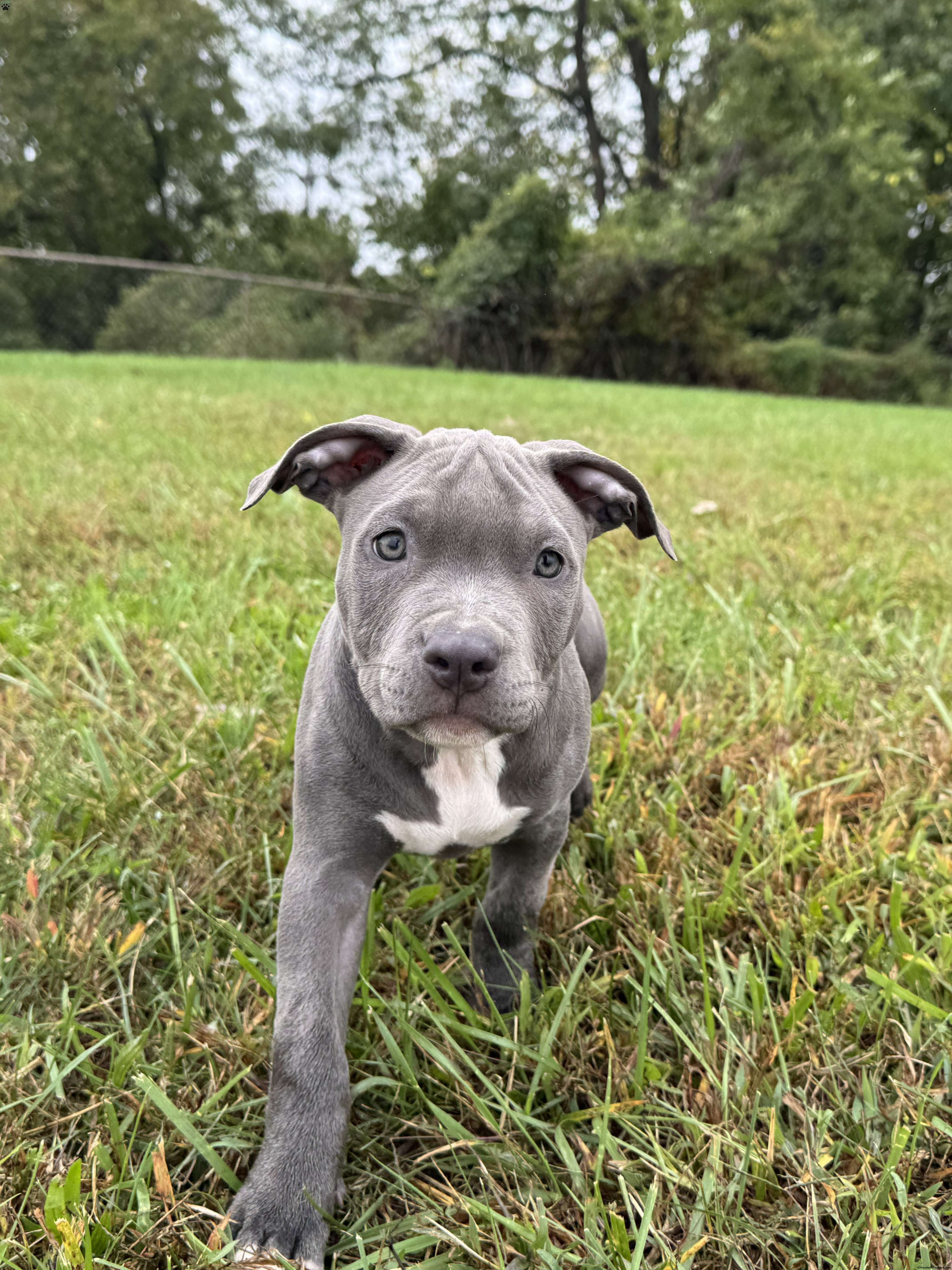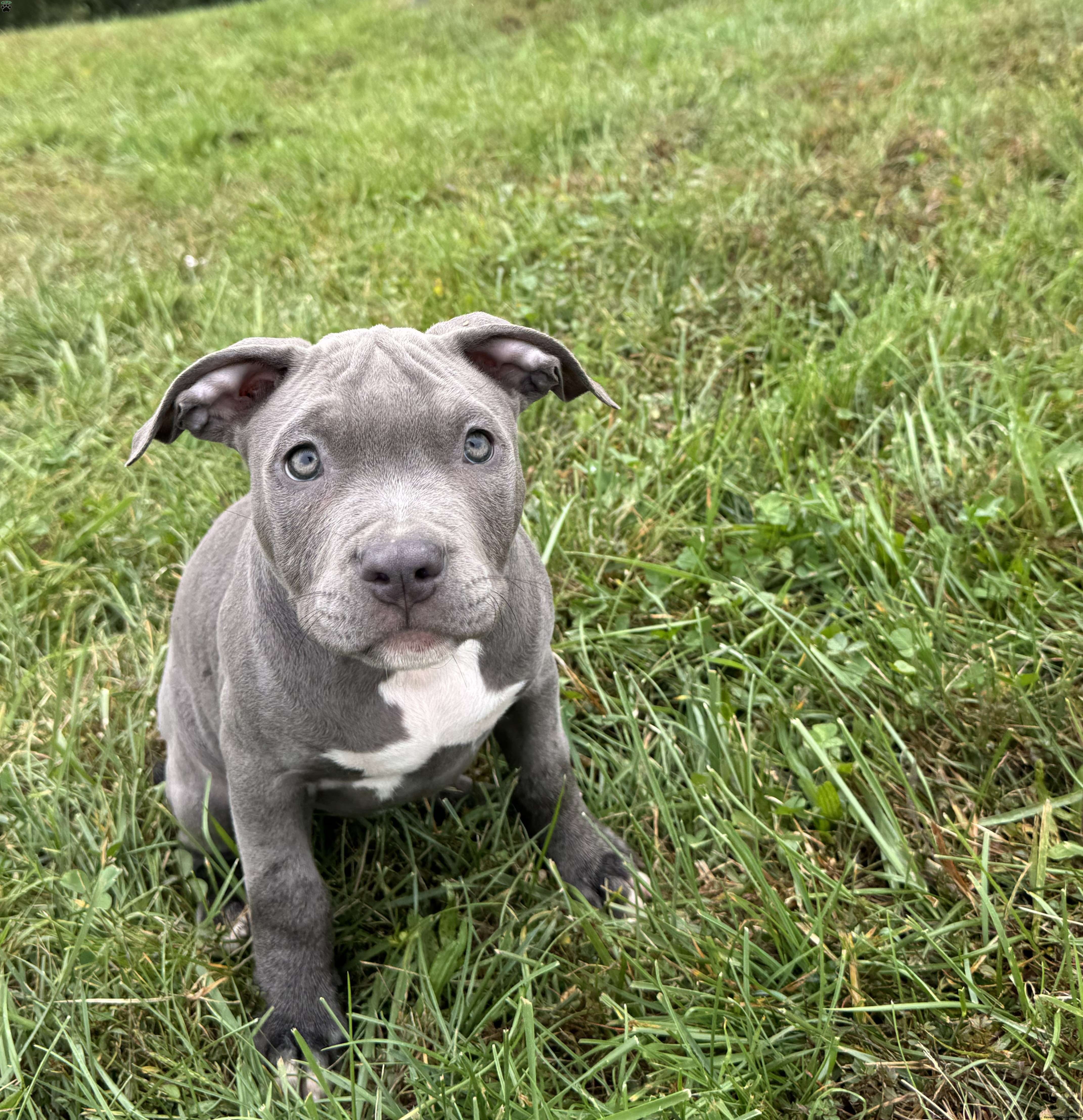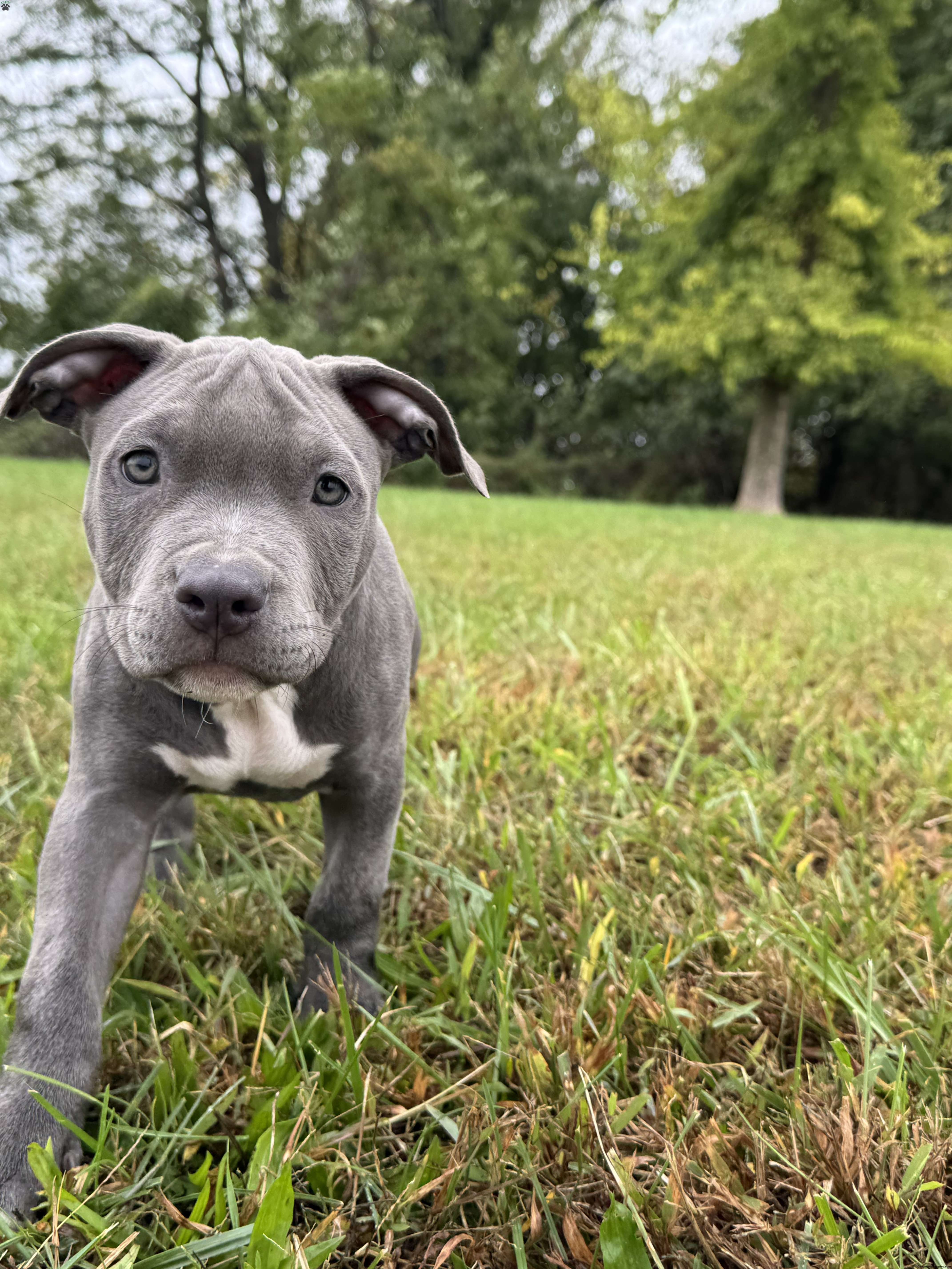 Penny is a beautiful blue American Bully puppy with a white chest and white tips on her back paws.