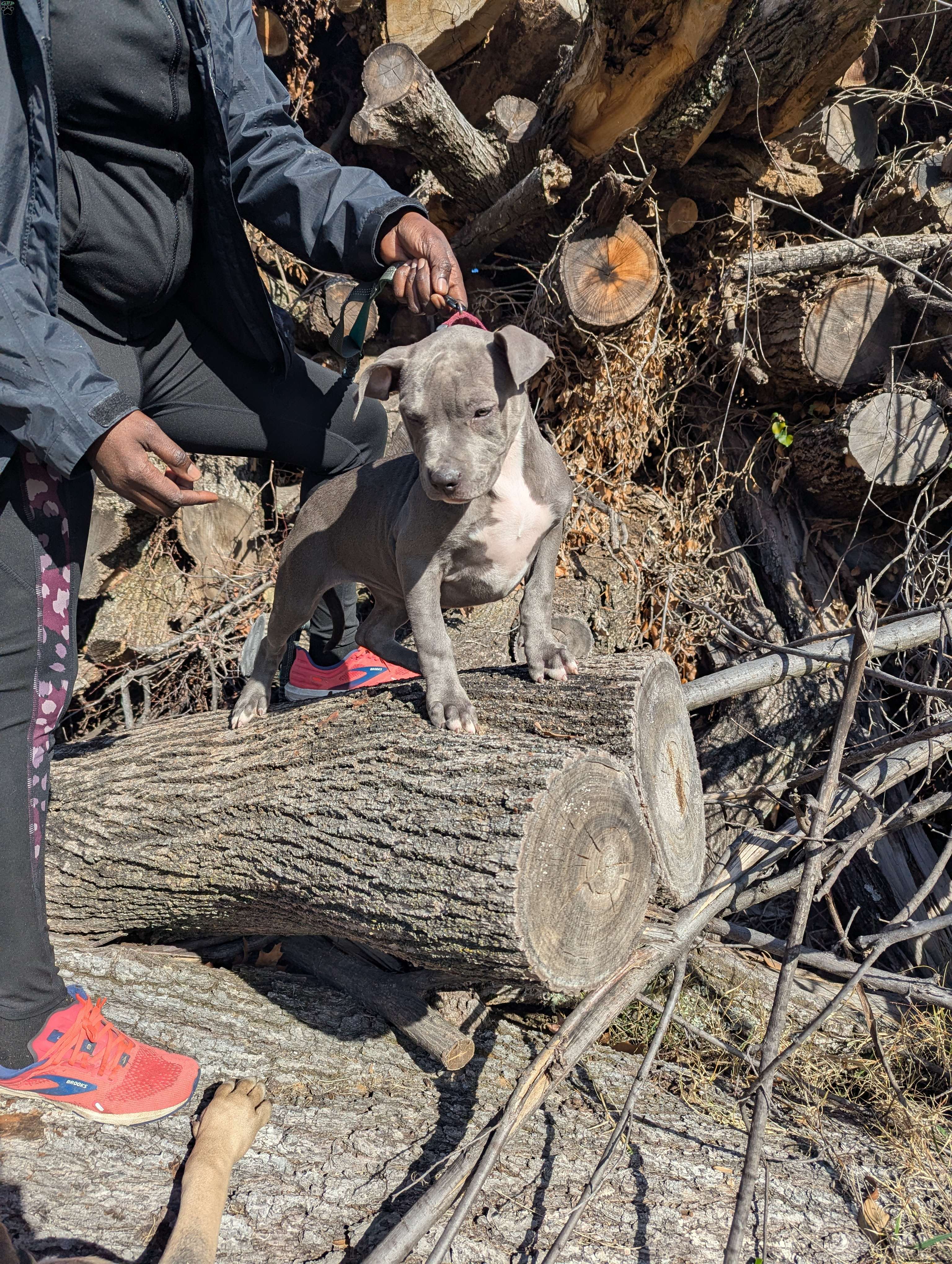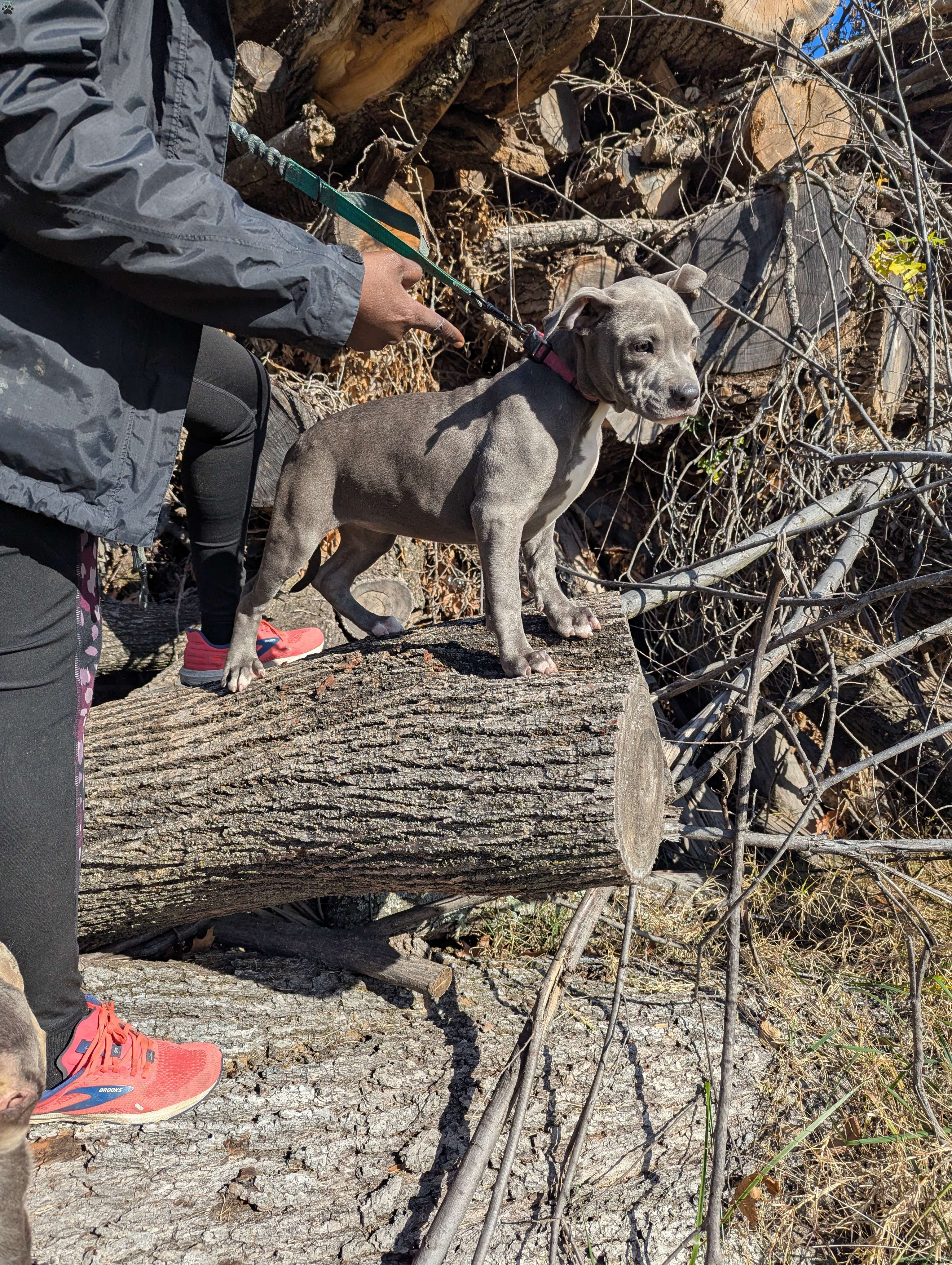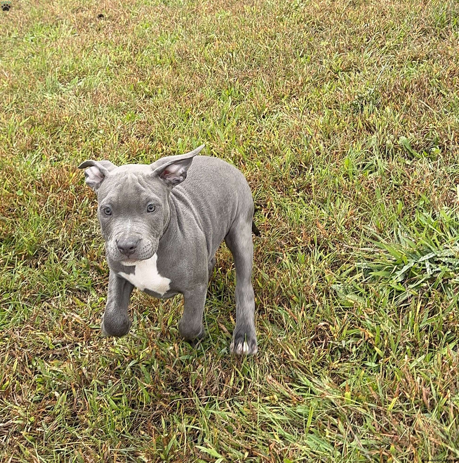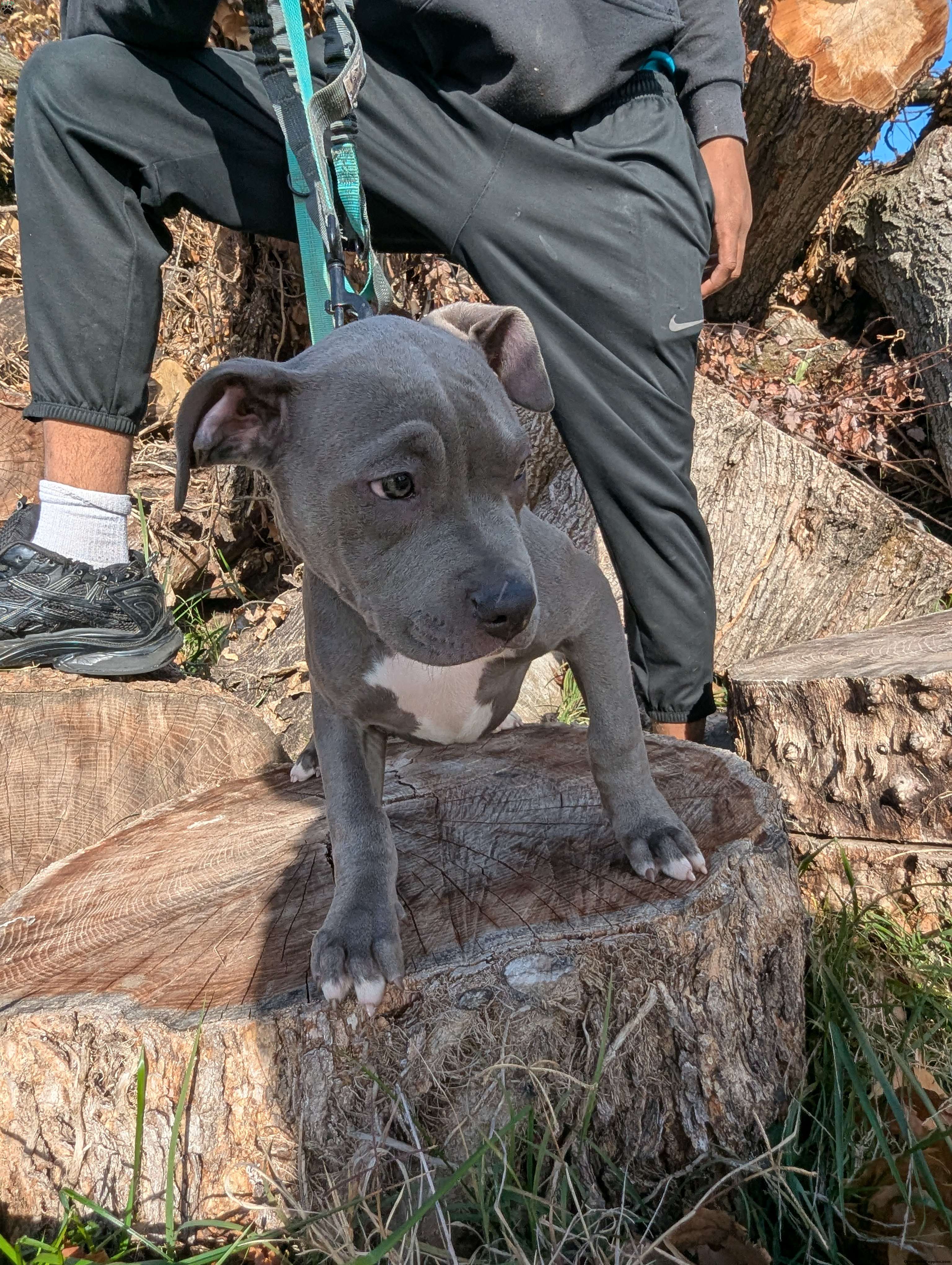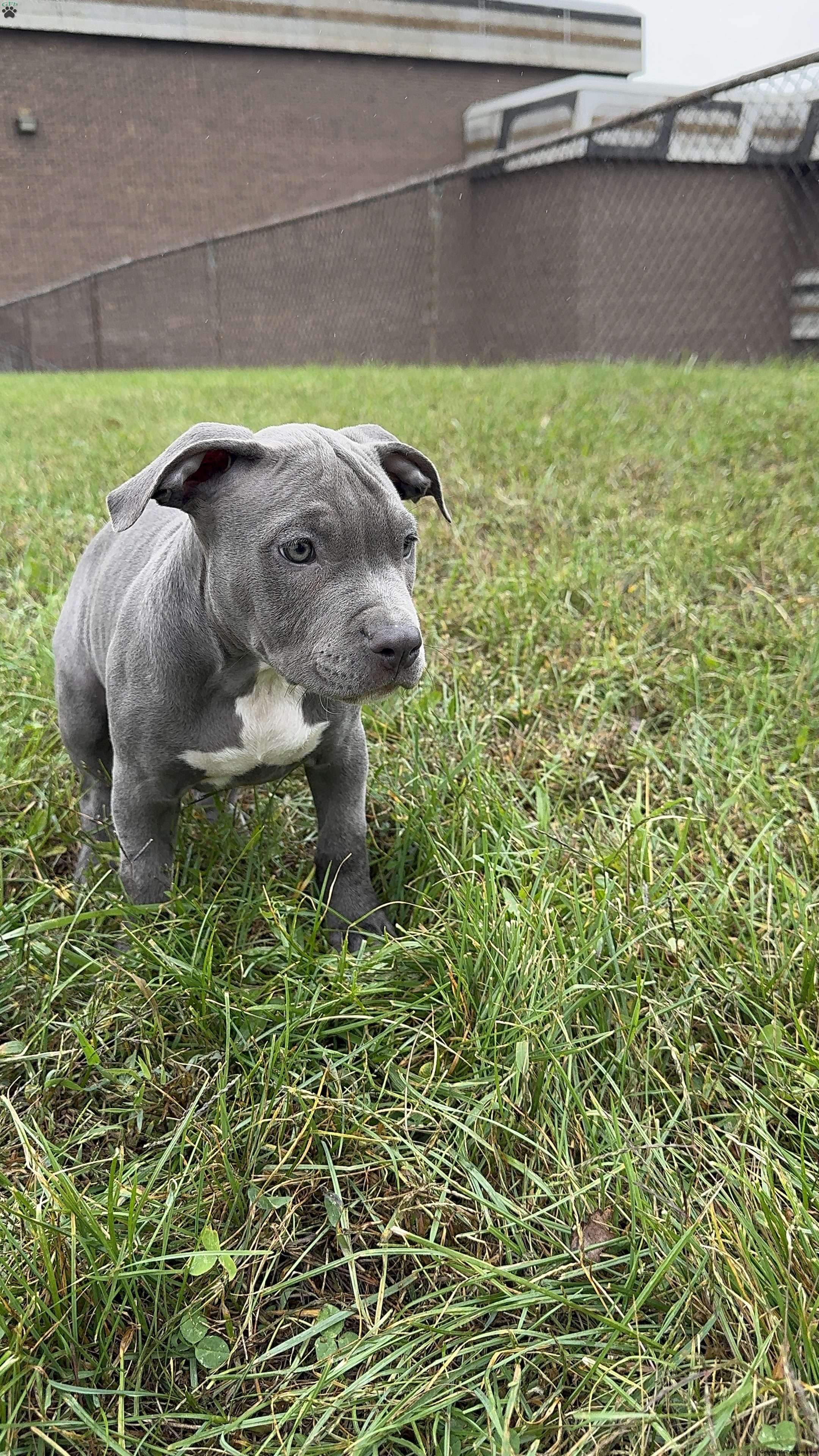 Penny is a beautiful blue American Bully puppy with a white chest and white tips on her back paws.