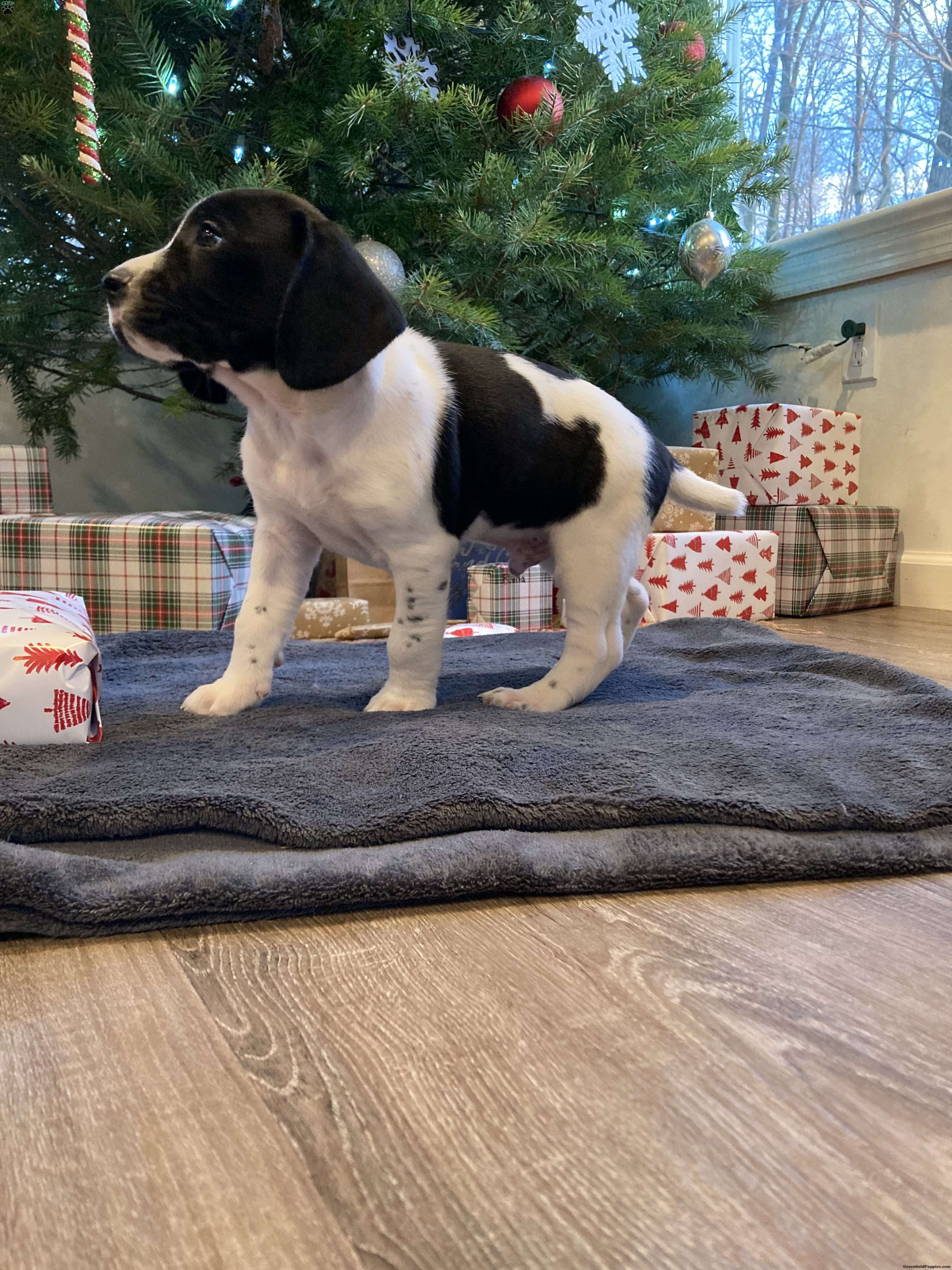 Milo is a Beagle & German Shorthaired Pointer mix aka Boingle. He is a fun, energetic, and playful puppy. He loves to be held and is very friendly with our cat Hurley and our kids. His mother is a loving part of our family and is an avid pheasant hunter. He will be ready for his new loving home 12/18!