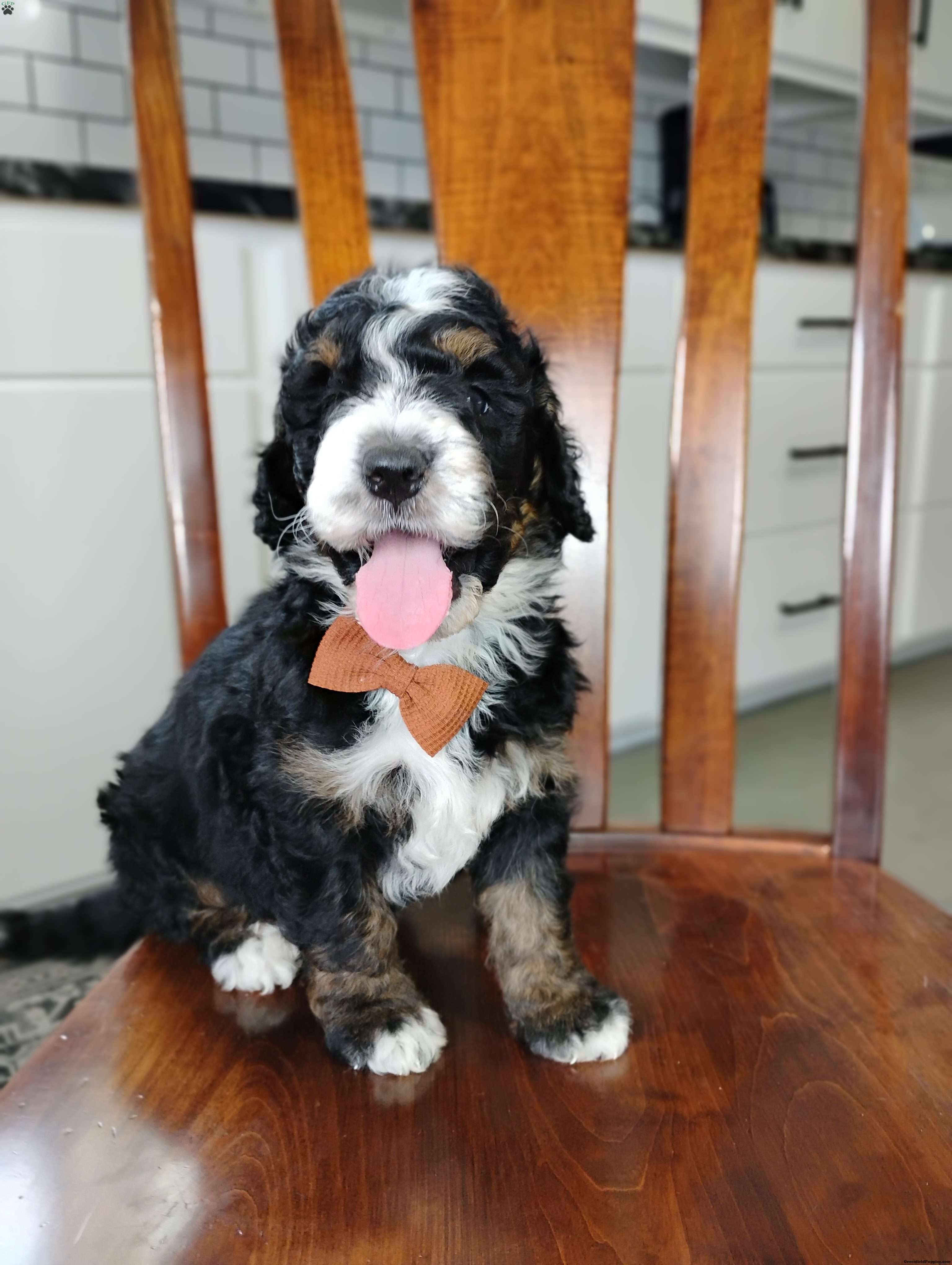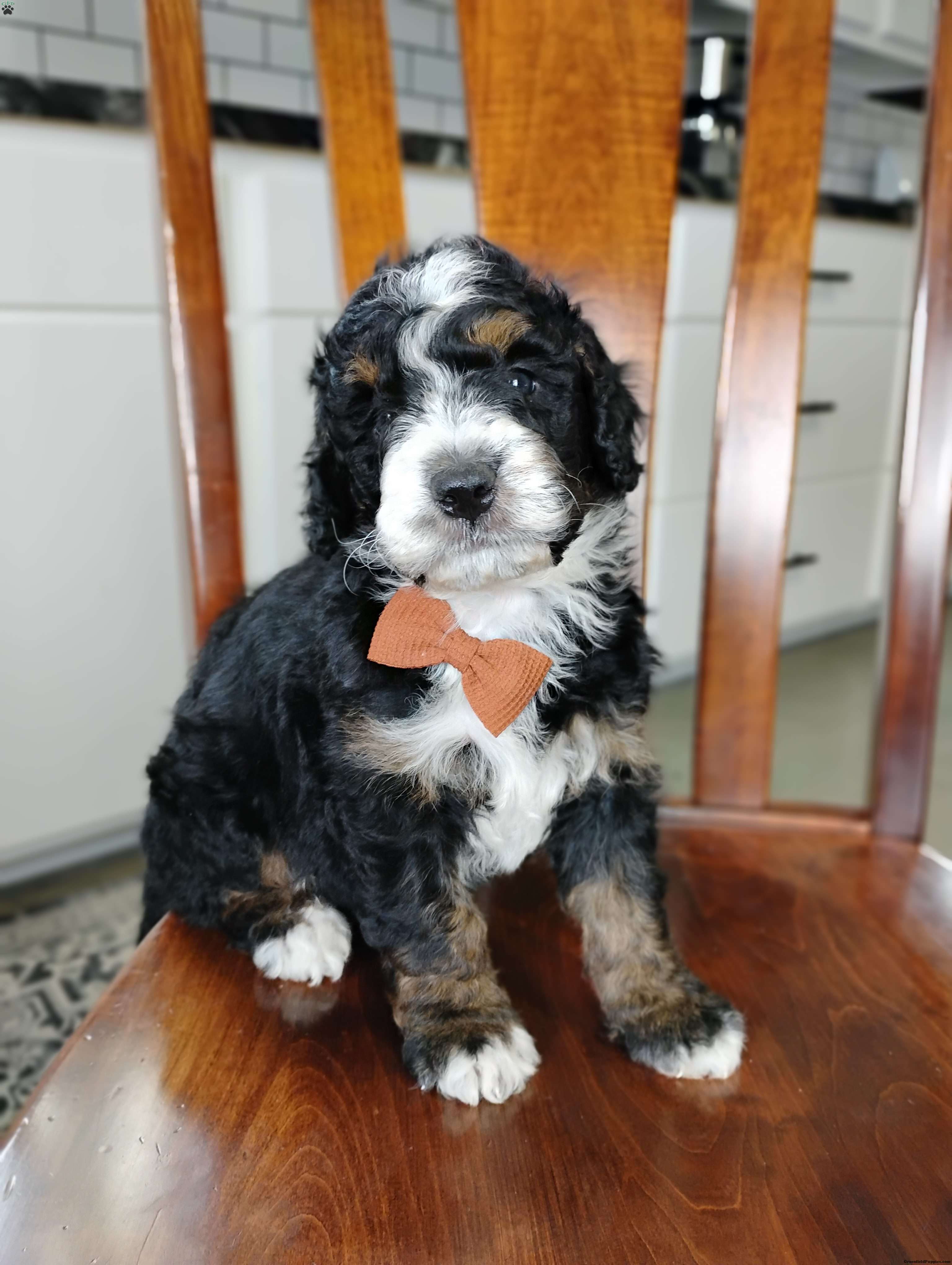 Meet Elliot, .. such a happy loving little guy. He loves to cuddle up with you and is that perfect little guy to get you to go on a walk. He is up to date on vaccinations and dewormer and will have a final health exam with our licensed veterinarian to ensure excellent health before leaving our home. Mom is a Bernese mountain dog around 70 lb and dad is a miniature poodle around 13 lb. Both parents have completed their genetic testing and he will also have a one-year genetic health guarantee. We are estimating him to be around 30 to 40 lb at his adult weight. Please call or text me for more info on adopting this little guy.. my name is Miriam..
