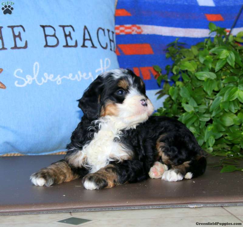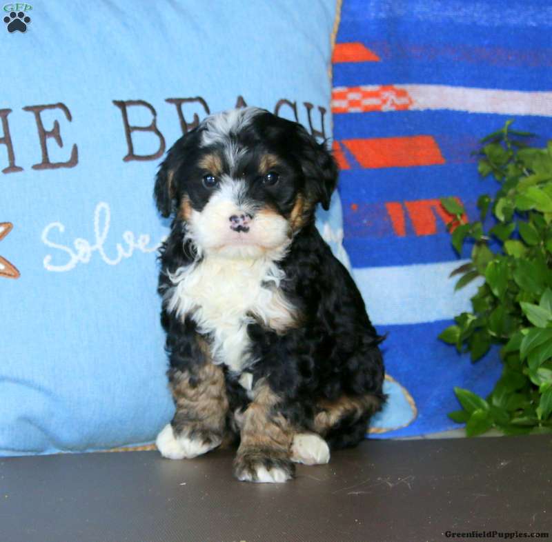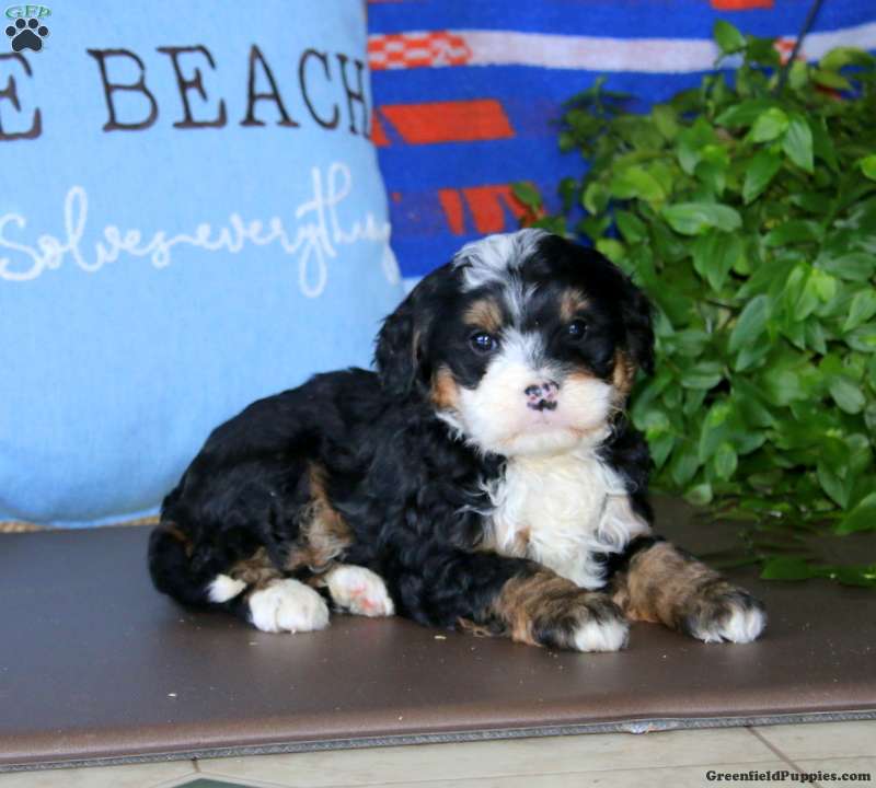 Karla is a beautiful Bernedoodle puppy with a playful and happy demeanor! This sweet pup has a fun personality is perfectly lovable! Karla is socialized and ready to meet her forever family. She comes home with a 30 day health guarantee as well as an extended genetic health guarantee, both provided by the breeders. This cutie has also been seen by a vet and is up to date on shots and de-wormer.