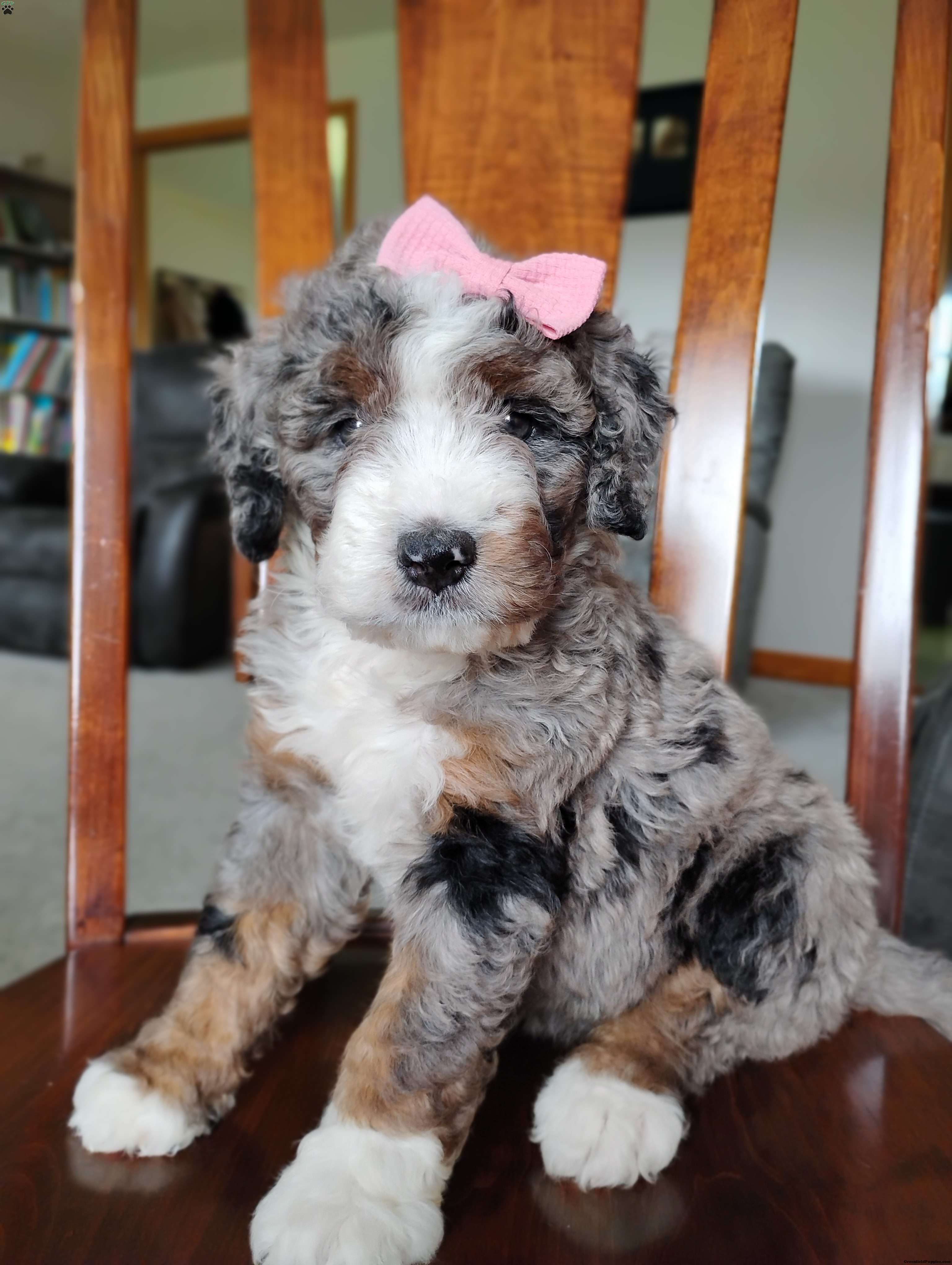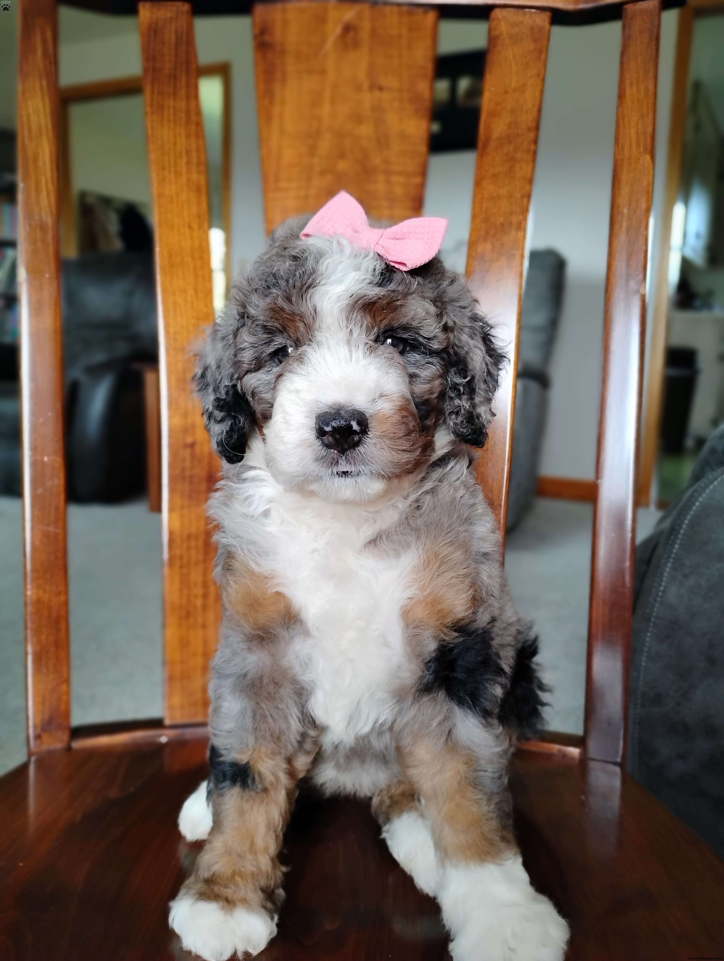 Meet Mila, she is such a happy little girl and yet so easy going and super chill just like her brother. I love when she looks at me with those big Hazel colored eyes. She is anticipated to be very low shedding, if anything at all. She is up to date on vaccinations and dewormer and we’ll have a final health exam with our veterinarian to ensure excellent health before leaving our home. Mom is a Bernese mountain dog around 70 lb and dad is a miniature poodle around 13 lb, we are estimating her to be 40 to 50 lb at her adult weight. Both parents have completed their genetic testing and she will also have a one-year genetic health guarantee. Please call or text me if you are interested in adopting this sweet girl. I do have shipping options available….