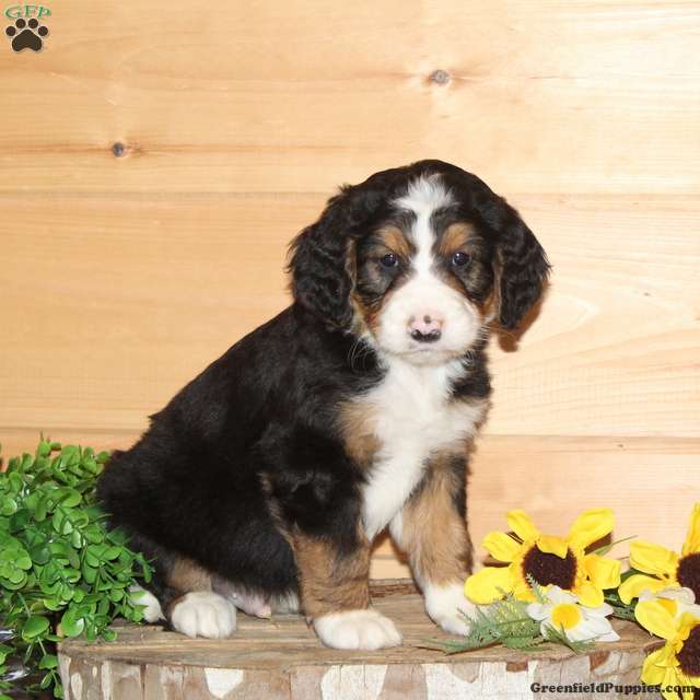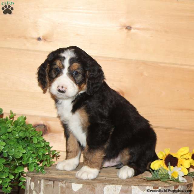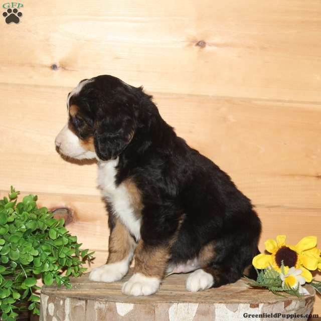This puppy was born on January 7, 2026 and will be ready to go home on March 4, 2026. The parents are Raina (65lbs.) our AKC Bernese Mountain dog and Tucker (55 lbs.) our AKC standard poodle. Both parents have been genetic tested and are clear. We expect this puppy to grow to 60-90 lbs. He will come to you vet-checked and up-to-date on vaccinations and dewormings. A collar, leash and bag of food come along too. We accept Venmo and PayPal for easy transactions.