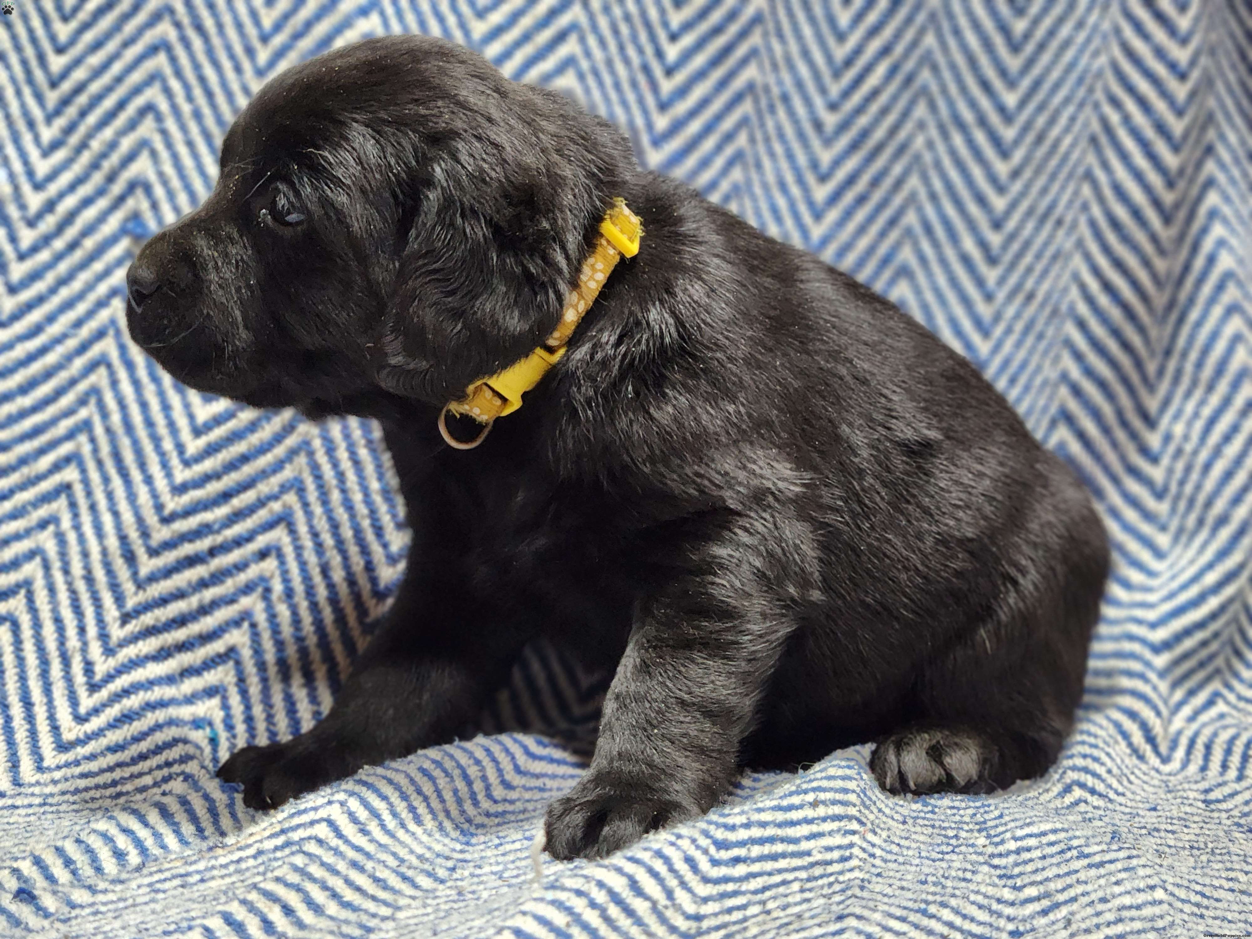 Stella, an adorable black english lab! She is loving n super playful, she would go well as a family pet or as a second dog. She is AKC REGISTERABLE and will come with a current vet health certificate.  She will be ready, no joke, April 1!