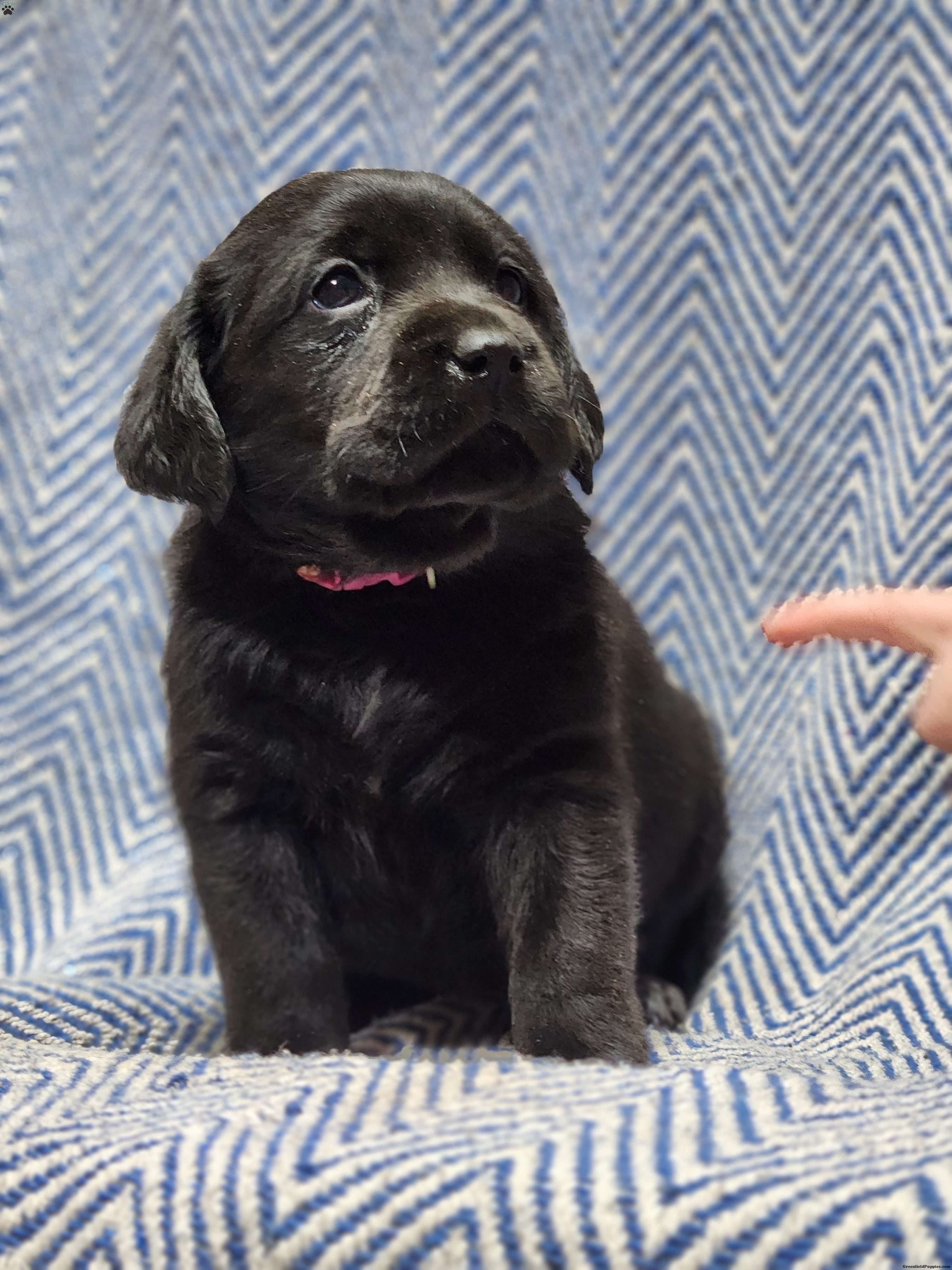 Leah, an adorable black english lab! She seems to have a little more laid back personality but happily follows along and plays well with her littermates. She is AKC REGISTERABLE and will come with a current vet health certificate. She will be ready, no joke, April 1!