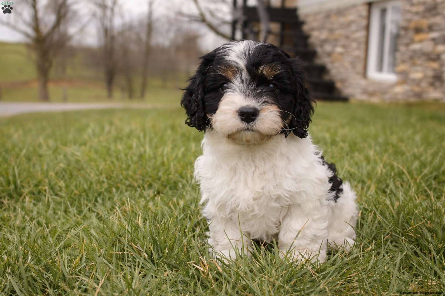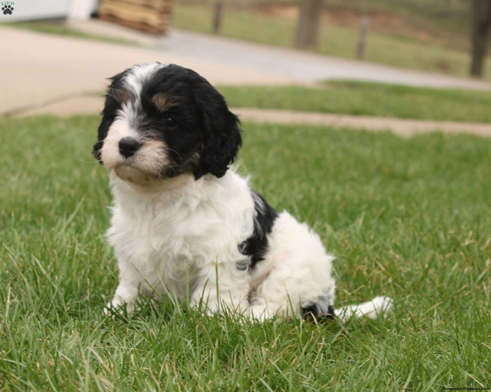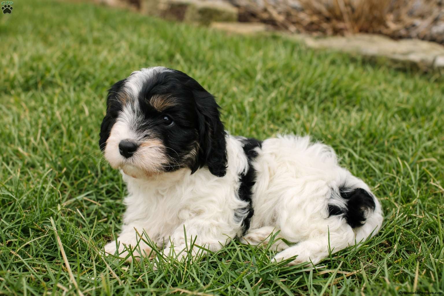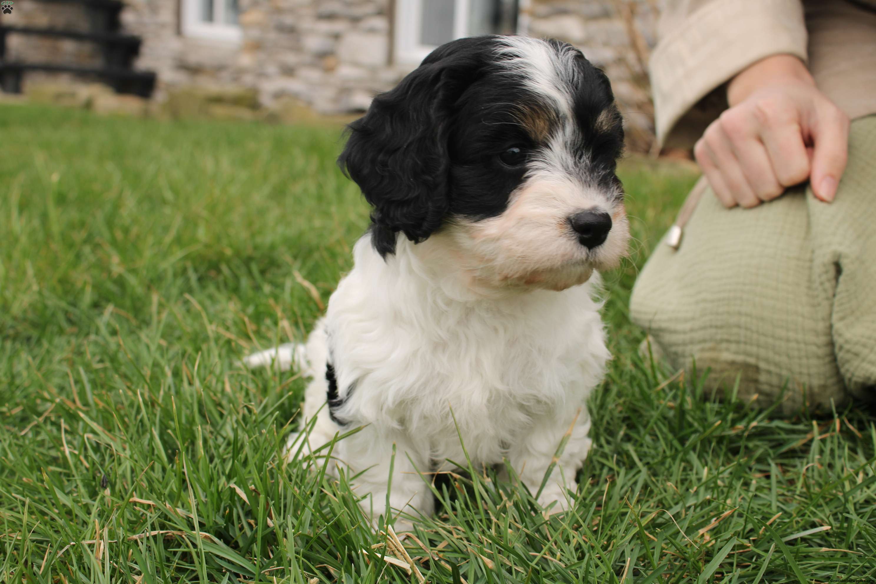Meet Elliott! She is a beautiful black and white Cavapoo with a soft, wavy coat and a gentle, affectionate temperament This little one is the perfect blend of playful and cuddly.