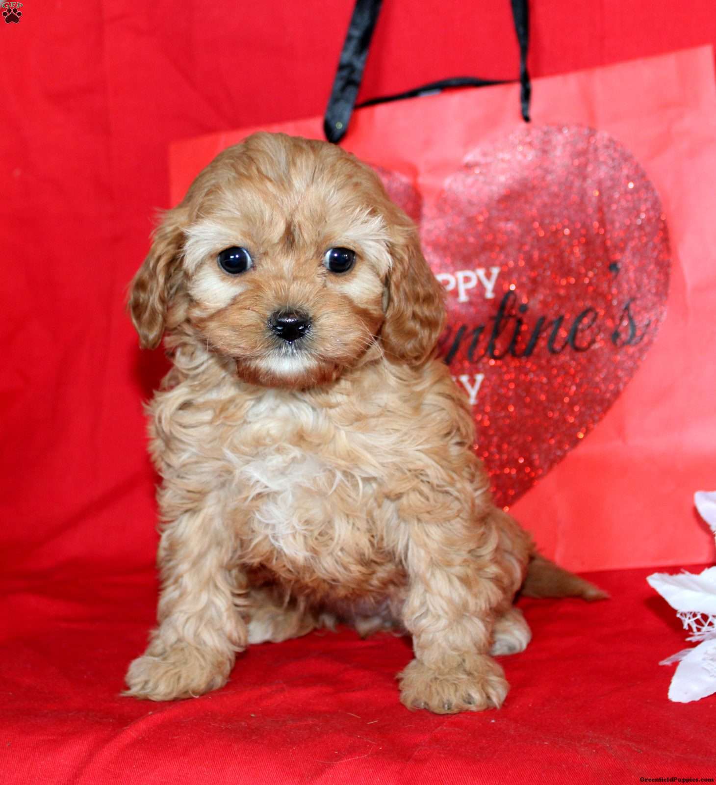 Joy has an apricot-toned coat with soft curls forming throughout, slightly lighter through the chest and underside. Her face features large, dark eyes, a short muzzle, and rounded features typical of the Cavapoo mix.