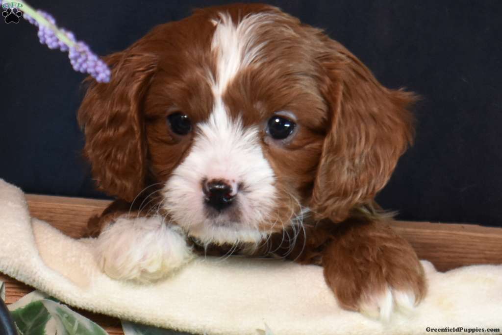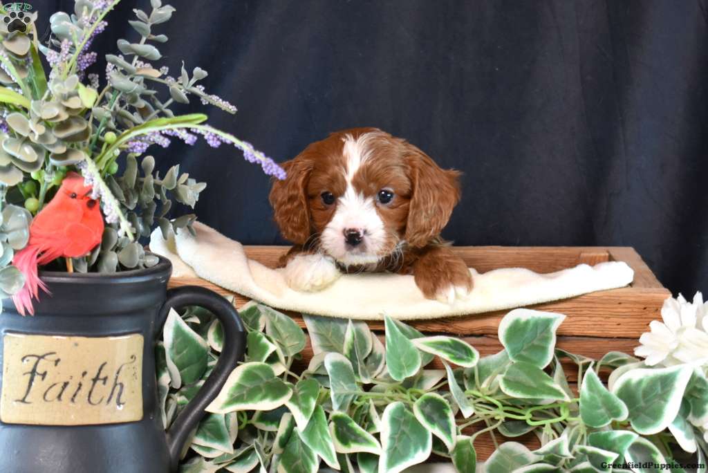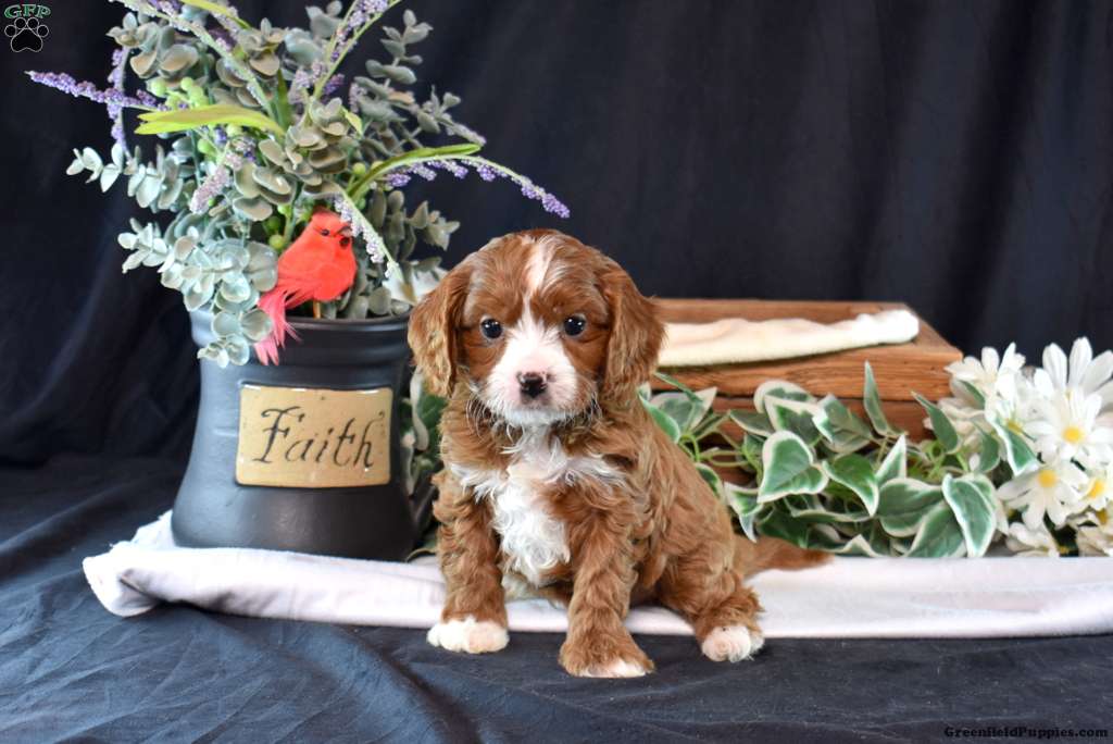 Kale is a darling Cavapoo puppy who is playful and sweet! This happy boy is socialized, family raised, and ready to meet you. Kale has been seen by a vet and is up to date on shots and de-wormer. He’ll also come home with a 30 day health guarantee and an extended genetic health guarantee, both provided by the breeder.
