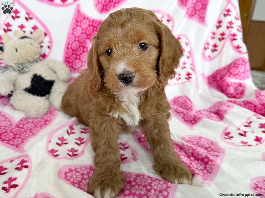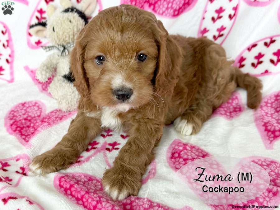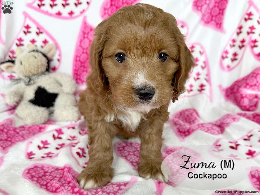 Zuma is a dark red male cockapoo puppy with white on his nose, chest and paws. This handsome boy is lots of fun and enjoys playing with his littermates. He is looking for his forever home. Could that be you?