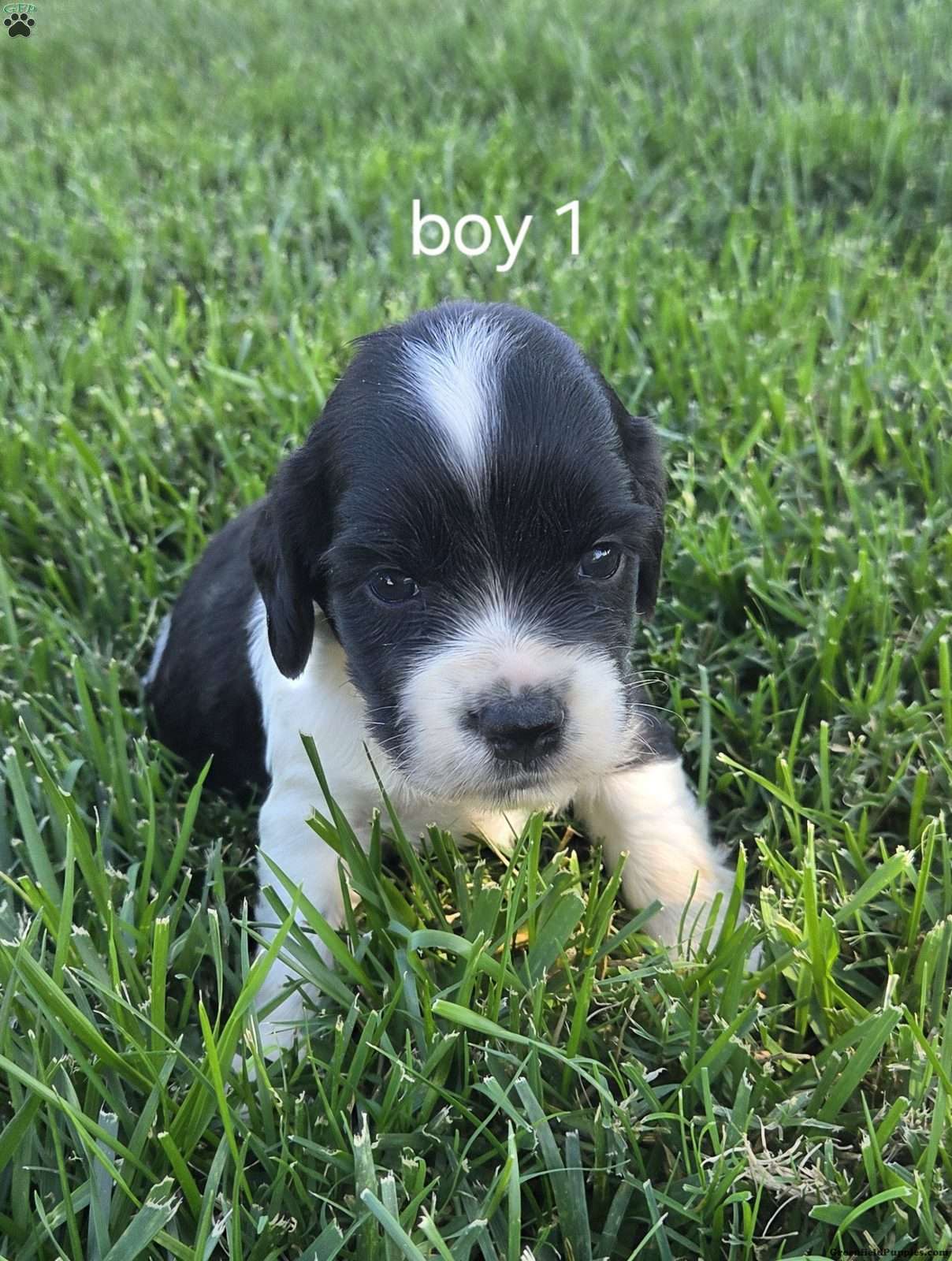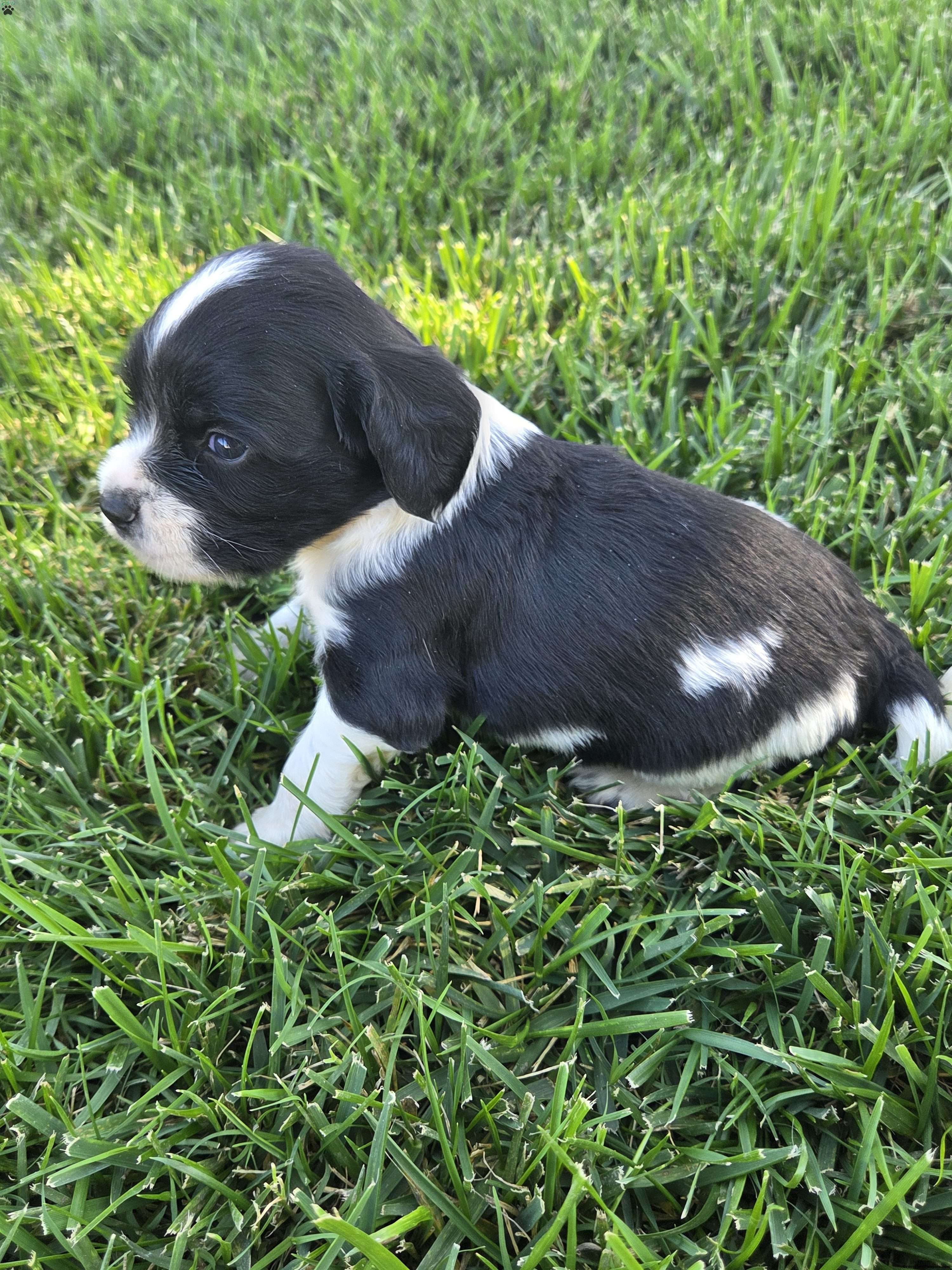 This adorable little guy is a Sprocker Spaniel. The mother is a purebred AKC Springer Spaniel and the father is purebred AKC Cocker Spaniel. We purposely and have pursued this breed and have been delighted with the results.  The Sprockers are exceptionally good hunting dogs. Very easy to train and love people and children.  Very easy going.