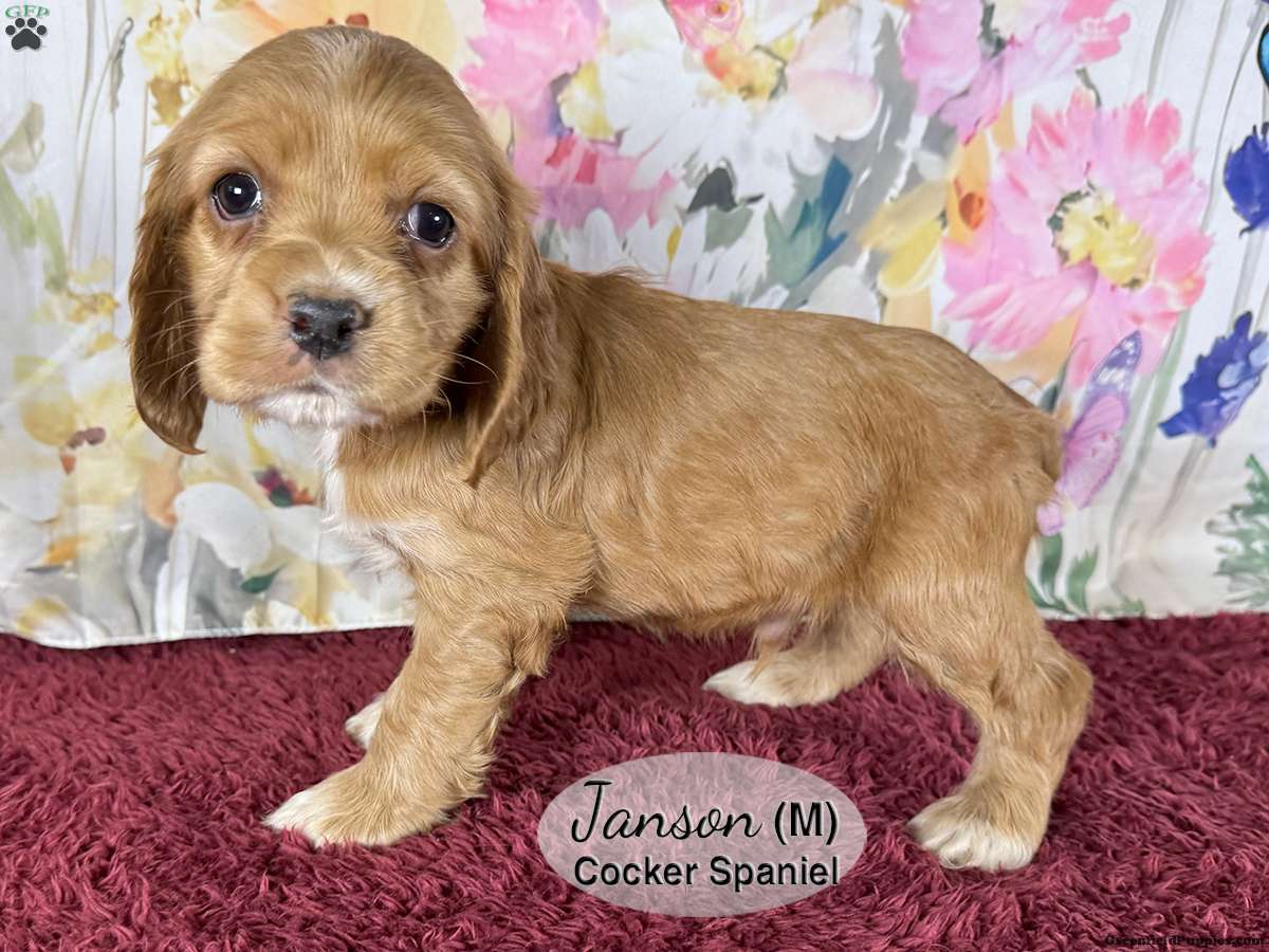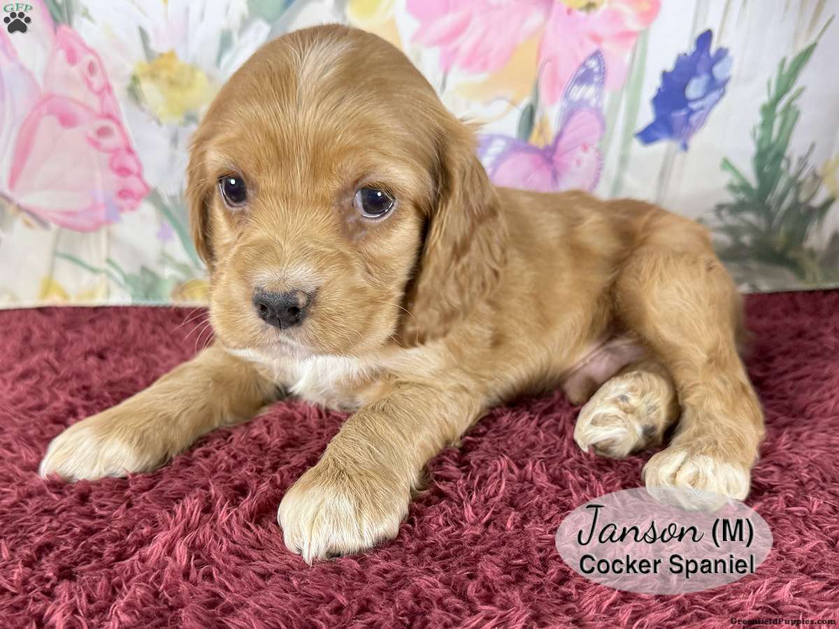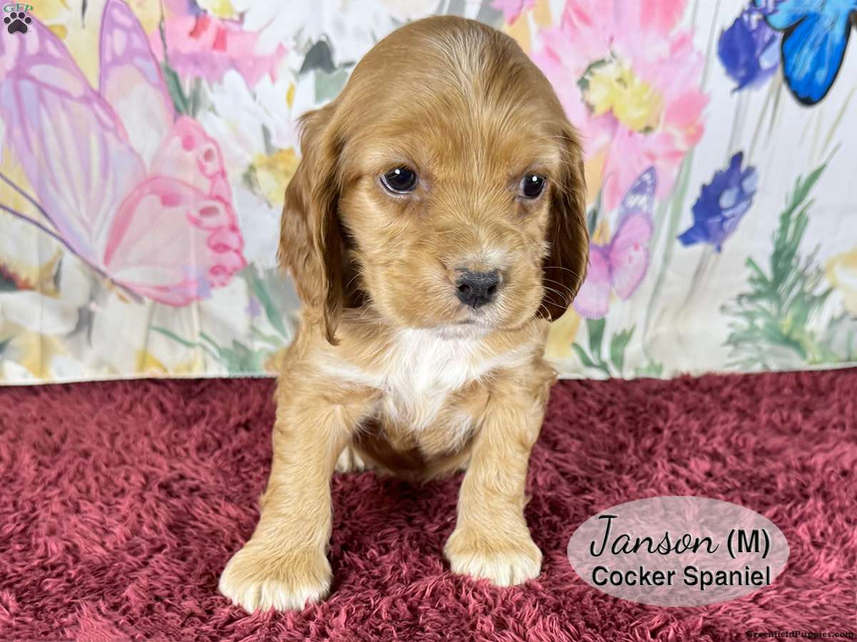 Janson is a male, dark tan Cocker Spaniel puppy with white markings on his chest and paws. One of six in the litter, he is well socialized and enjoys playing with his littermates and our children. He is looking for his forever home and would make a great addition to your family.