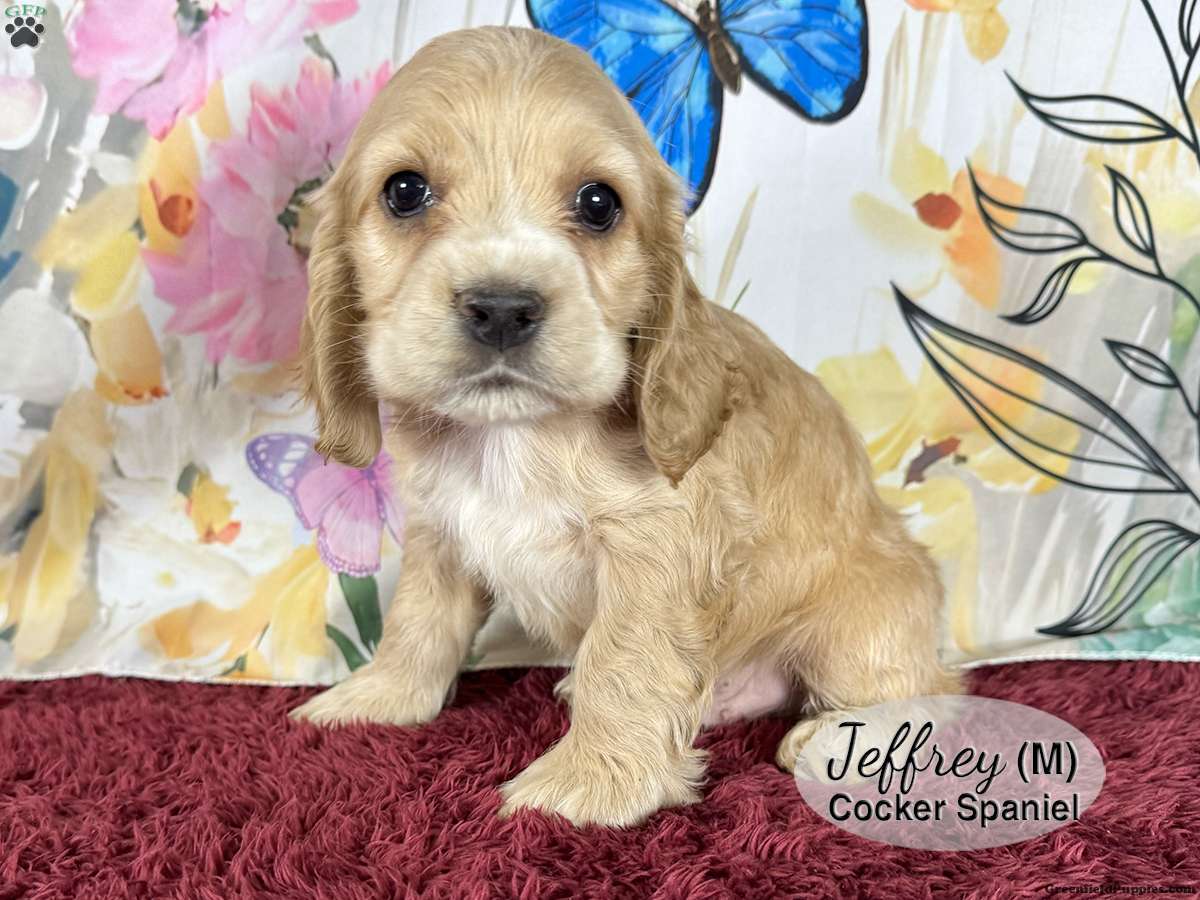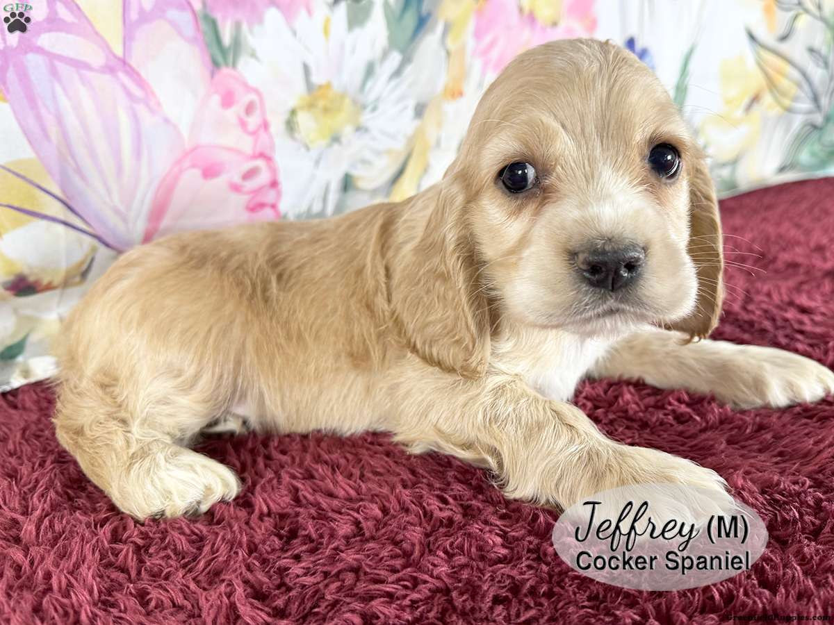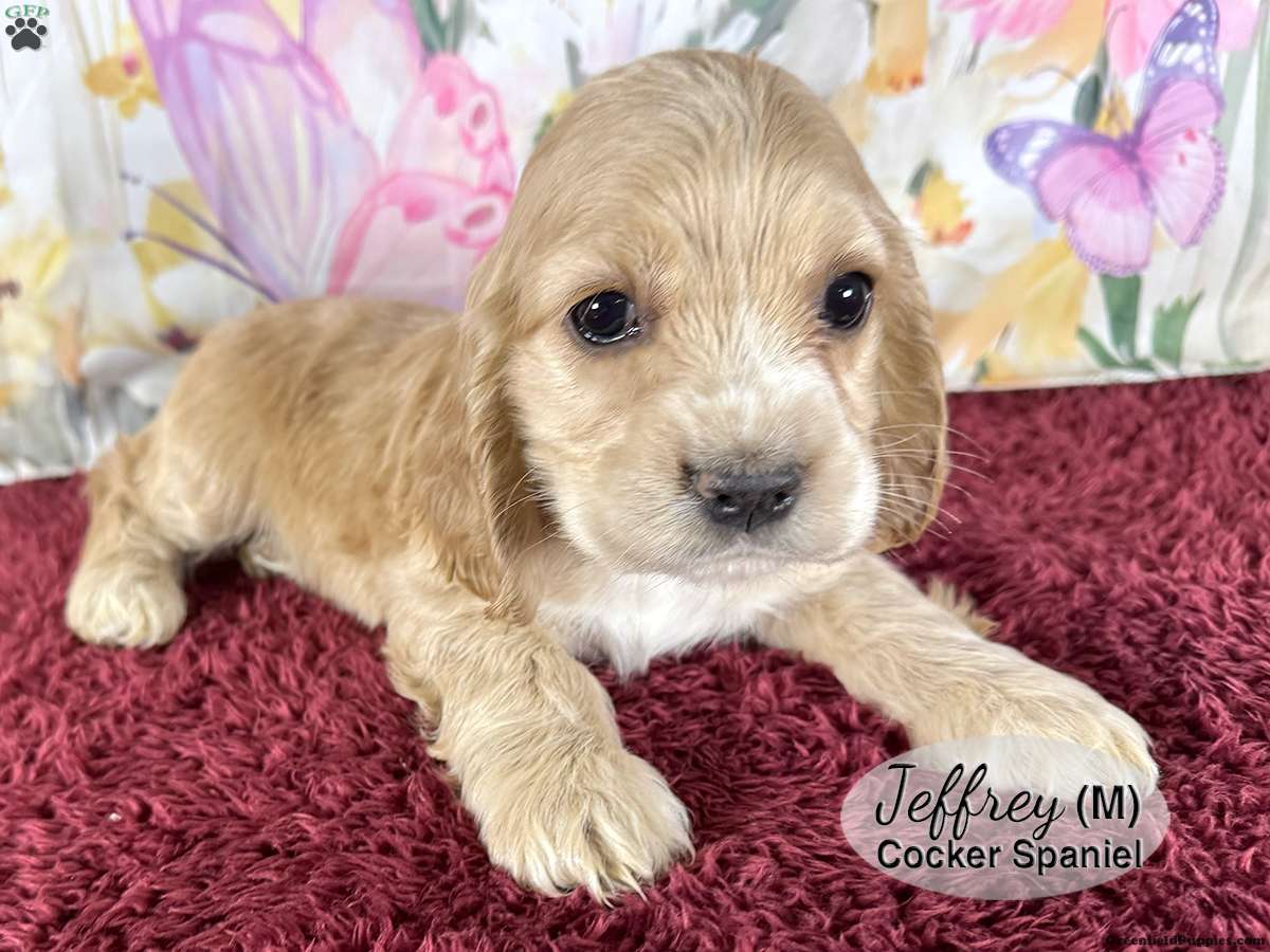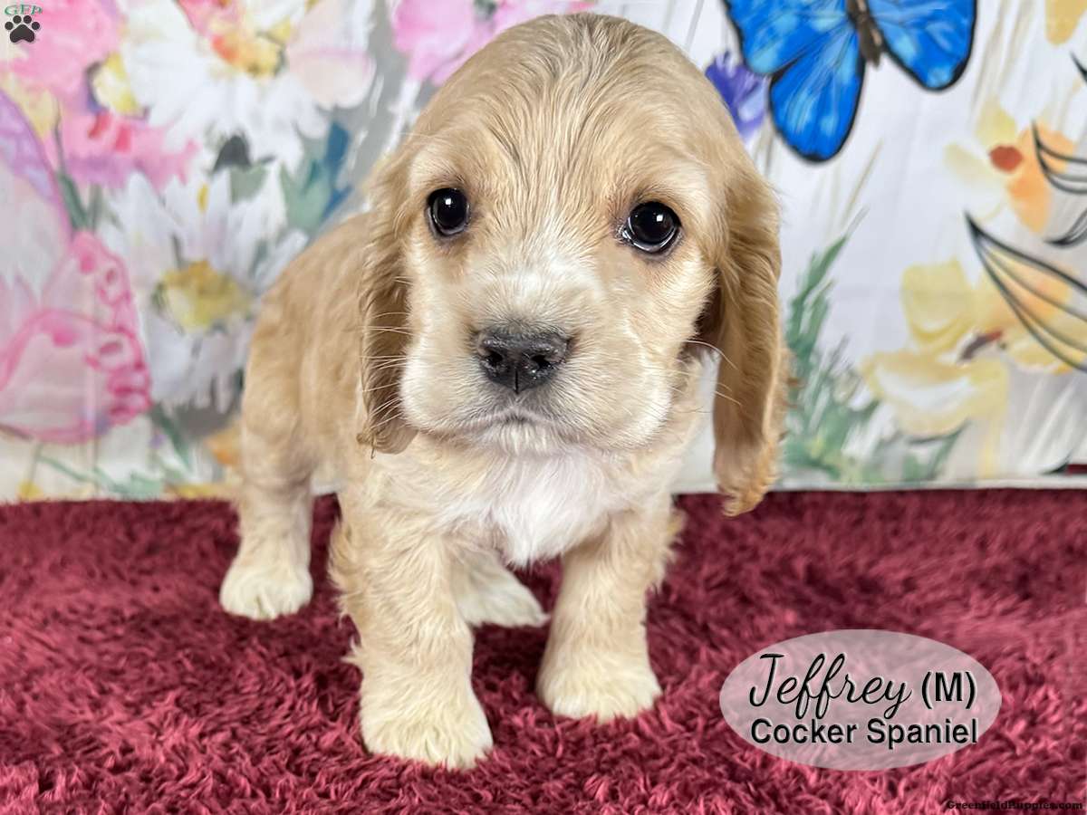 Jeffrey is a male, tan Cocker Spaniel puppy with white markings on his nose, chest and paws. One of six in the litter, he is well socialized and enjoys playing with his littermates and our children. He is looking for his forever home and would make a great addition to your family.