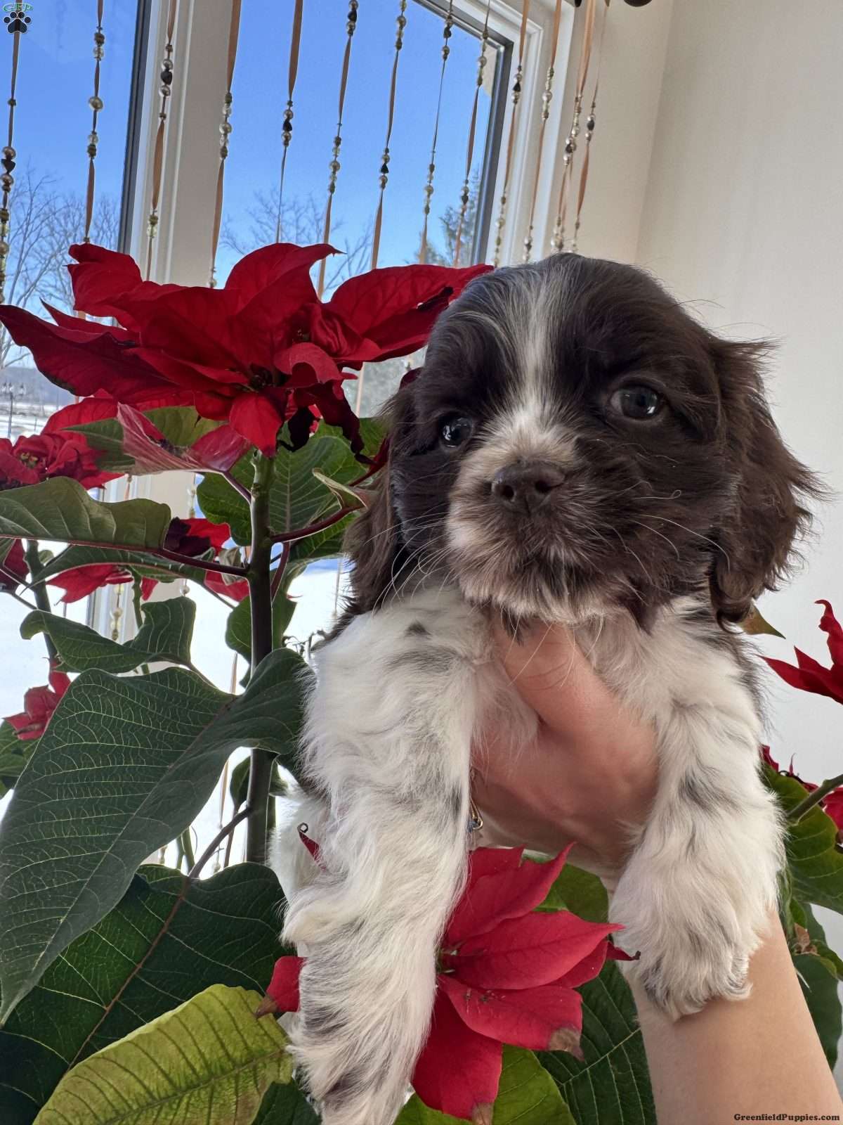 Meet Mocha, an adorable cocker spaniel with a stunning coat that beautifully combines rich brown and pure white. His soft fur features splashes of warm mocha brown that create a lovely contrast against the crisp white patches, giving him a unique and eye-catching appearance.