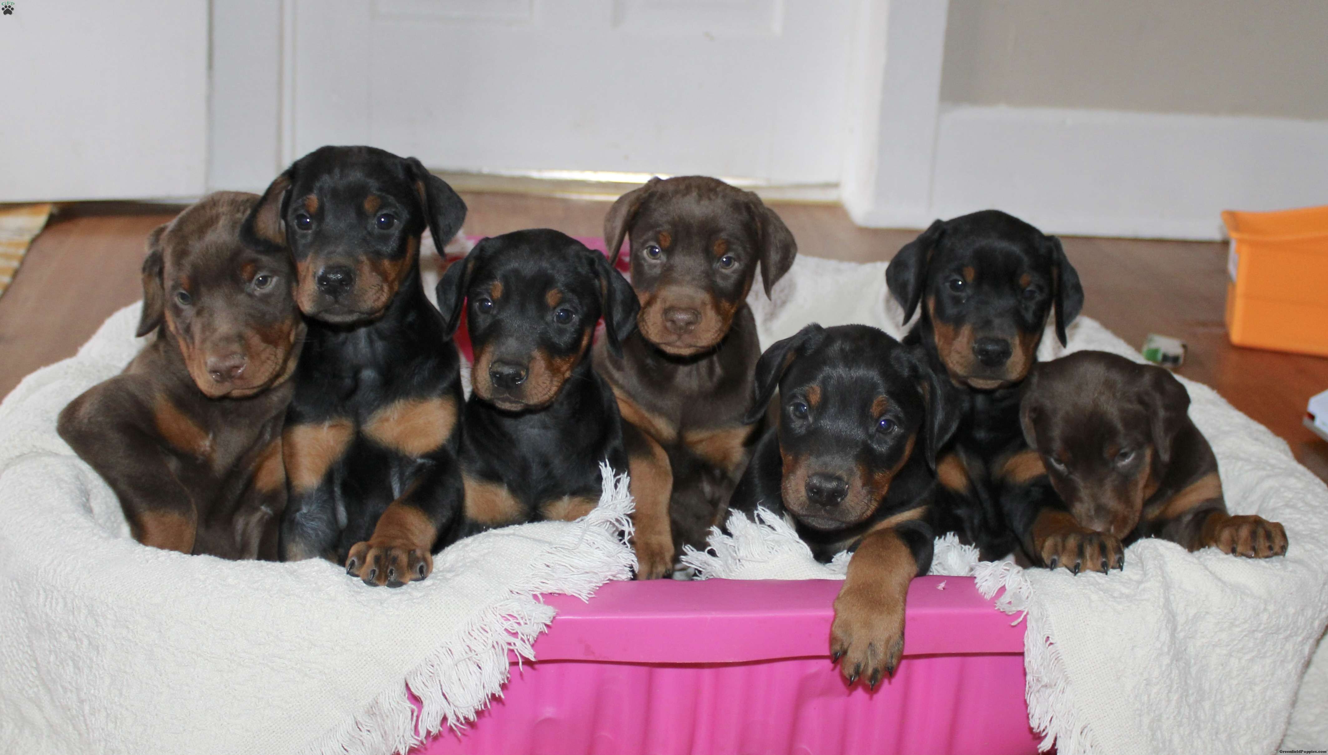 Say hello to this adorable Doberman puppy! The mother, Sophie and father, Apollo are also both Dobermans! Each puppy comes up to date on shots and dewormer, and is also vet checked. They also each come with a 30-day health guarantee and are eligible for AKC registration. Alivia’s ears will be professionally cropped by a licensed veterinarian prior to being placed in her forever home. To learn more about our puppies, contact us today!