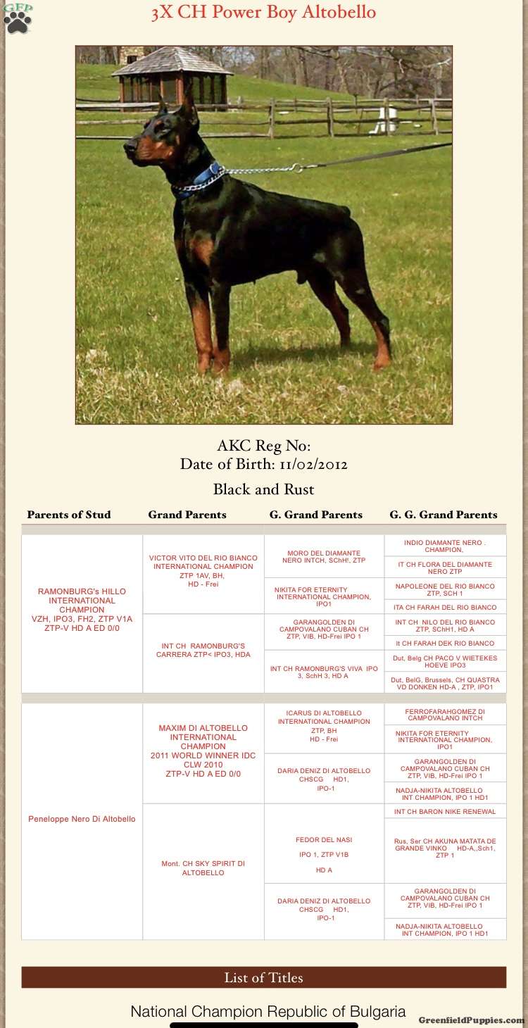 APRI Reg Appl -3 Generation Pedigree -Health Tested Parents- Health Record Detailing Current Vaccinations & Deworming  -Vet Checked – Health Certificate – Written Health Guarantee – Microchipped –  Lifetime Microchip Enrollment – Ears Cropped-Tail Docked-Dews Removed – Started on Nu-vet Vitamins & TLC Puppy Food -Potty Training Started