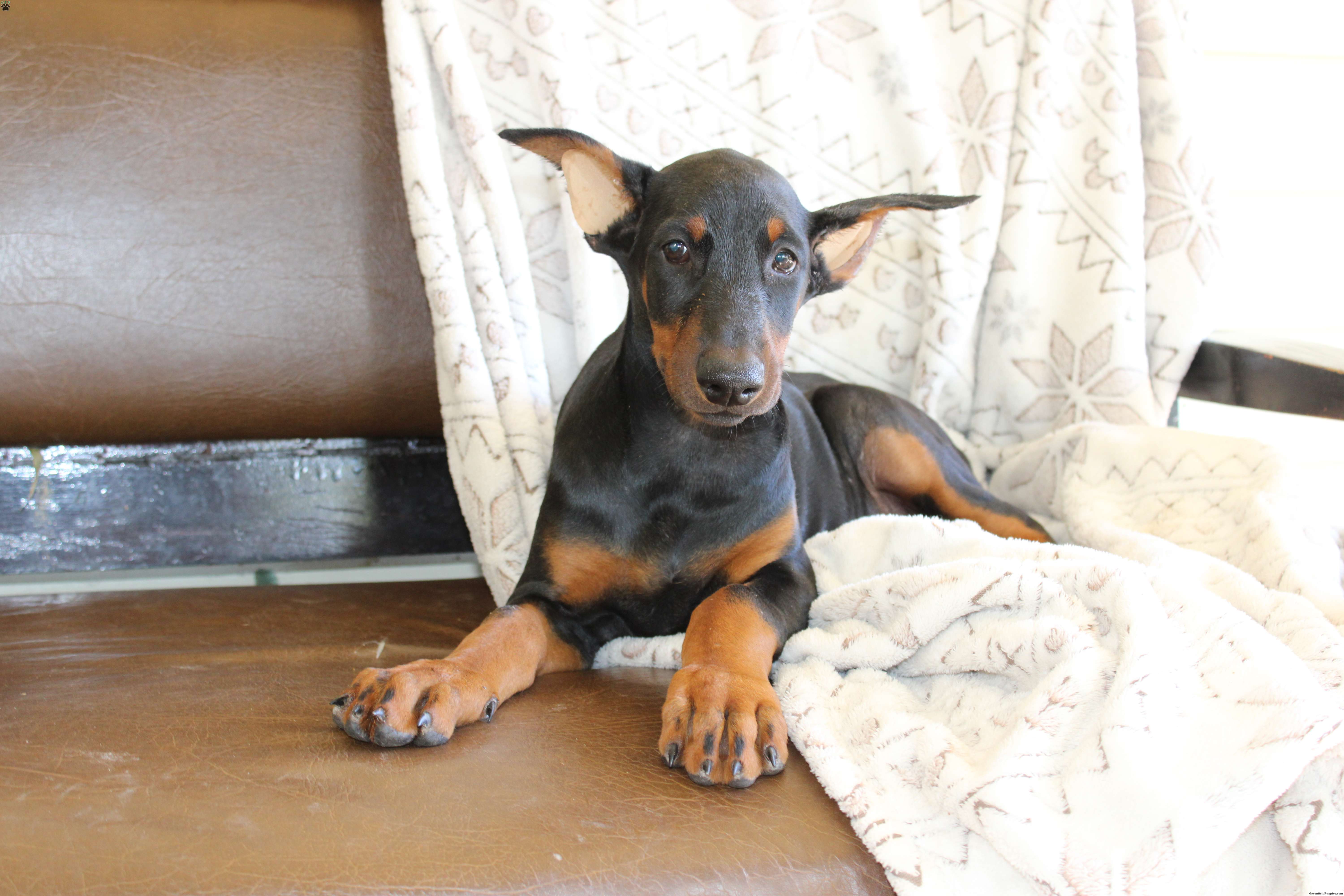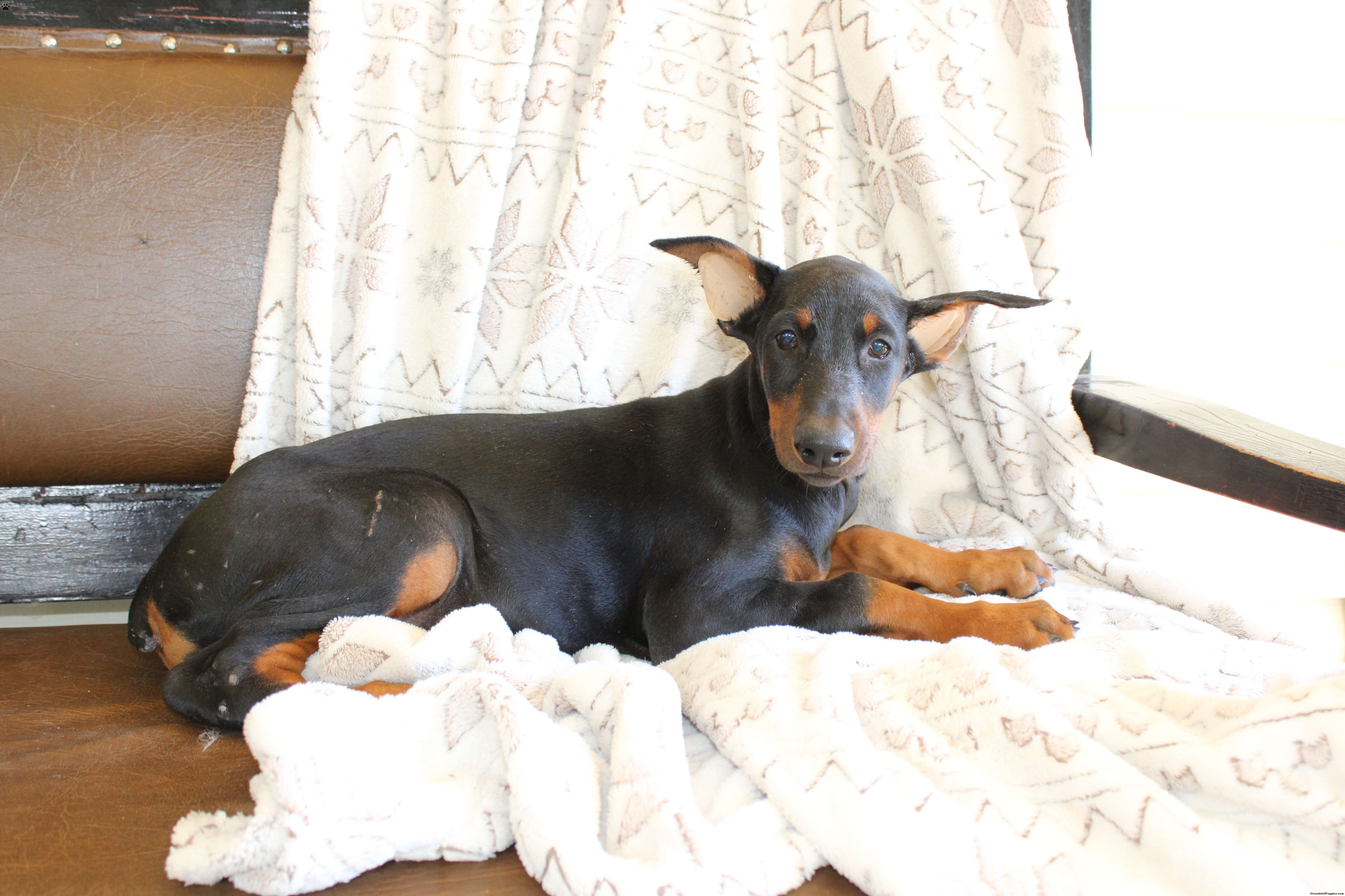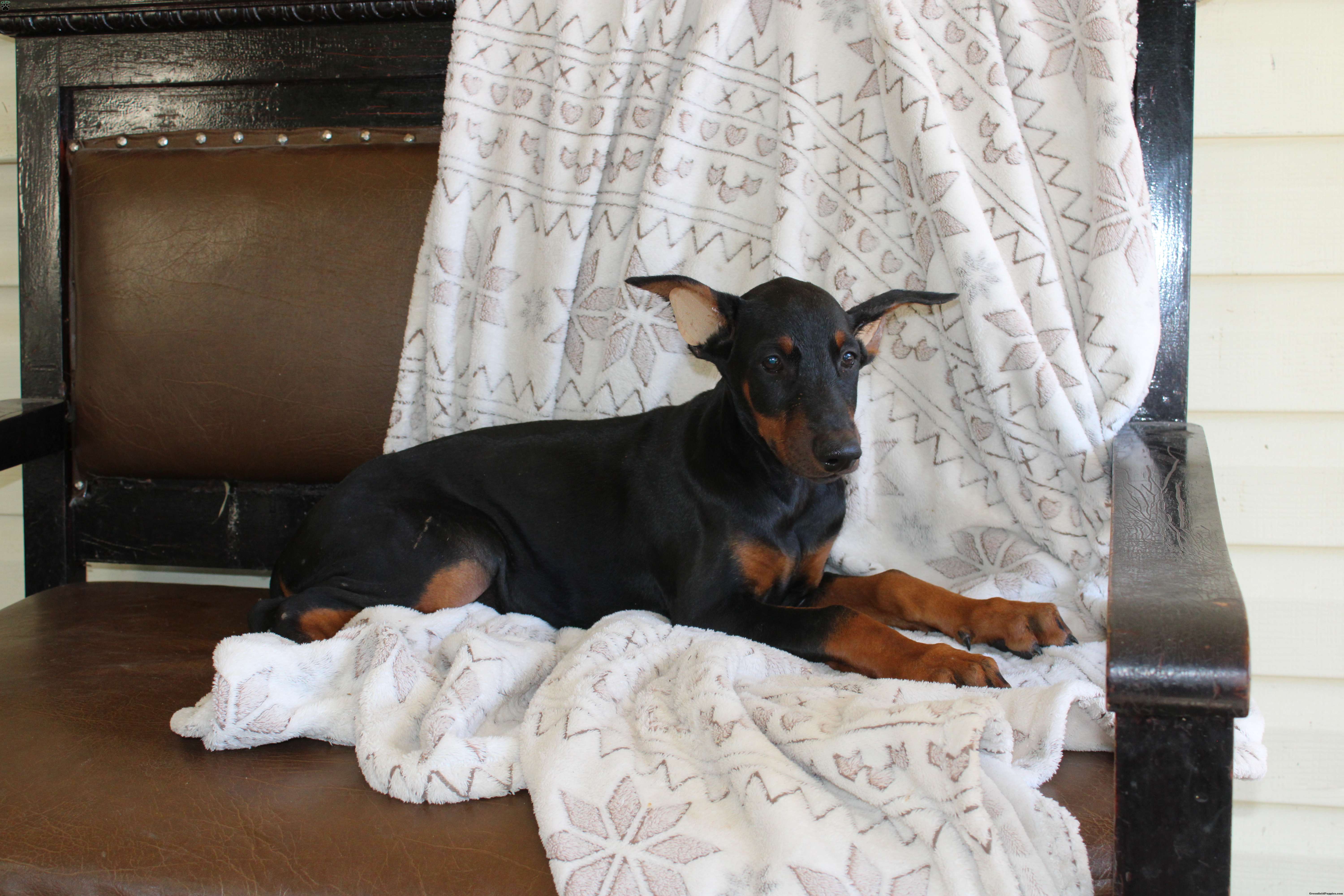 Here comes Sunshine a Doberman Pinscher puppy who is already ahead of the game! She comes from two purebred parents Queen & Tucker and is up to date on shots and dewormer and vet checked! If you are looking for a bold and noble breed to watch over your home contact us today!
