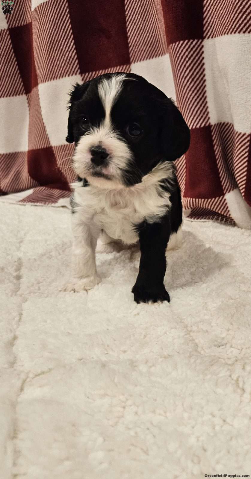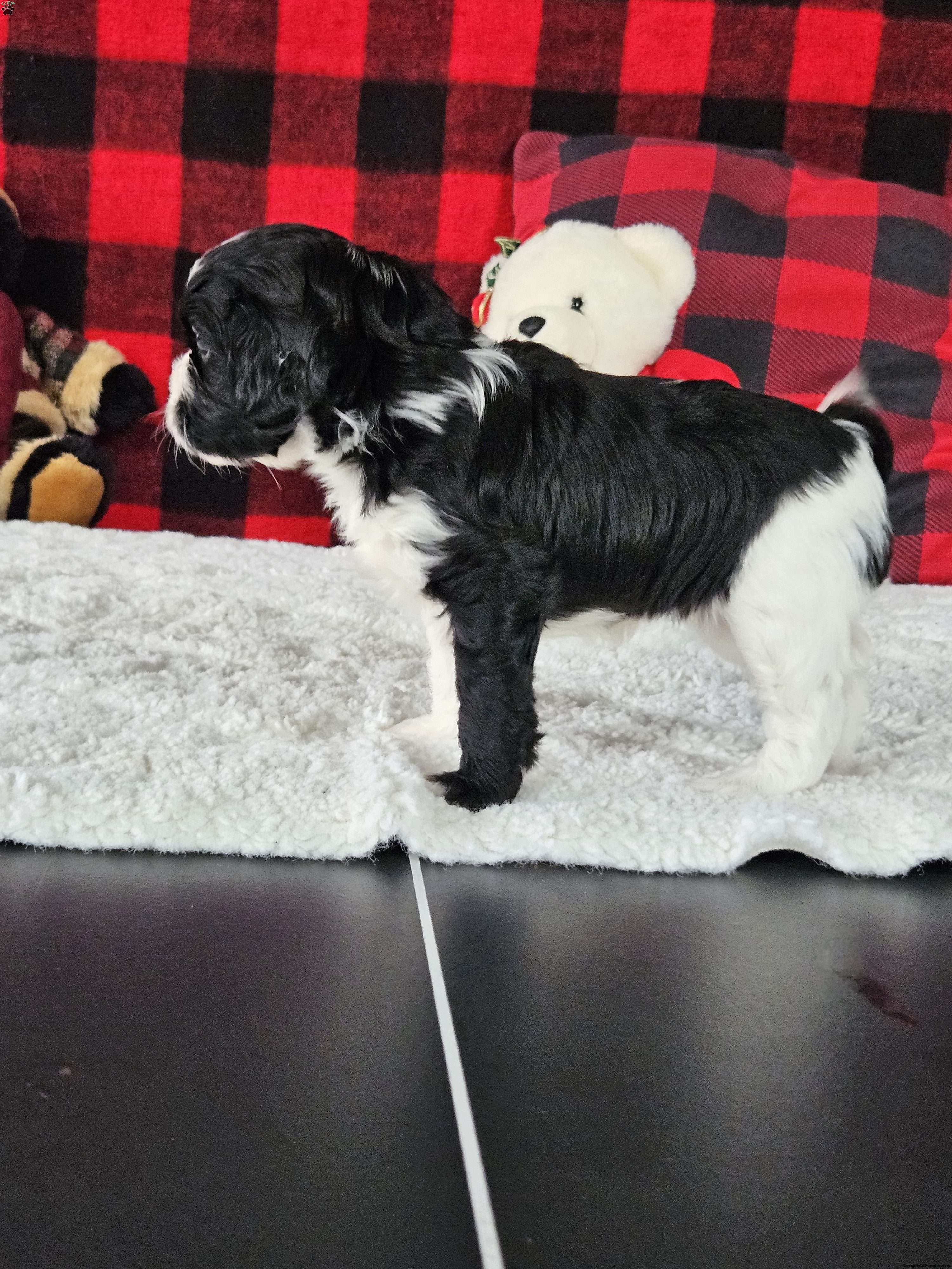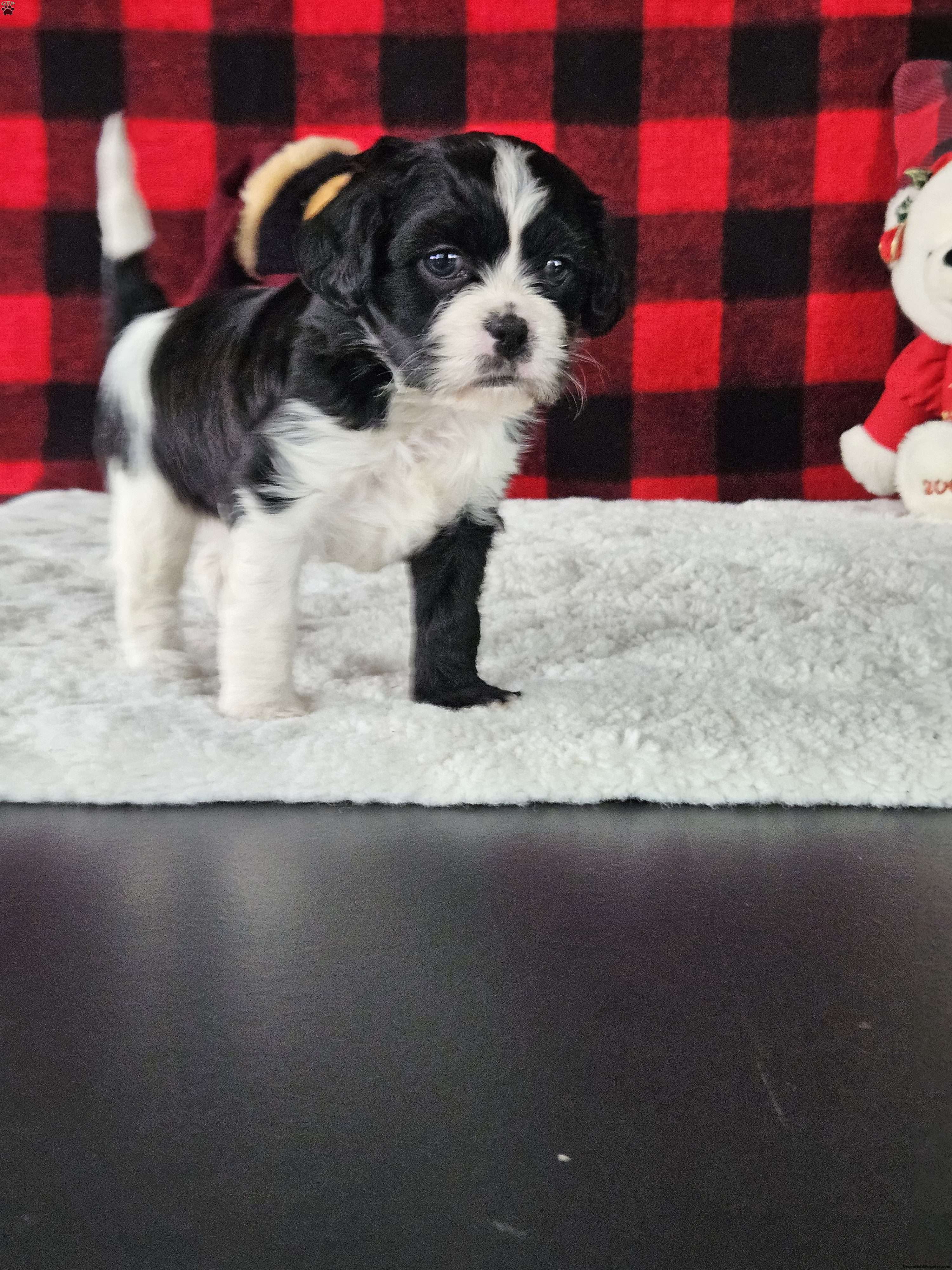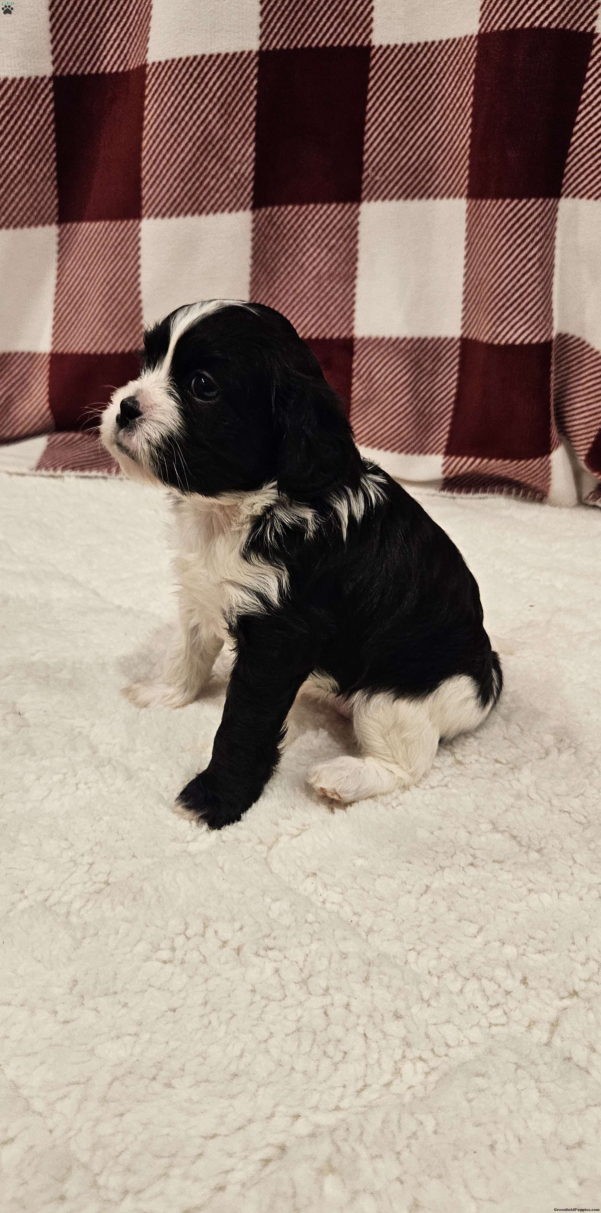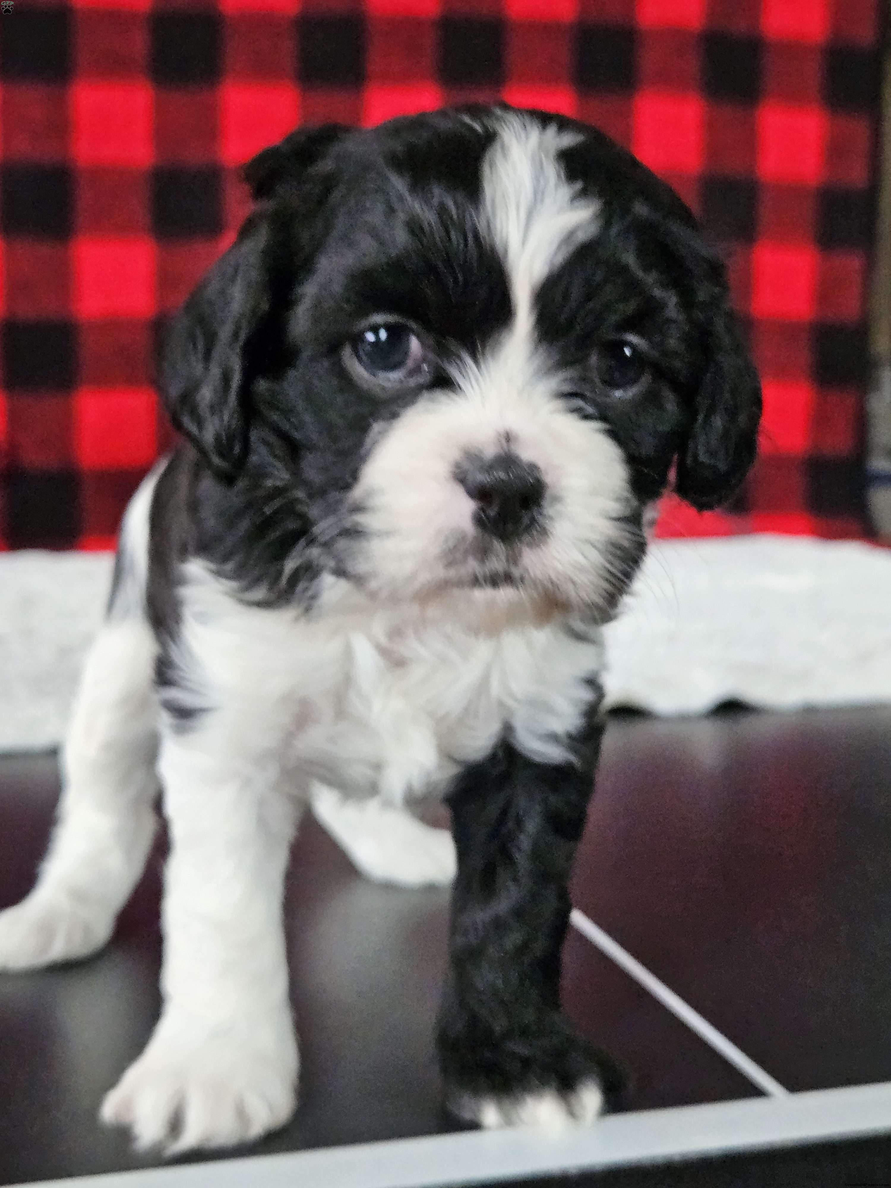 Cookie is the quiet one, but loves to just hangout with us! Cookie is unique with 1 white front leg and 1 black one. She is sweet like her daddy Alfie, a cavalier. Yet she’s playful and smart like her momma Sally a shitzu-bichon. Cookie was born in our garage and she has been well socialized! She has been started with going potty on a pee pad. Cookie will be vet checked and started on her vaccinations before he leaves for her forever home.