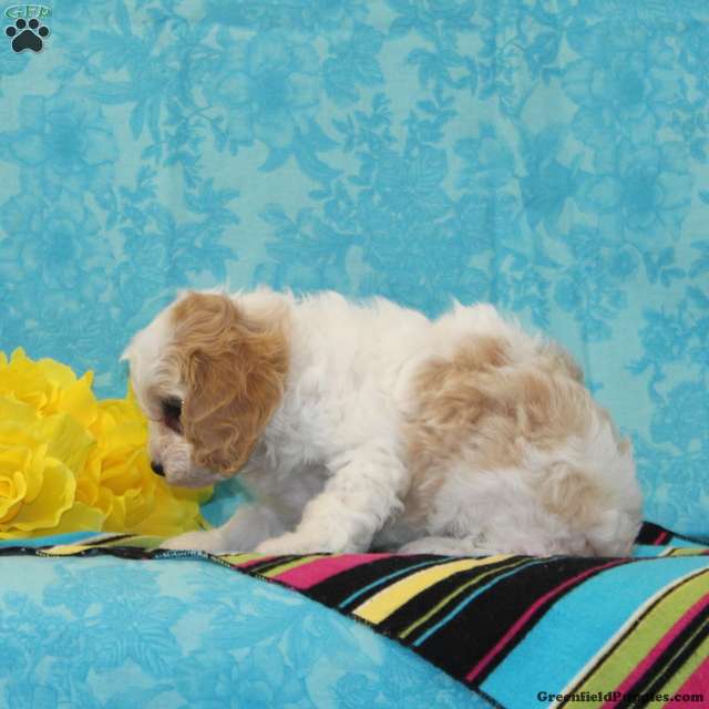 Customer request! So many love the cavapoos and bichpoos, and recentlyl someone requested that we do this mix. So here you are! Very adorable…..Hyacinth, our bichpoo mom, weighs in at 13 lbs. She is a love bug — so calm and sweet. Always very watchful and ready for play. Amos our cavalier daddy weighs in at 11.6 lbs. He is small and petite for a cavalier. Very gentle, devoted, loves to be right by my side. These little ones are well socialized, so sweet, just waiting for someone to love! They are up to date on their vaccinations and dewormings, and have been vet checked. They are looking for their forever homes. Feel free to call with questions, or to set up a time to come visit them. Thanks,