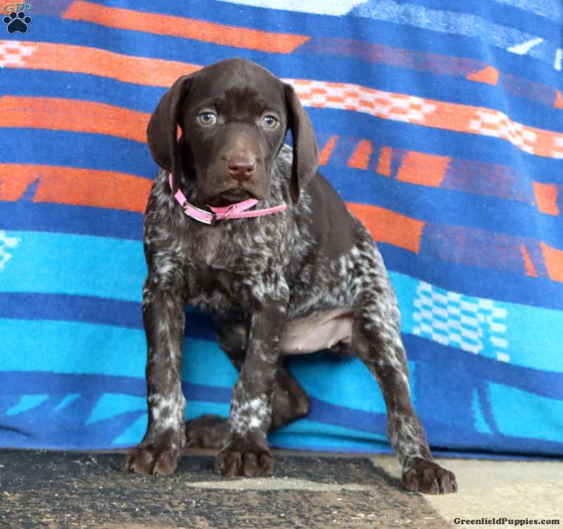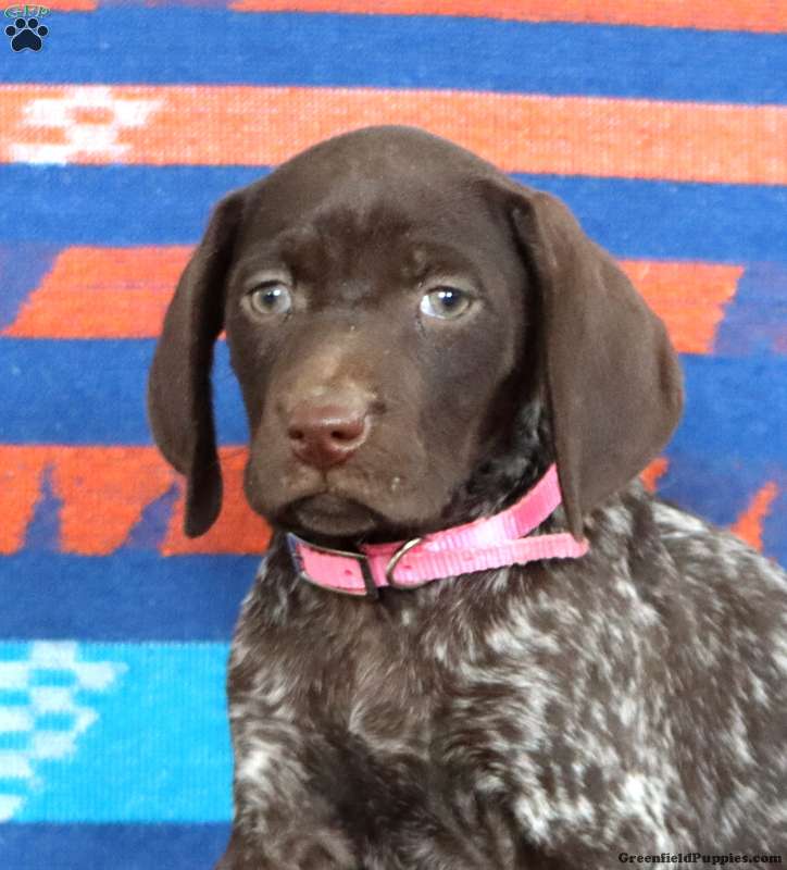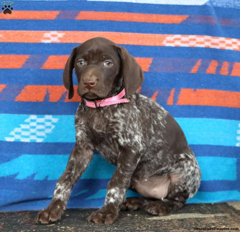 This beautiful German Shorthaired Pointer puppy is smart and loves to explore! Karla can be registered with the AKC and comes home with a 30 day health guarantee and an extended genetic health guarantee, both provided by the breeders. This cutie has been seen by a vet and is up to date on shots and de-wormer. Karla is socialized and ready to meet you!