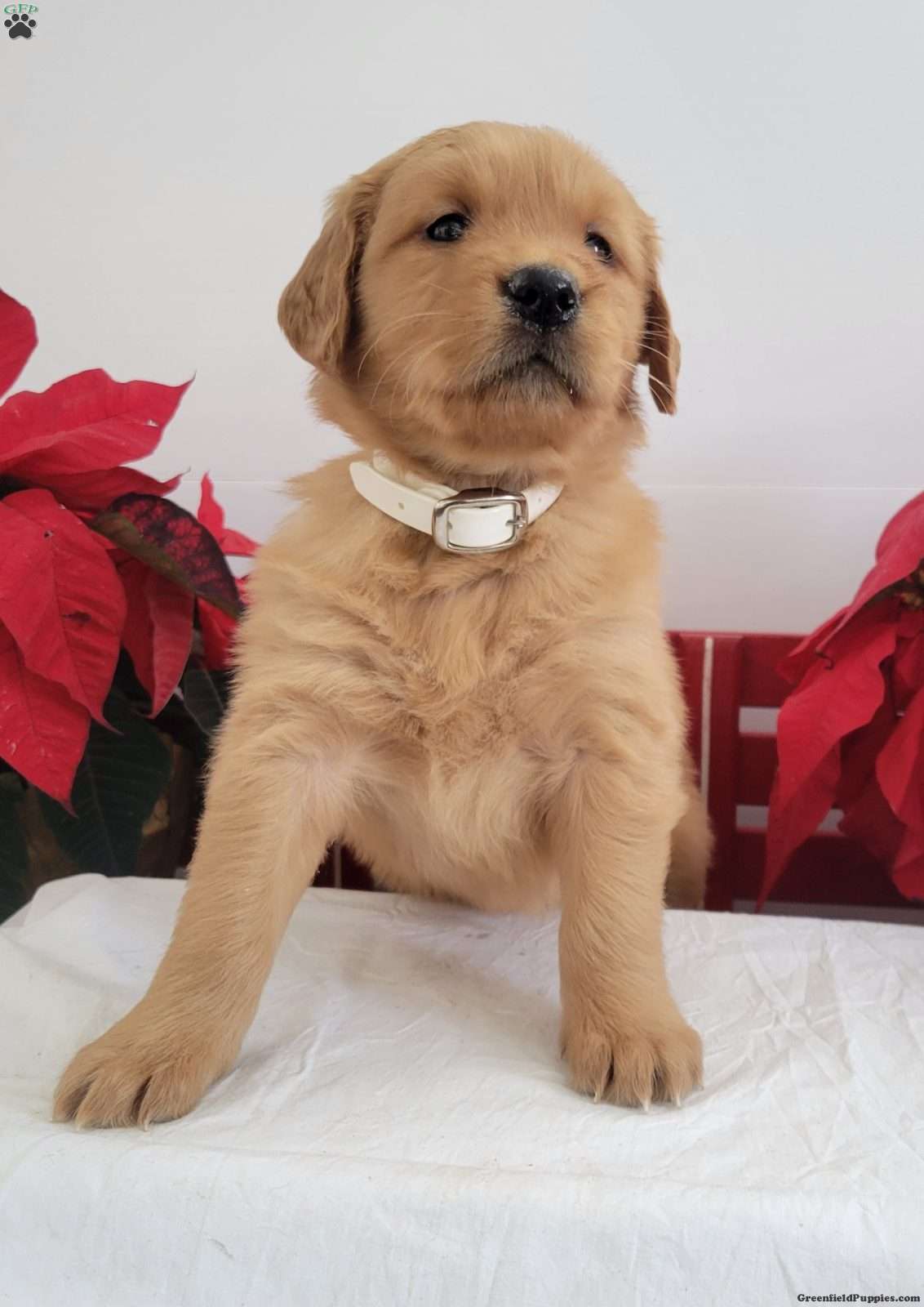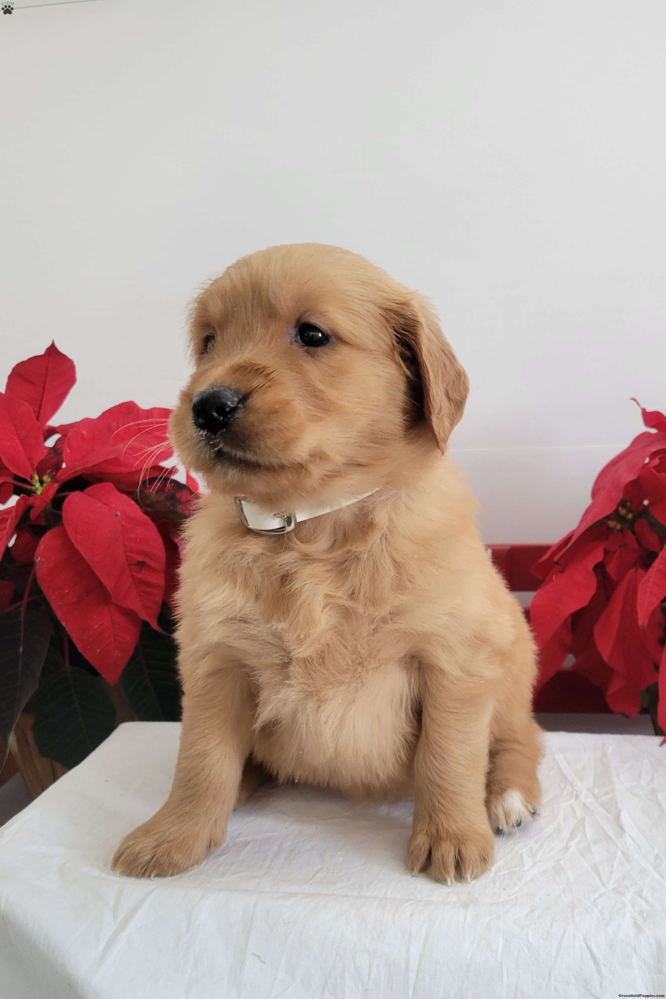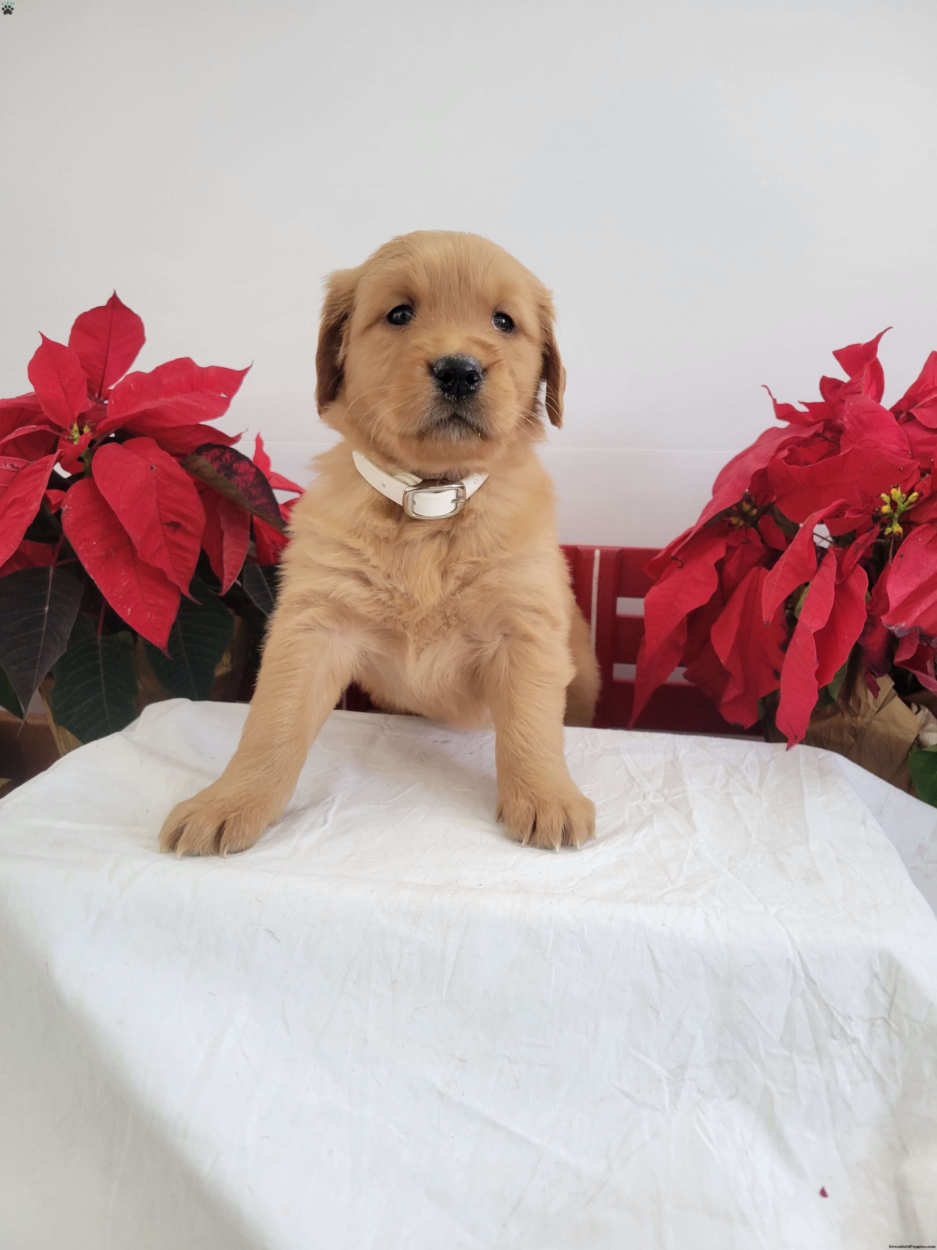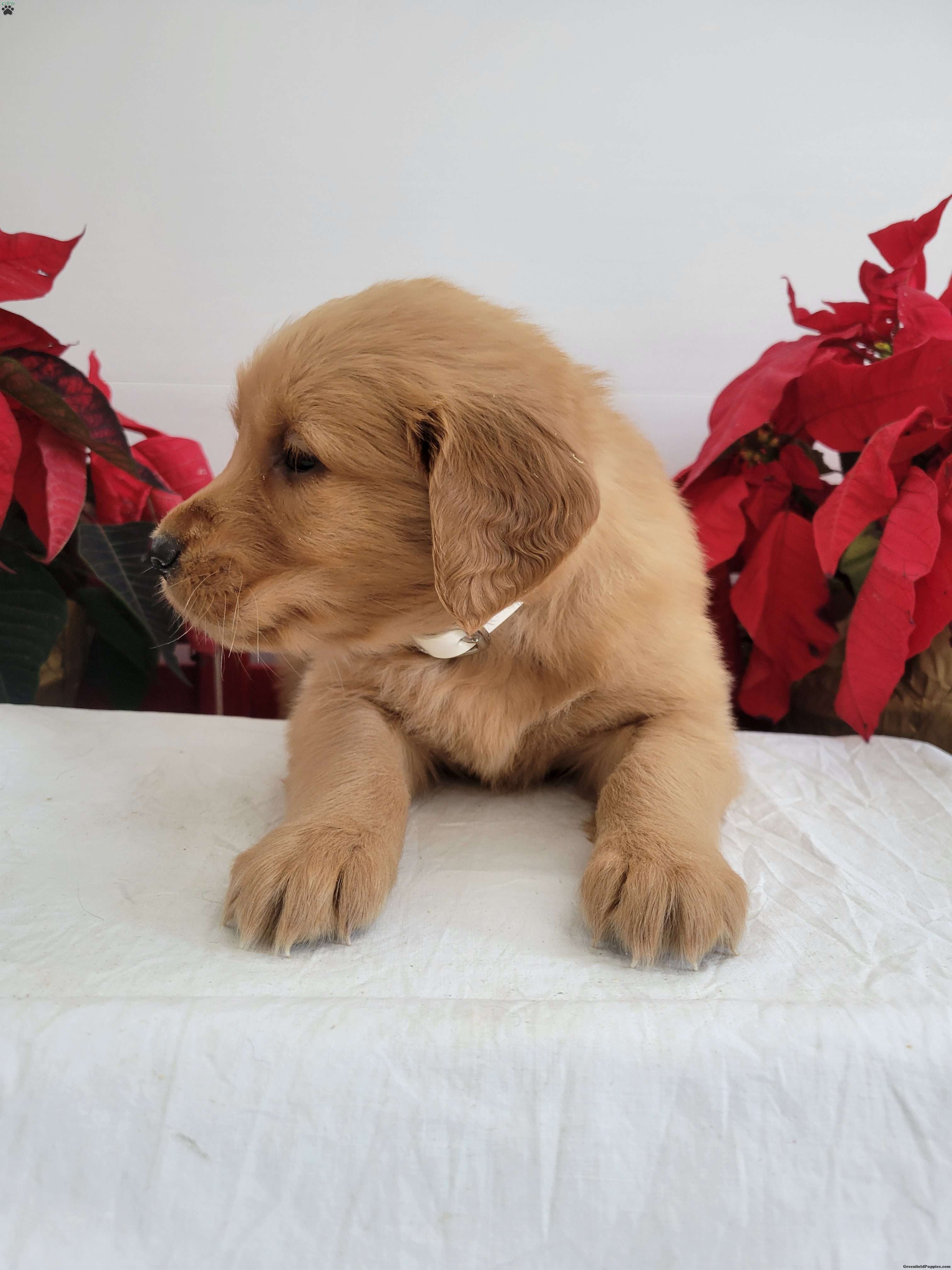 Cora is a friendly, outgoing pup with a sweet temperament and playful personality. She was born on 11/04/2025.  Her dam is Cindy, a 50-60-lb AKC registered golden retriever who has a friendly, calm demeanor, and her sire Banjo is an AKC-registered golden retriever.