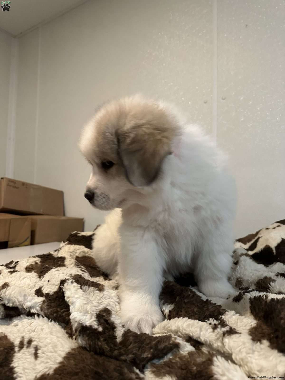 White puppy with black “badger face” spots born on certified organic dairy and poultry farm to parents that help guard free range chickens on pasture.  Parents and puppies are well loved by 9 kids between the 2 families that live on the farm.  This is the mother’s first litter; she is 5 years old.