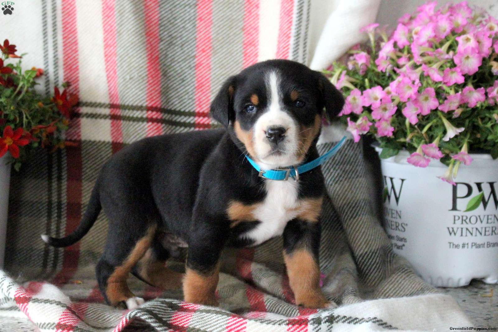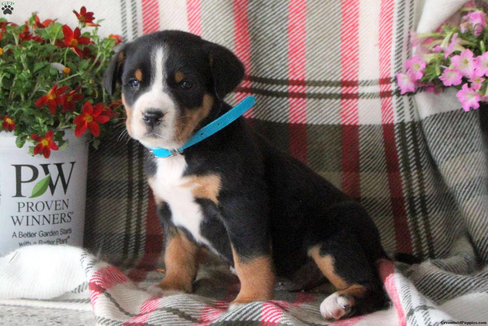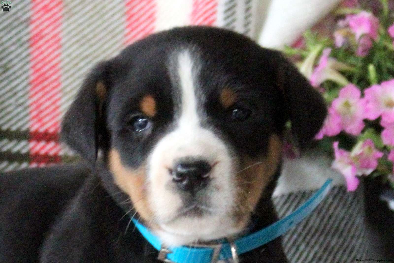 Chester is a happy Greater Swiss Mountain Dog puppy who loves to play! This cutie comes home with a health guarantee provided by the breeder, plus will be seen by a vet and kept up to date on shots and de-wormer. Chester is socialized, family raised with children, and ready to meet you!