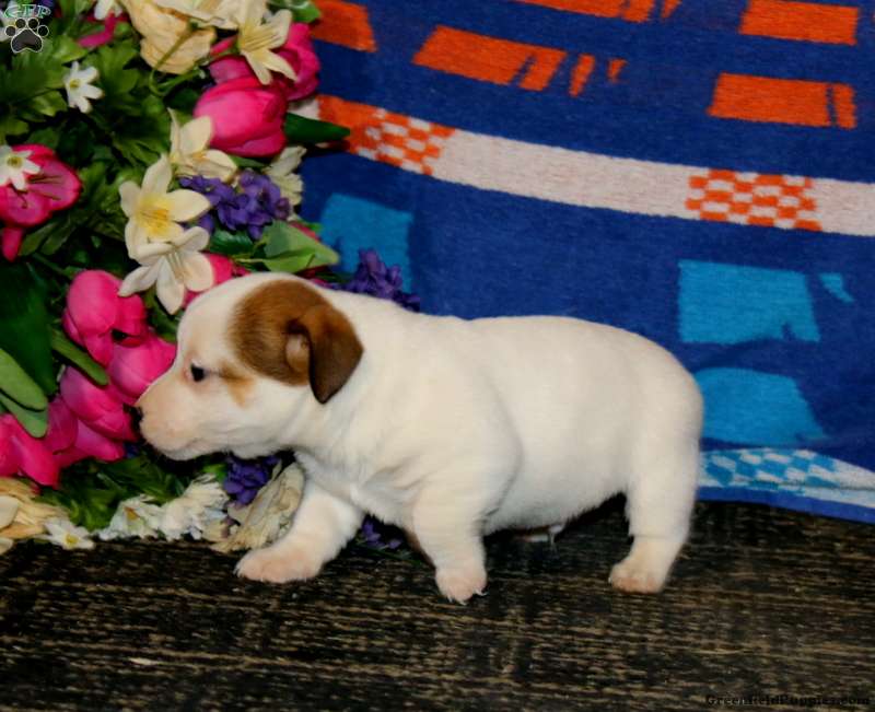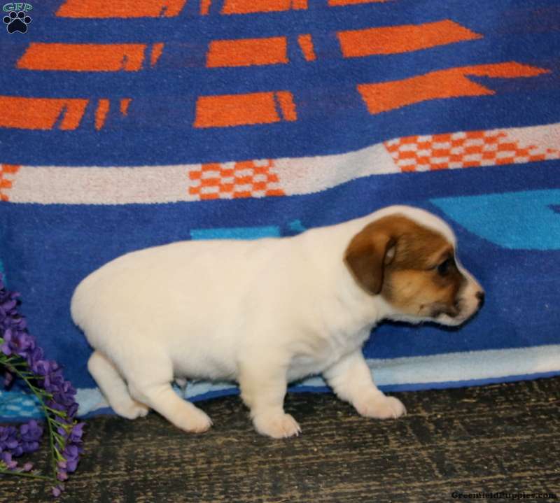 Sammy is a sweet Jack Russell Terrier puppy who loves to play. This cutie is lovable and fun! Sammy is socialized and  ready to meet you. Vet checked and up to date on shots and de-wormer, this beautiful pup comes home with a health guarantee provided by the breeders. Sammy will be a wonderful addition to her forever family!