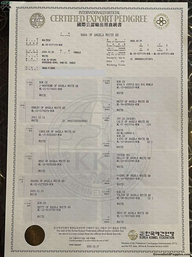 The Sire is a Korean Maltese. The Dam was imported from Korea. This puppy has Champion Bloodlines.
