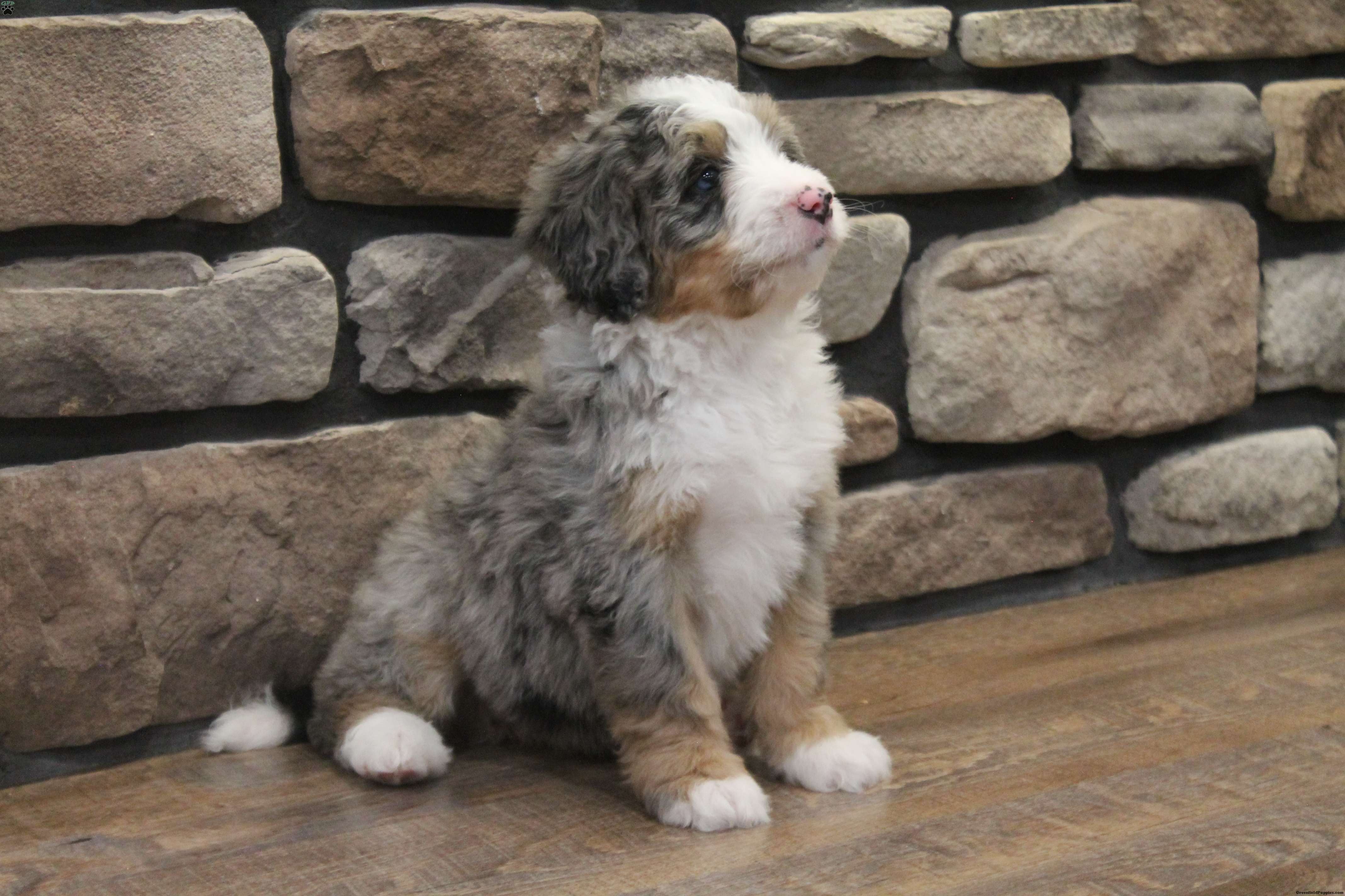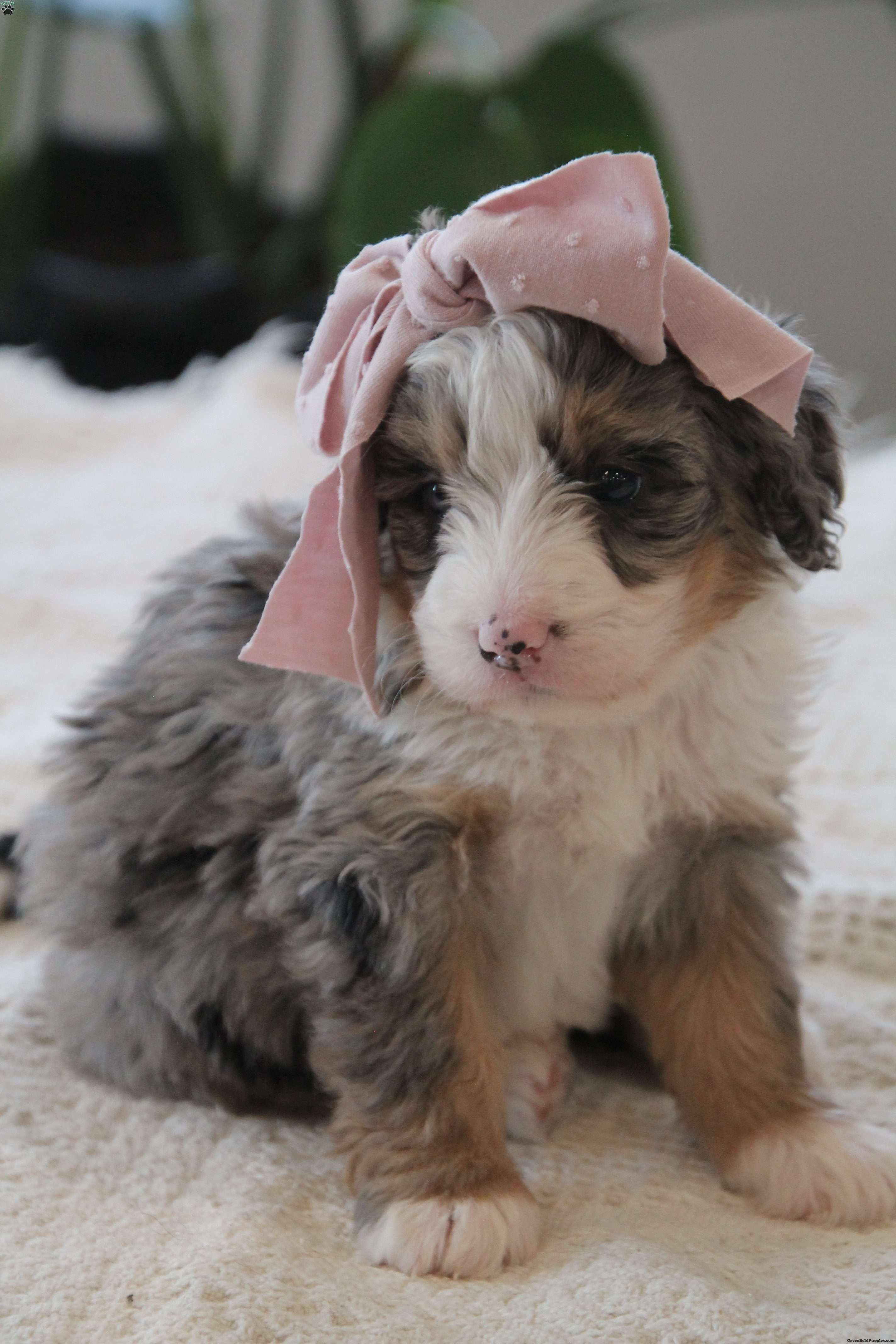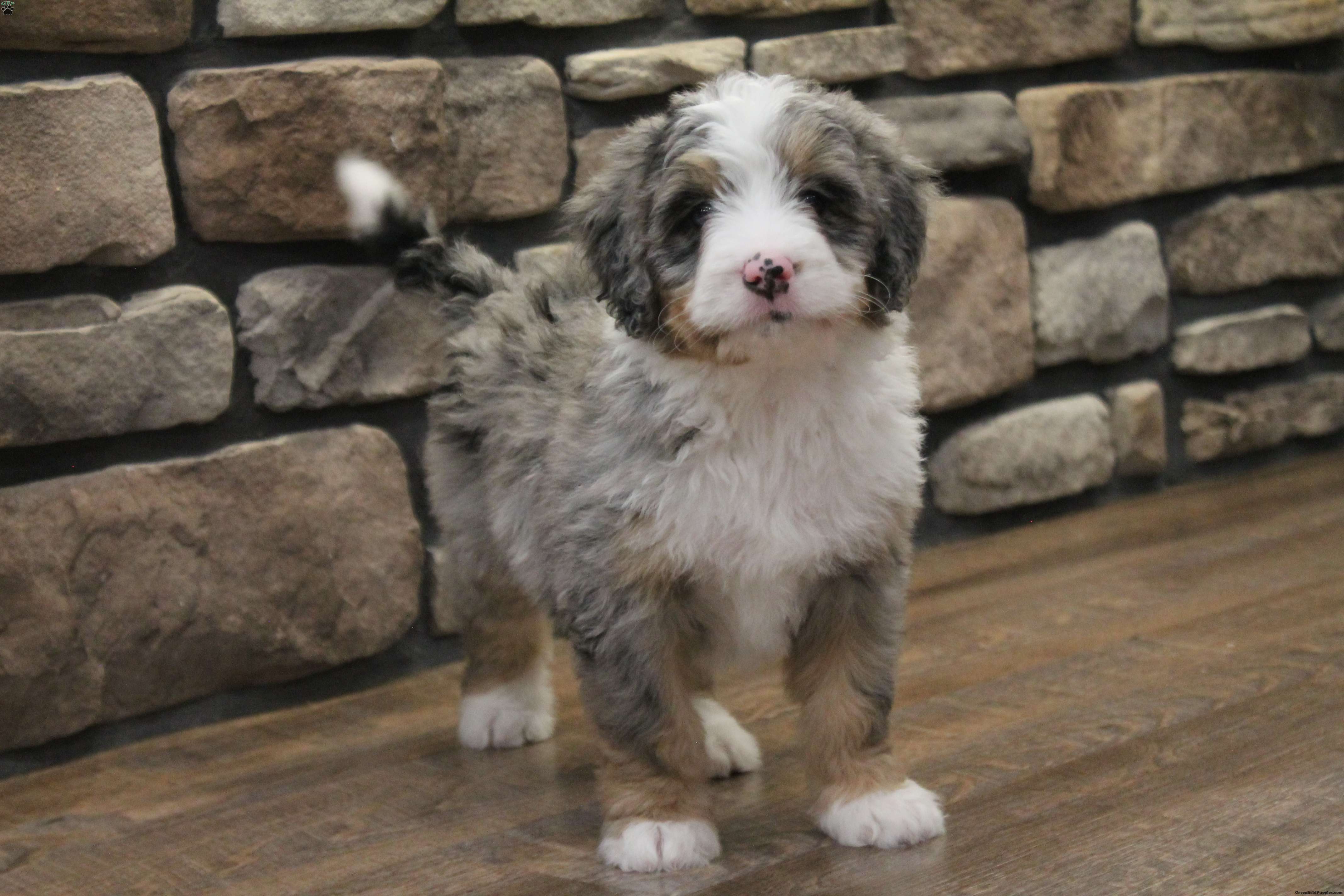 Are you looking to add joy to your life with a curly haired and playful friend? Then our f1 mini bernedoodle Elise might be the puppy for you. We like Elise because of her bright eyes, her beautiful merle coat, and her friendly personality. Her dad, Denali, is a mini poodle weighing 15 pounds. Her mom, Oakley, is our Bernese Mountain Dog and weighs 90 pounds. Elises expected full grown weight is 25-45 pounds. Elise will have been to the vet to ensure that she is in good health, has had her dew claws removed, is up to date on vaccinations and dewormer, and is microchipped. To take along to her new home, Elise comes with a collar and a small bag of his current puppy food to make her transition easier. She also comes with a one year health guarantee. Elise will be ready for her new home on February 13. We accept non refundable deposits through PayPal. We are happy to answer any questions concerning our puppies by call or text. We prefer call / texts instead of email if possible. Thank you! Andrew and Savannah King