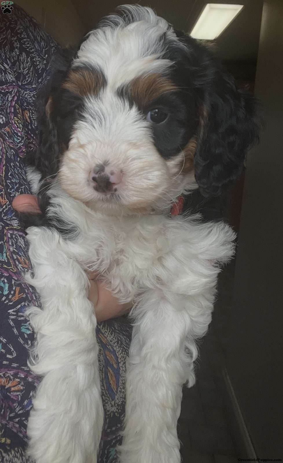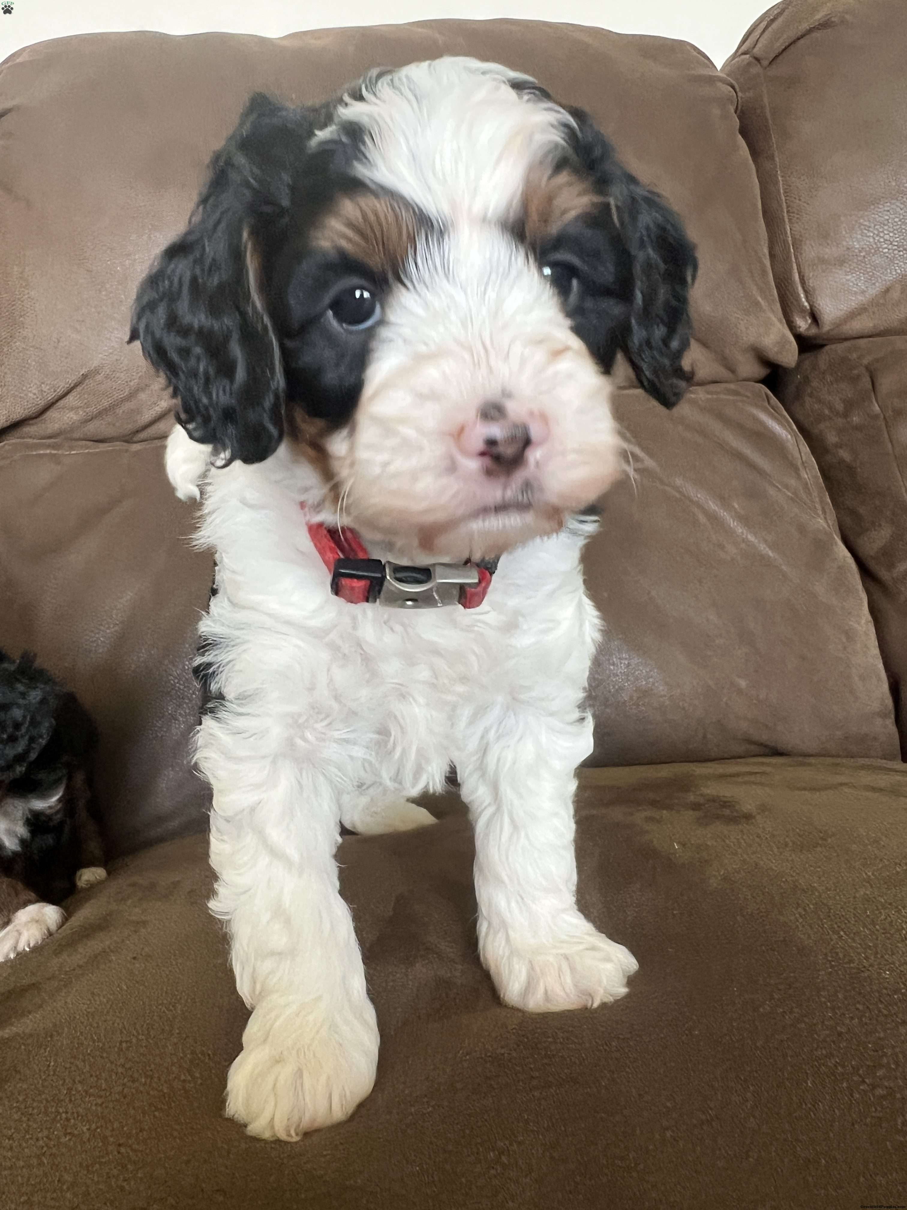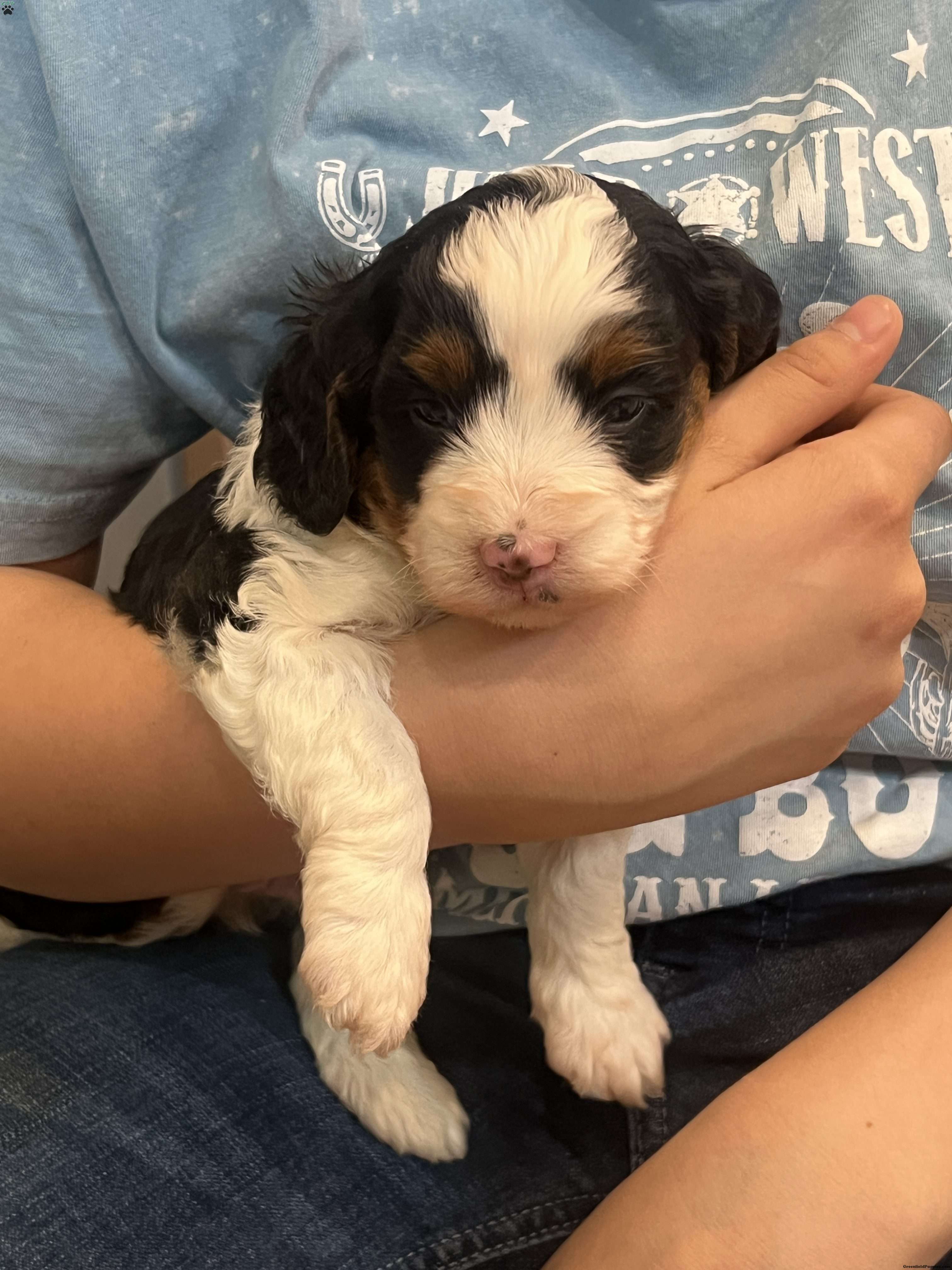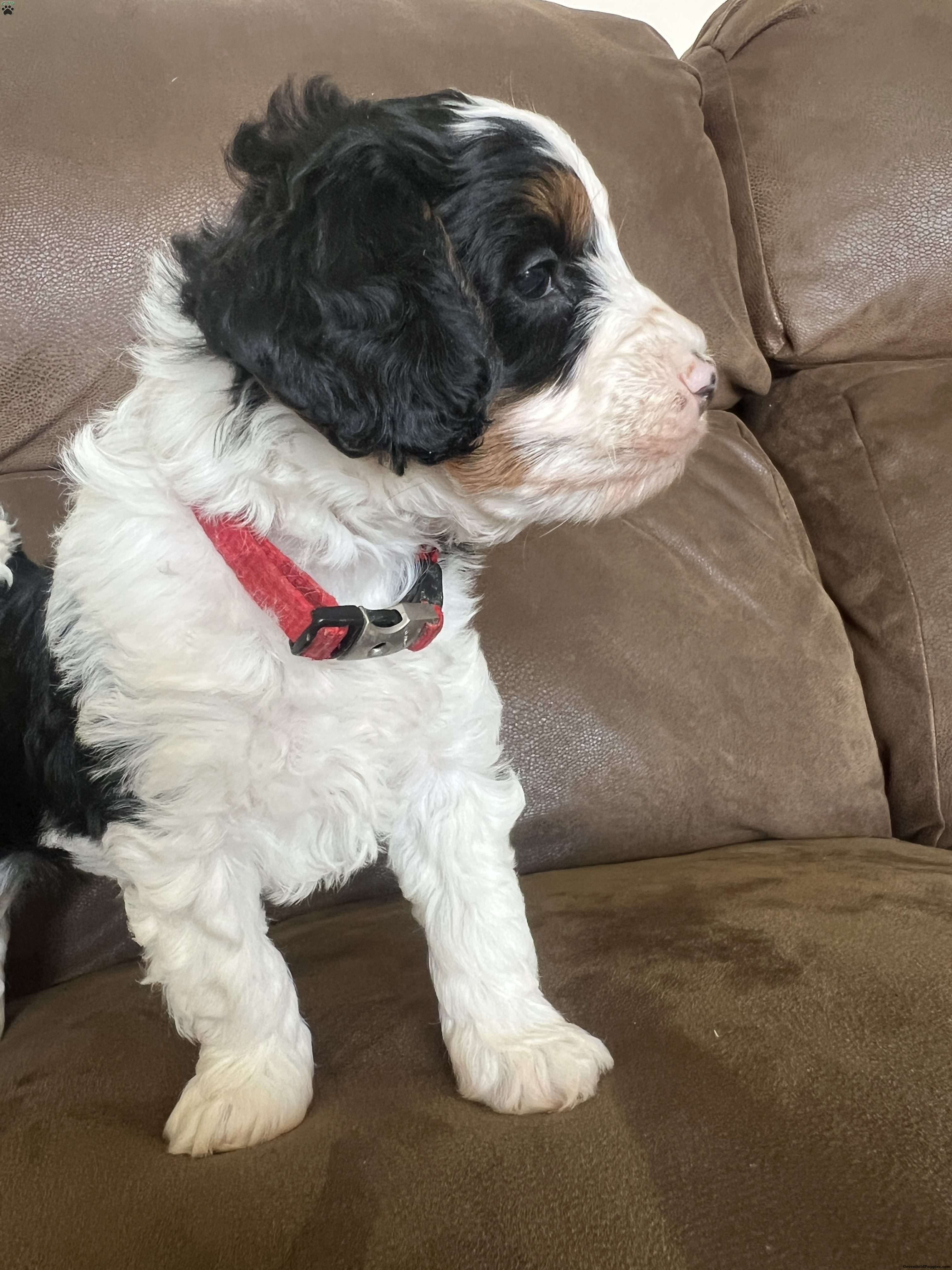 Kenny is a multigen Mini Bernadoodle anticipated to be 20 pounds full grown. He is a playful and fun pup, not afraid to explore something new.