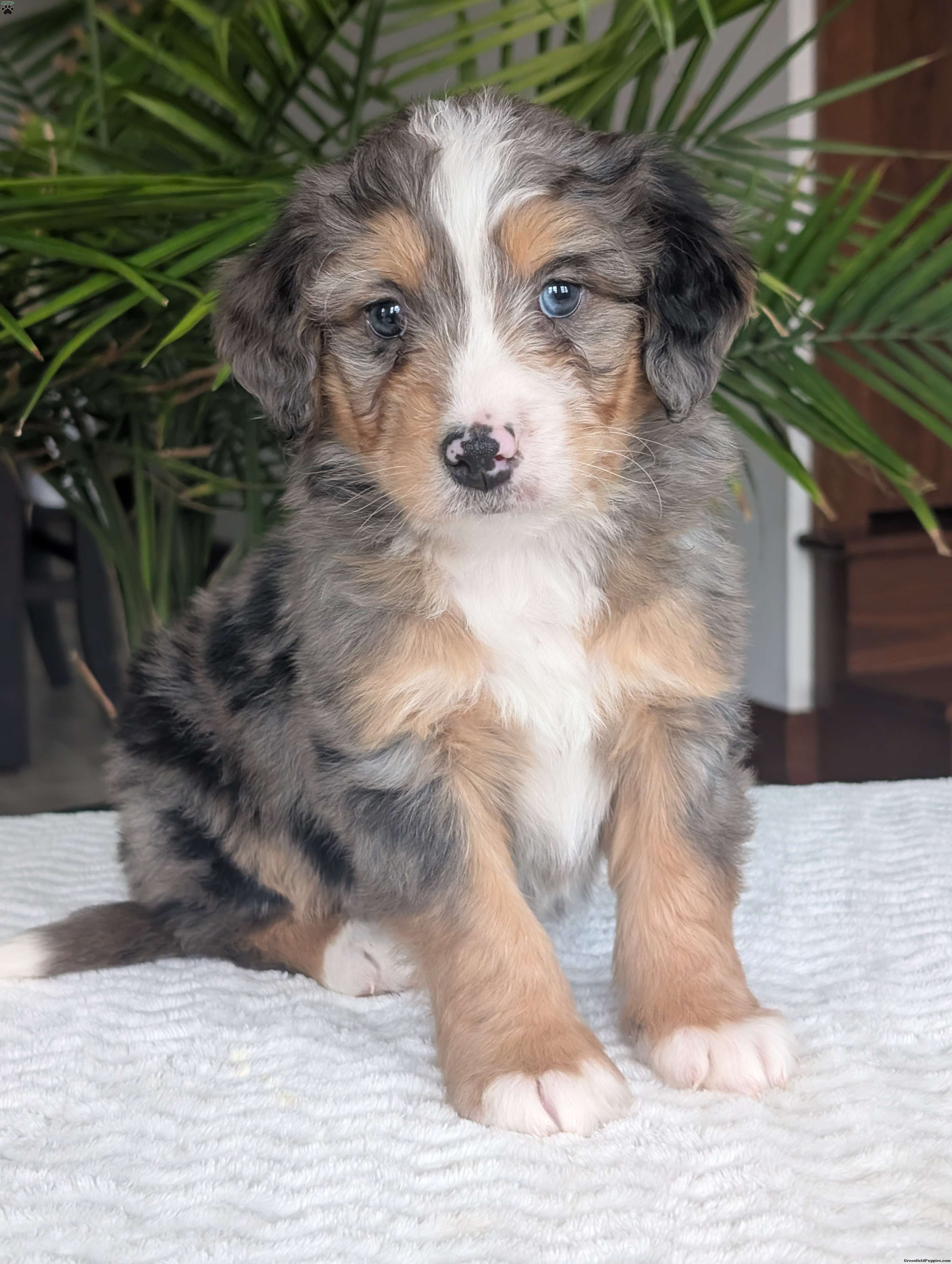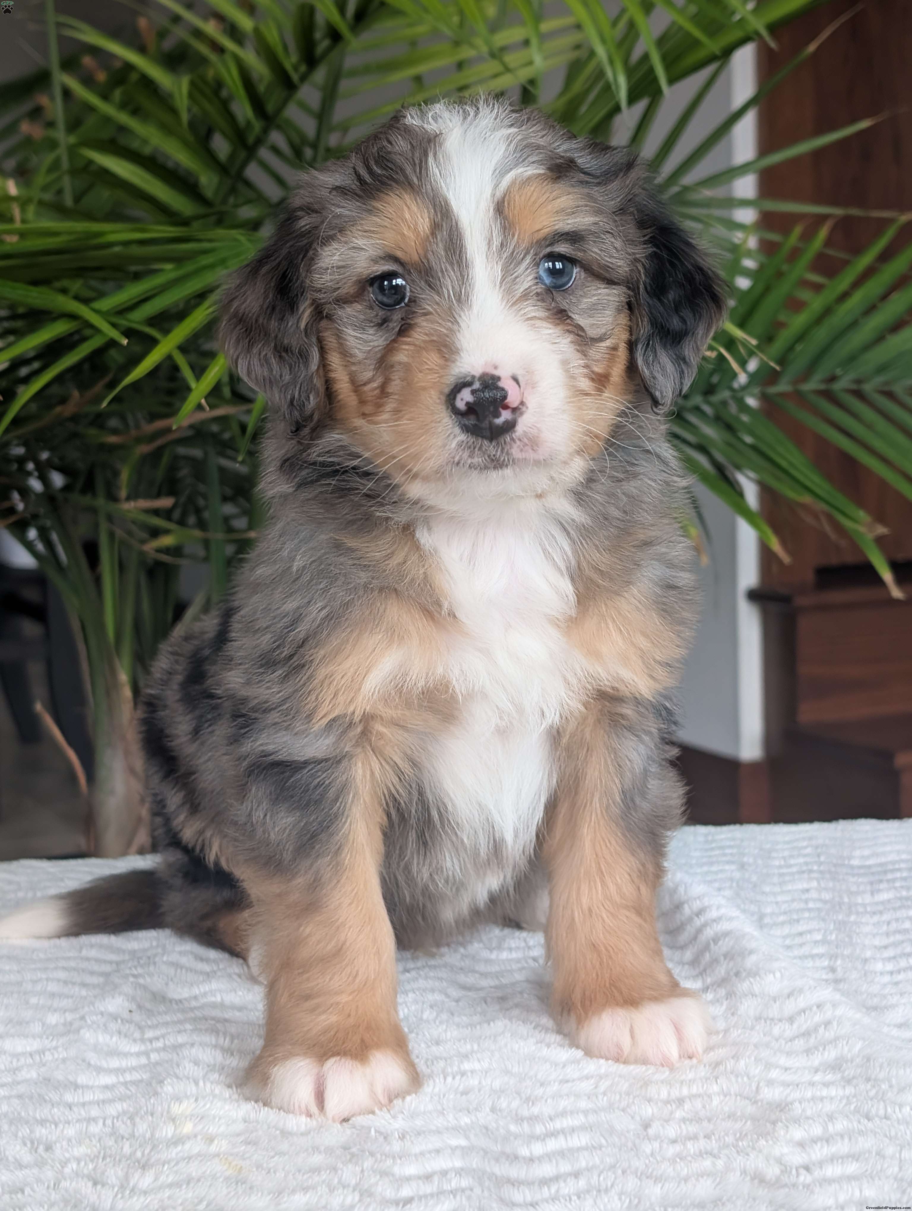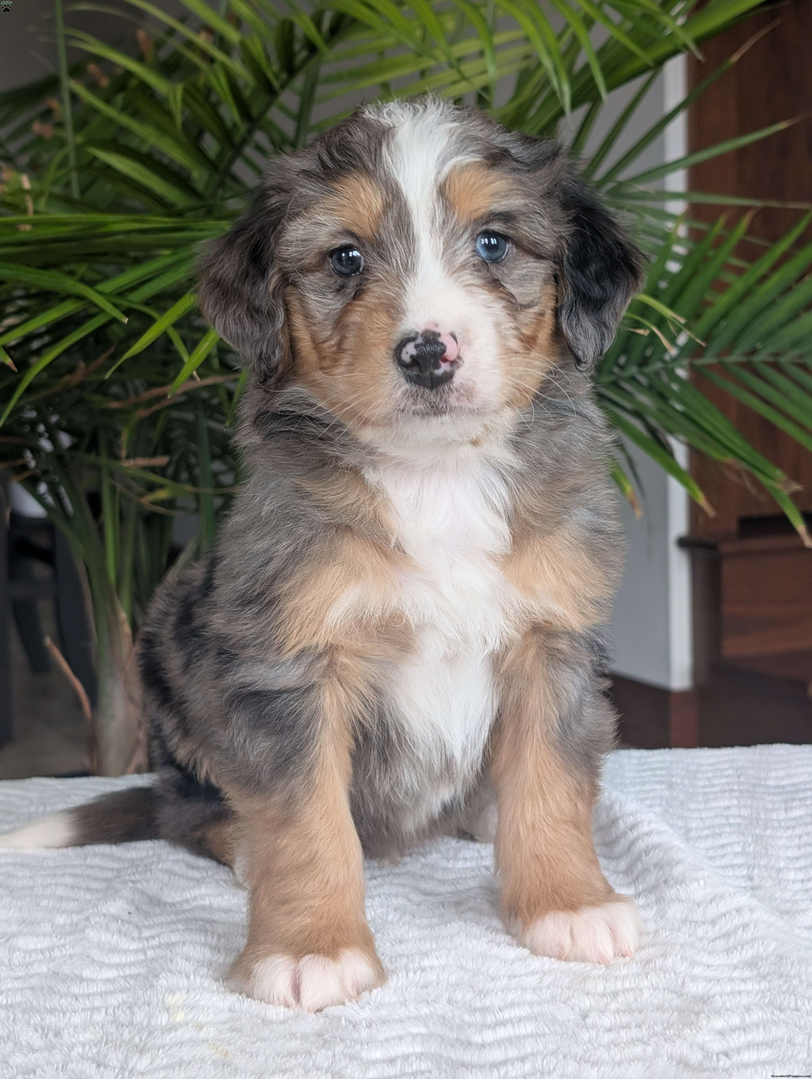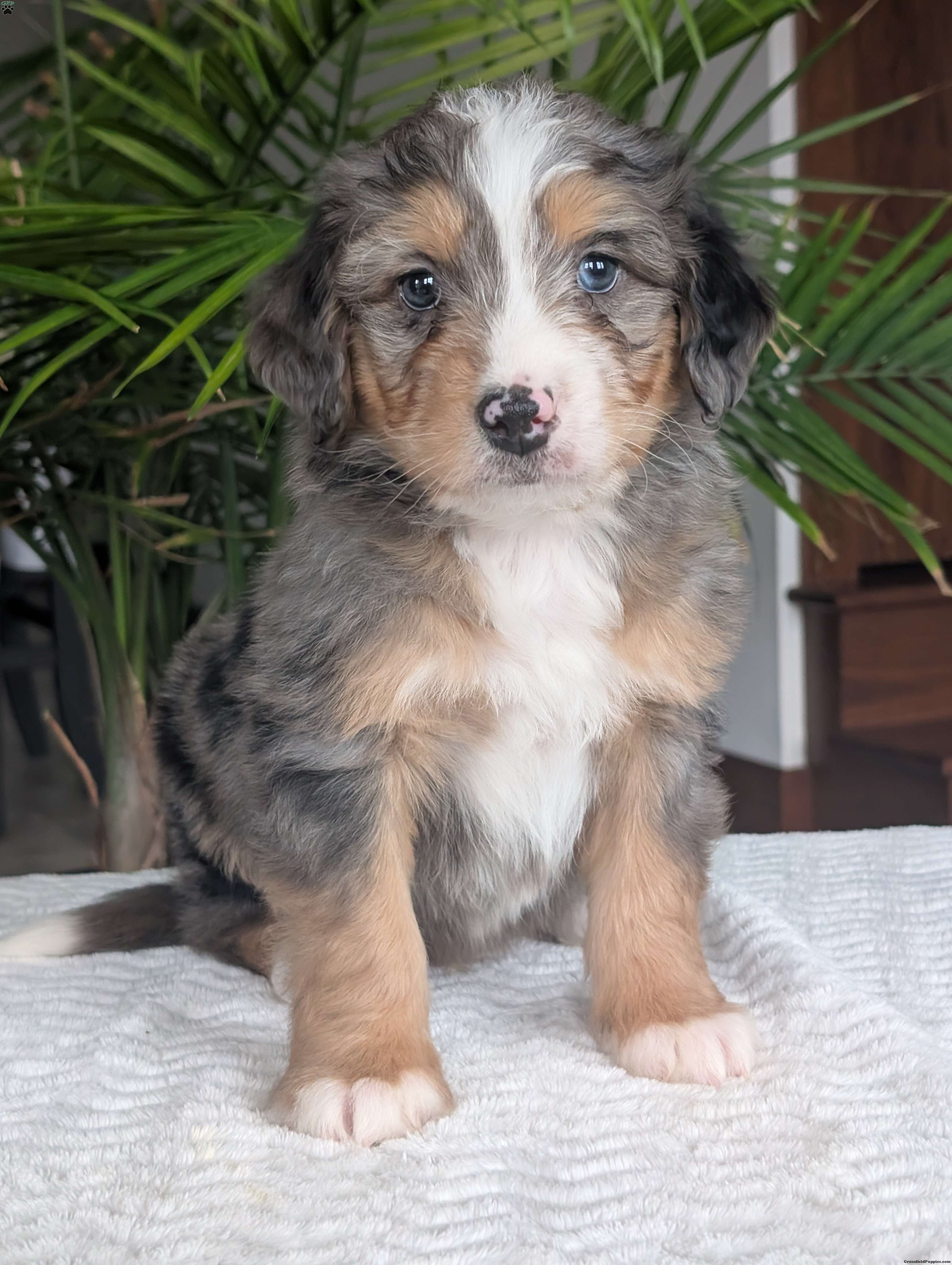 Check out precious little boy, Mini Niko, he is a beautiful blue-merle mini bernedoodle with a beautiful coat of soft wavy hair! Mini Niko a very precious and sweet little boy, he is very cuddly and squishy;) he is sure to melt your heart with all his cuteness! His momma is a beautiful Bernese mountain dog and dad is a handsome mini poodle, dad weighs 13lbs and momma weighs 78lbs. Mini Niko will be between 25 and 35lbs fully grown. If you are looking for a forever friend, someone to brighten up your day, go on walks or cuddle up on the couch you have found the perfect little pup Niko is sure to fill all those spots! Our puppies are family raised and very well socialized with kids! we guarantee a very happy, healthy and very well socialized puppy!