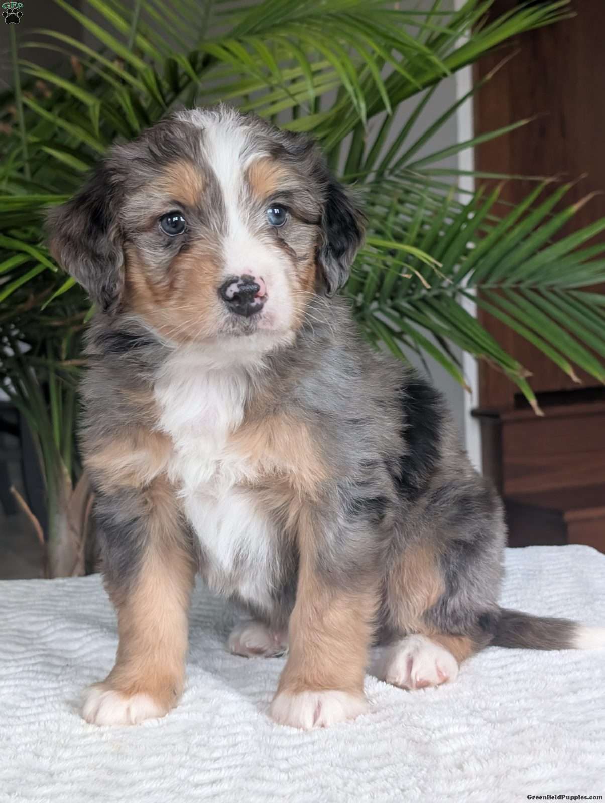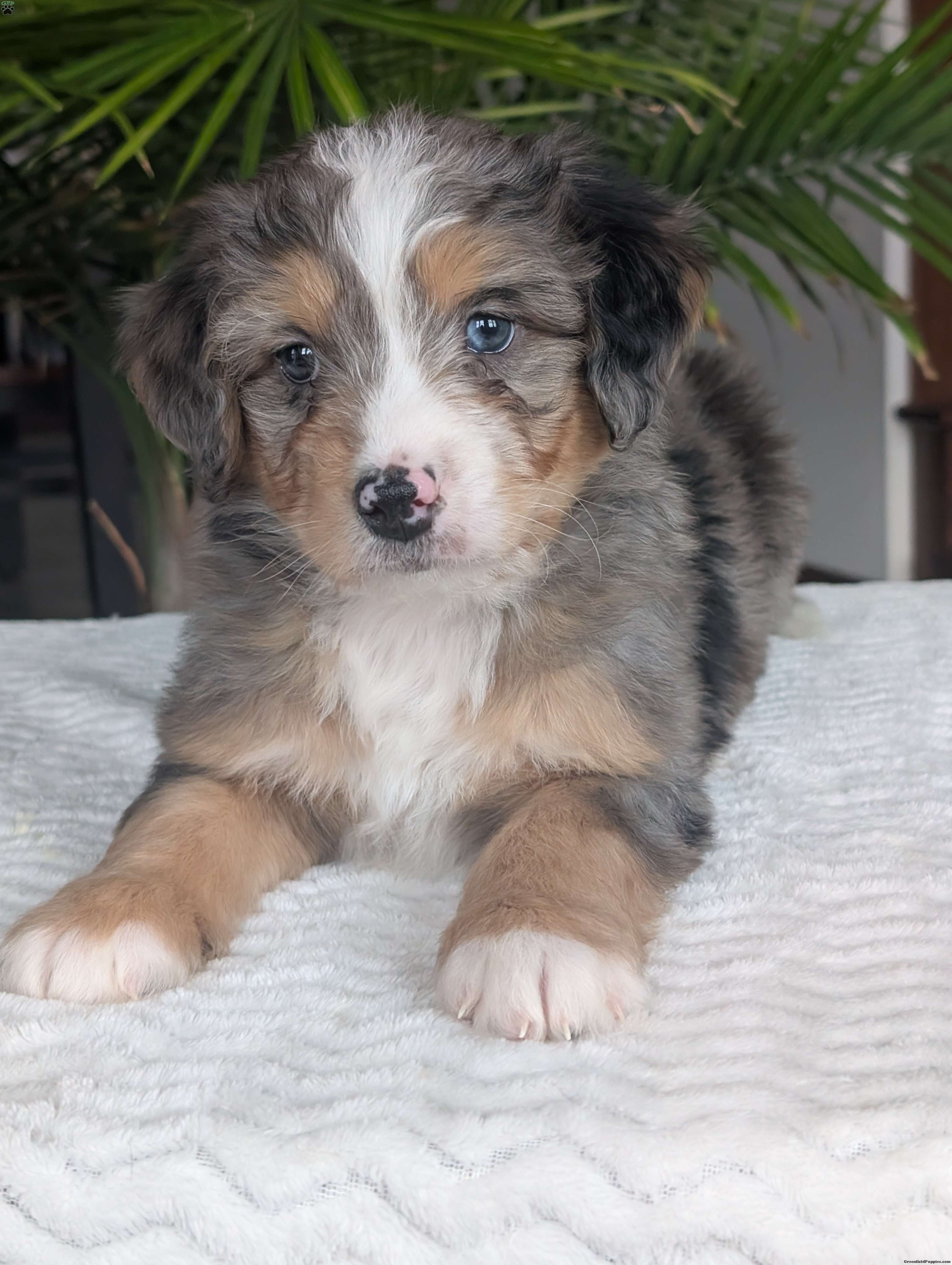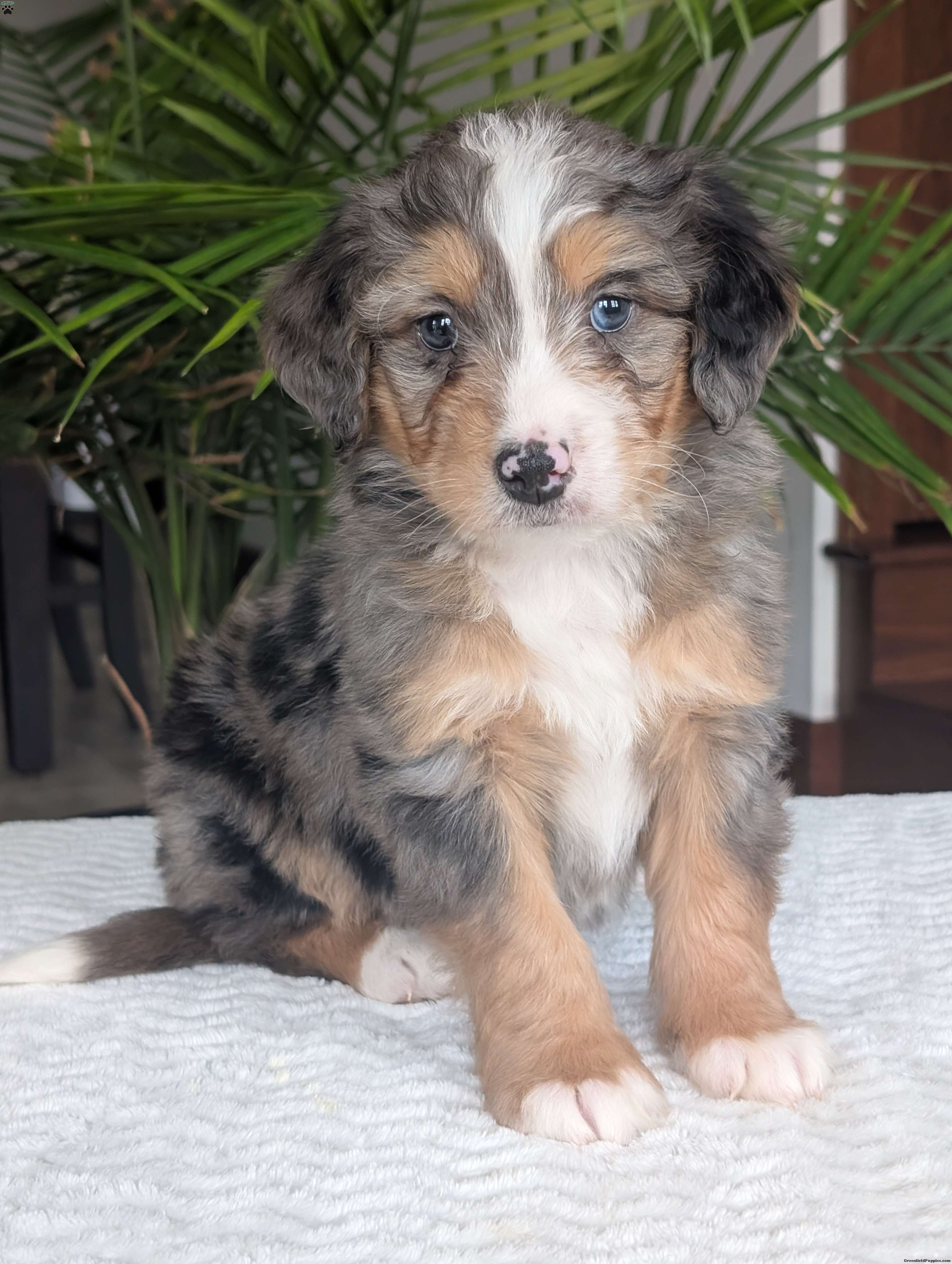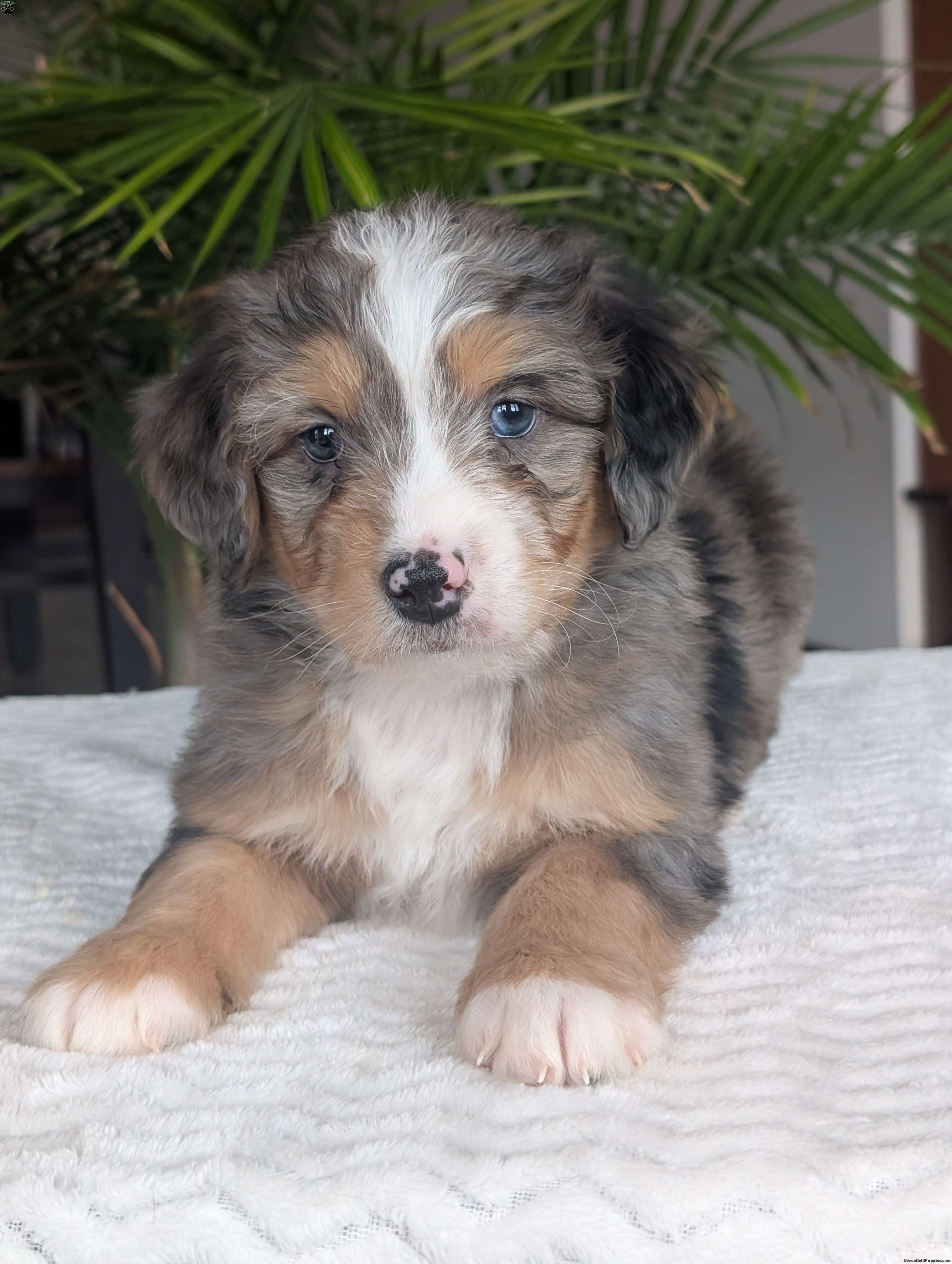 Check out precious little boy, Mini Niko, he is a beautiful blue-merle mini bernedoodle with a beautiful coat of soft wavy hair! Mini Niko a very precious and sweet little boy, he is very cuddly and squishy;) he is sure to melt your heart with all his cuteness! His momma is a beautiful Bernese mountain dog and dad is a handsome mini poodle, dad weighs 13lbs and momma weighs 78lbs. Mini Niko will be between 25 and 35lbs fully grown. If you are looking for a forever friend, someone to brighten up your day, go on walks or cuddle up on the couch you have found the perfect little pup Niko is sure to fill all those spots! Our puppies are family raised and very well socialized with kids! we guarantee a very happy, healthy and very well socialized puppy!