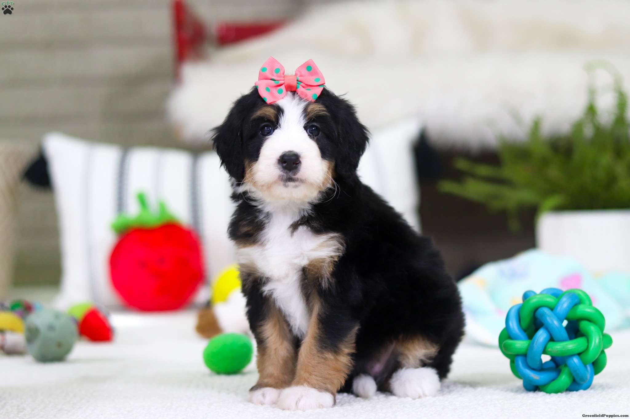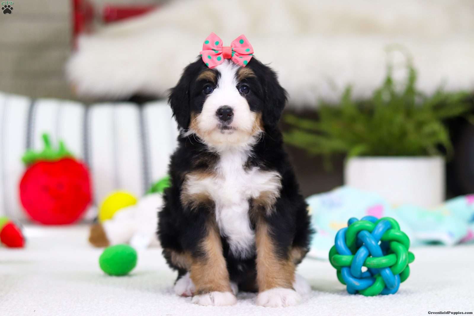 Hi, I’m Valentine! I’m a very cute Bernedoodle puppy with a fluffy coat and a sweet, loving personality. I love to play, explore, and make new friends, but I also enjoy snuggling up and giving lots of puppy kisses. I’m curious, happy, and full of energy, and I promise to fill my future home with joy and laughter. I can’t wait to meet my forever family and be their loyal, cuddly companion!