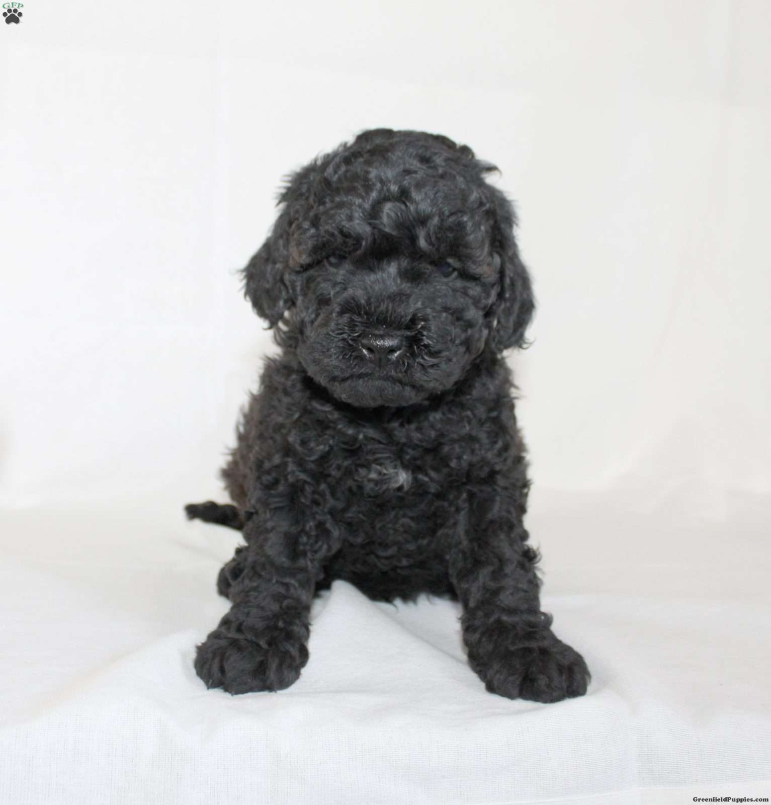 Benet has a dark, curly coat with a compact build and a small white marking on his chest. This breed is known for being loyal, intelligent, and eager to please, making them a practical choice for families.