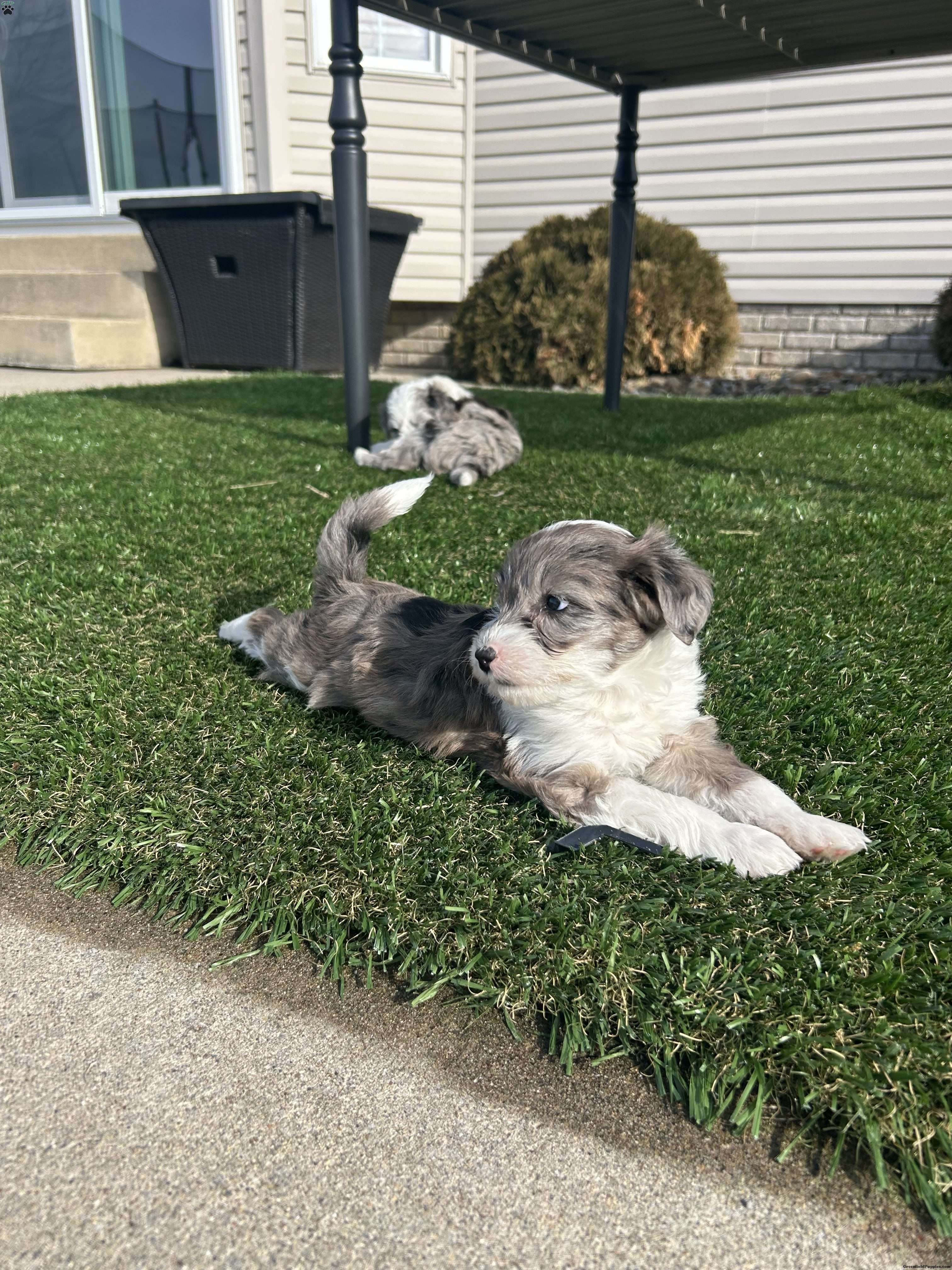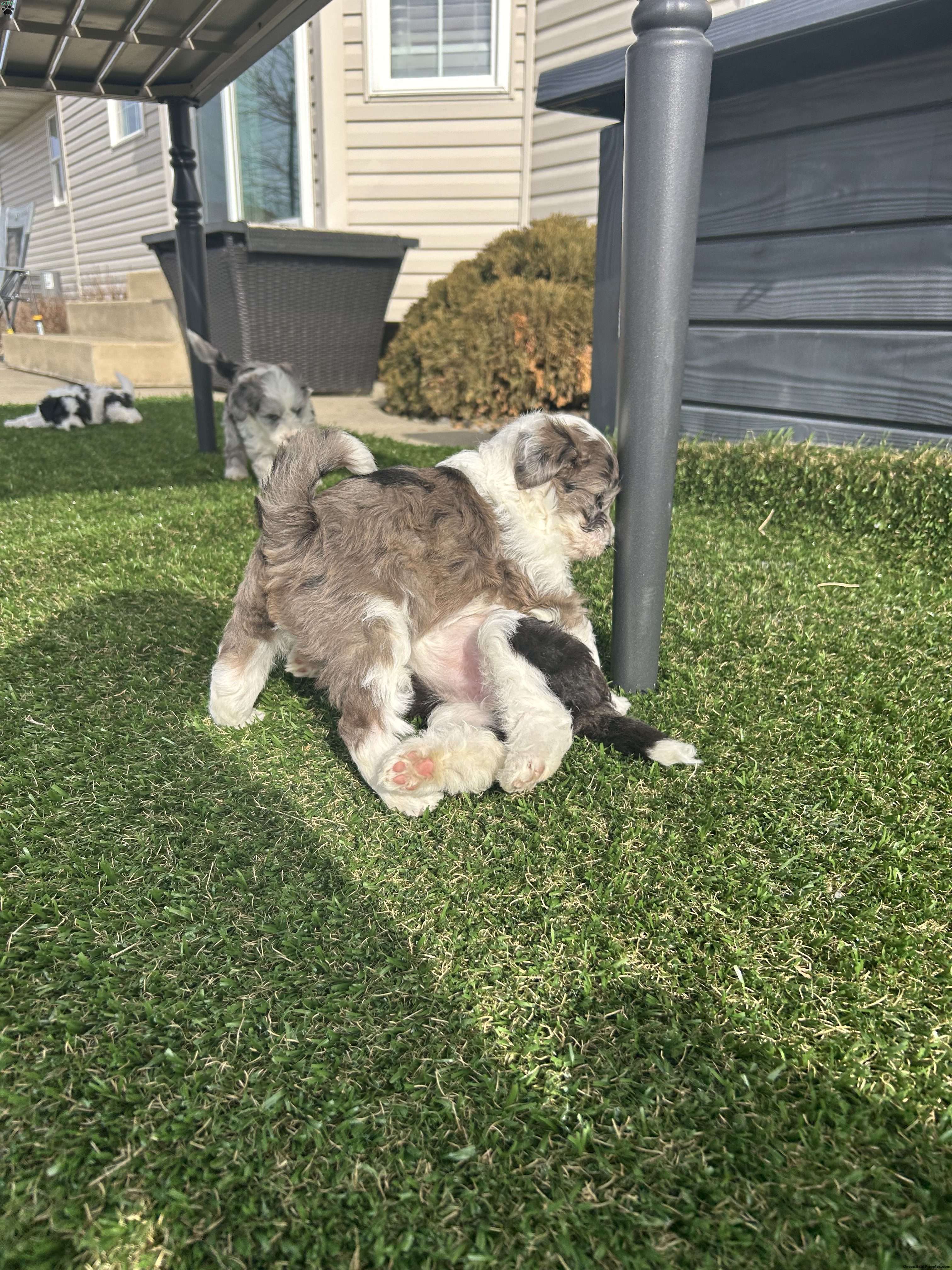 Meet Cash! An Adorable F1B Mini Sheepadoodle. Which means he is 25% english sheepdog And 75% Mini toy poodle. This gives them the big dog mantality (less barking, more mature, And they are more hypoallergenic) in a smaller dog. Cash is very playful and friendly has a beautiful blue merle coat. Our kids play with him daily. Cash is being raised in a single pet family home with his siblings. He is up to date on all shots and wormer. He will also come with a 30 day health Guarentee. For more information on this cute pup, contact Brenda Weaver to set up a facetime or Zoom call. ( in my husbands opion hes under priced)