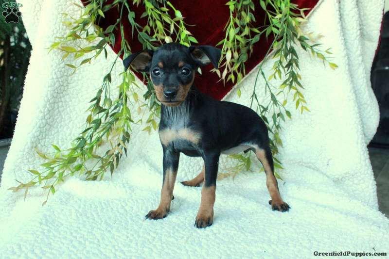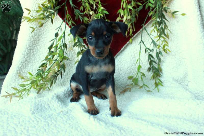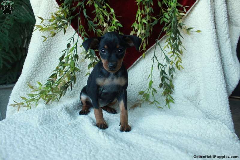 Inez is a cuddly and cute Miniature Pinscher puppy with a gentle disposition. This sweetie is socialized and spending time around children, getting ready for her forever home. Inez has been seen by a vet and is up to date on shots and de-wormer. She also comes home with a health guarantee provided by the breeders.