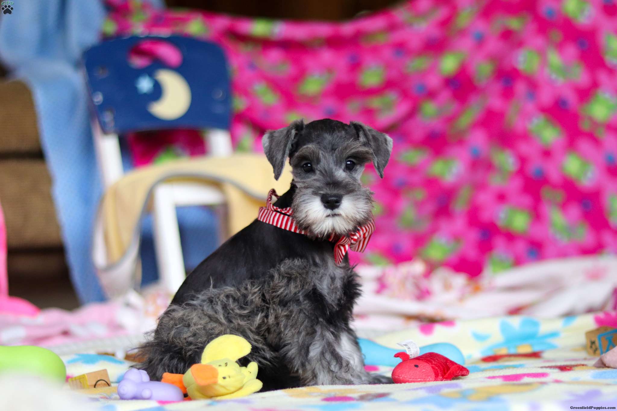 Charity is a sweet little AKC Miniature Schnauzer with a big heart and an even bigger personality. Her soft, shiny coat and bright, twinkling eyes are impossible to resist, and her playful, friendly nature makes her the kind of puppy everyone falls in love with. Charity enjoys exploring new places, playing with her toys, and curling up for cozy naps — the perfect mix of energy and affection.
