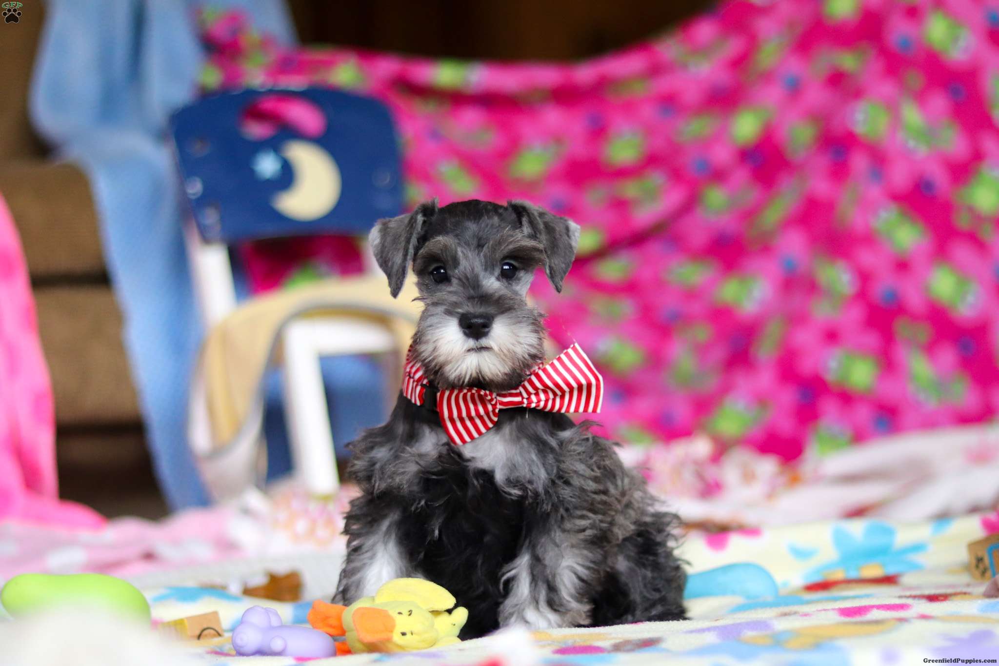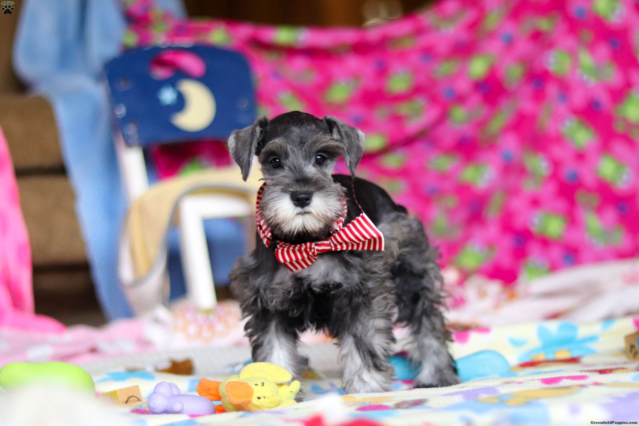 She comes from two wonderful Miniature Schnauzers who make a perfect pair. Her mom, Sydney, is a 14-pound beauty with a gentle heart and loving temperament, while her dad, Maverick, is a 23-pound charmer full of confidence and playful energy. Charity has inherited the best of both — Mom’s sweet nature and Dad’s spirited personality — giving her an ideal balance of cuddly and curious.