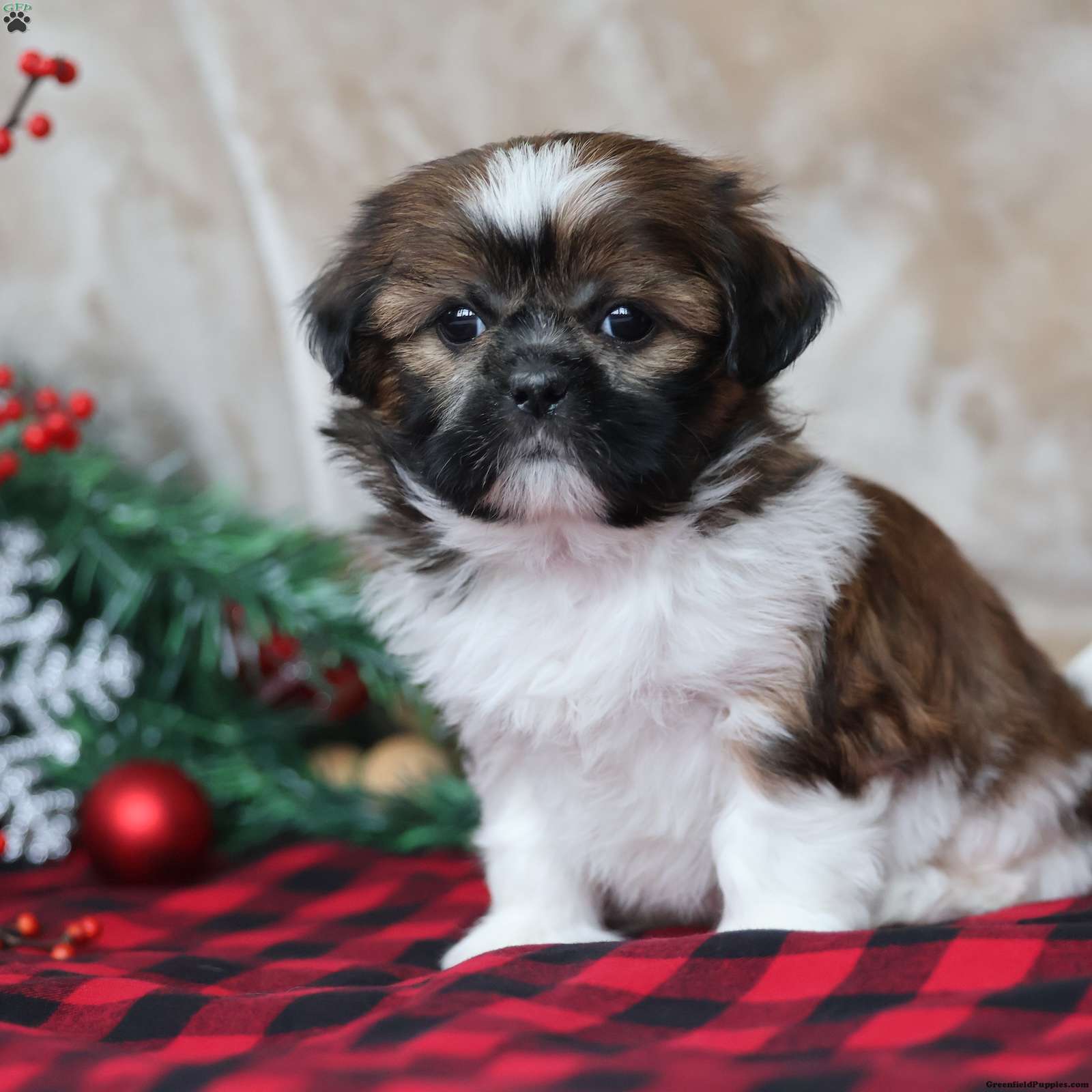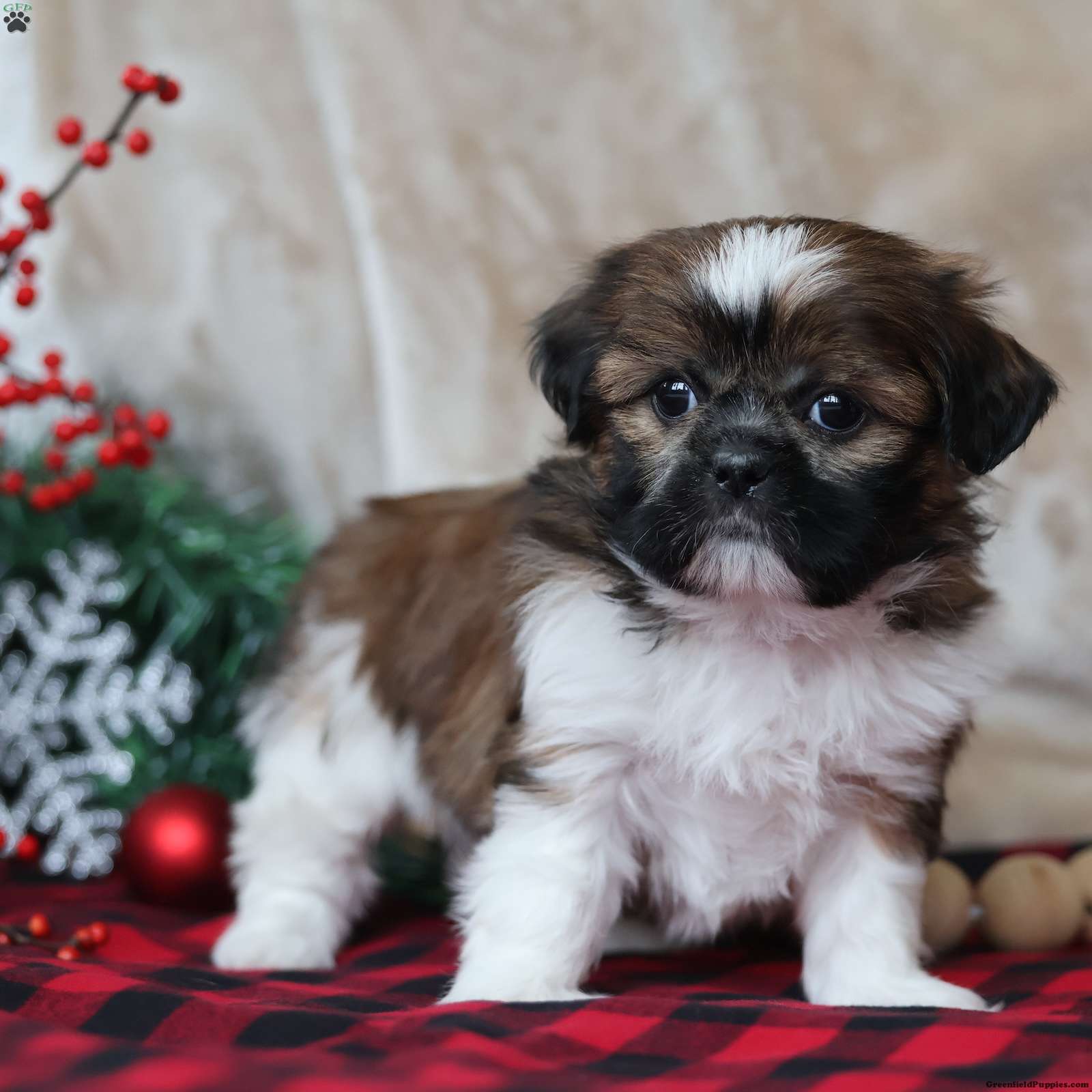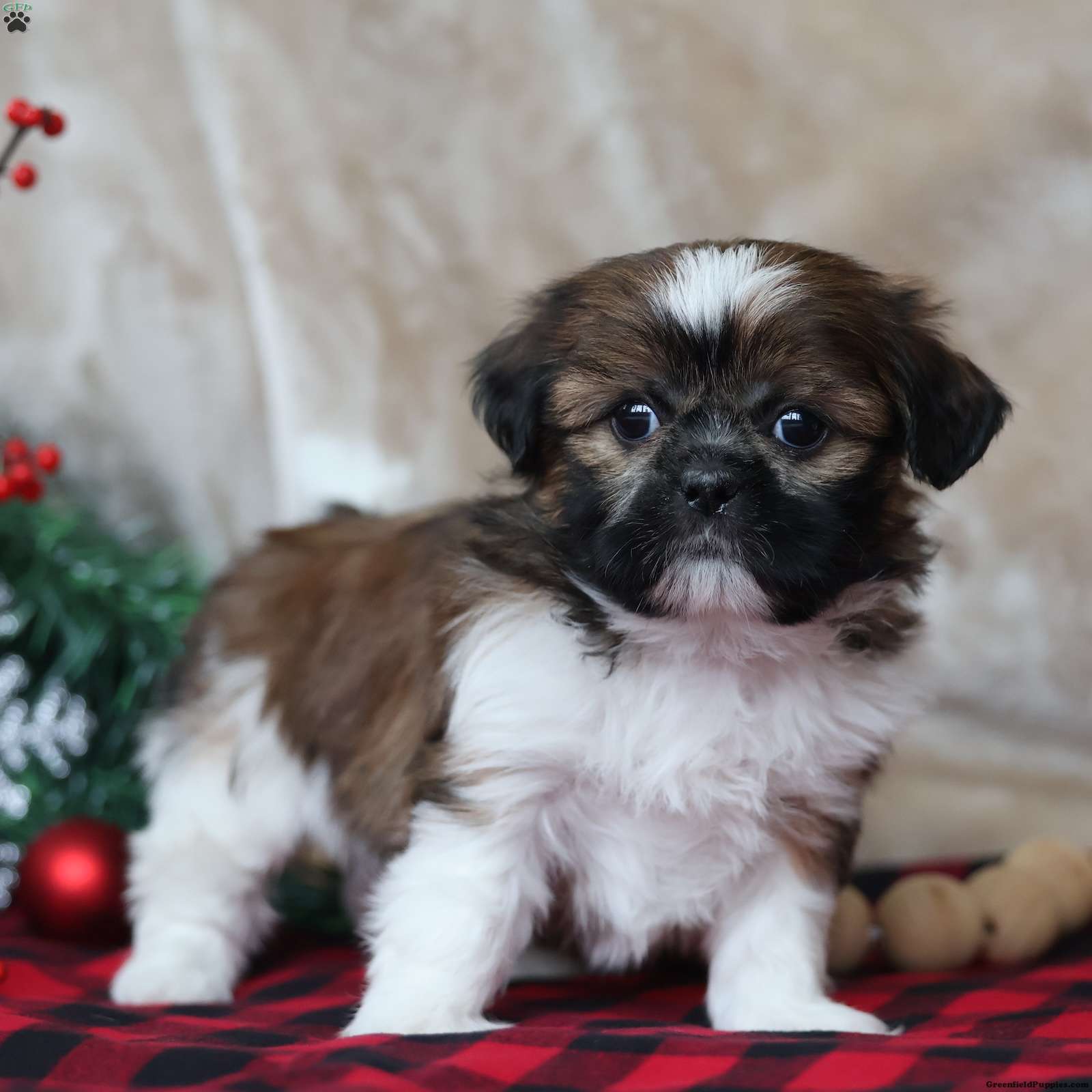 Holly is a stunning Shih Tzu girl with a white, brown, and black coat that looks like it was painted on just for her. Beyond her gorgeous coloring, Holly is a true sweetheart — calm, loving, and deeply people-focused. She enjoys playtime in short, happy bursts, then quickly returns to what she loves most: being near you. Holly is the type who will curl into your arms like she was made for snuggles, and her gentle nature makes her feel like an instant best friend. She has that signature Shih Tzu charm — affectionate, loyal, and emotionally tuned in. Holly is a Puppy Dreams pup through and through: a little holiday treasure ready to fill your home with warmth.